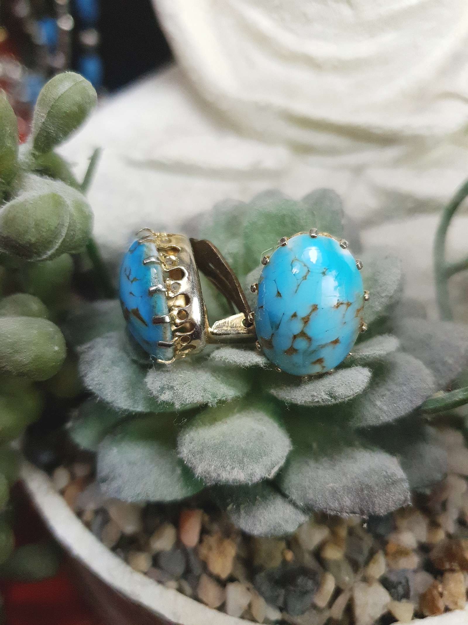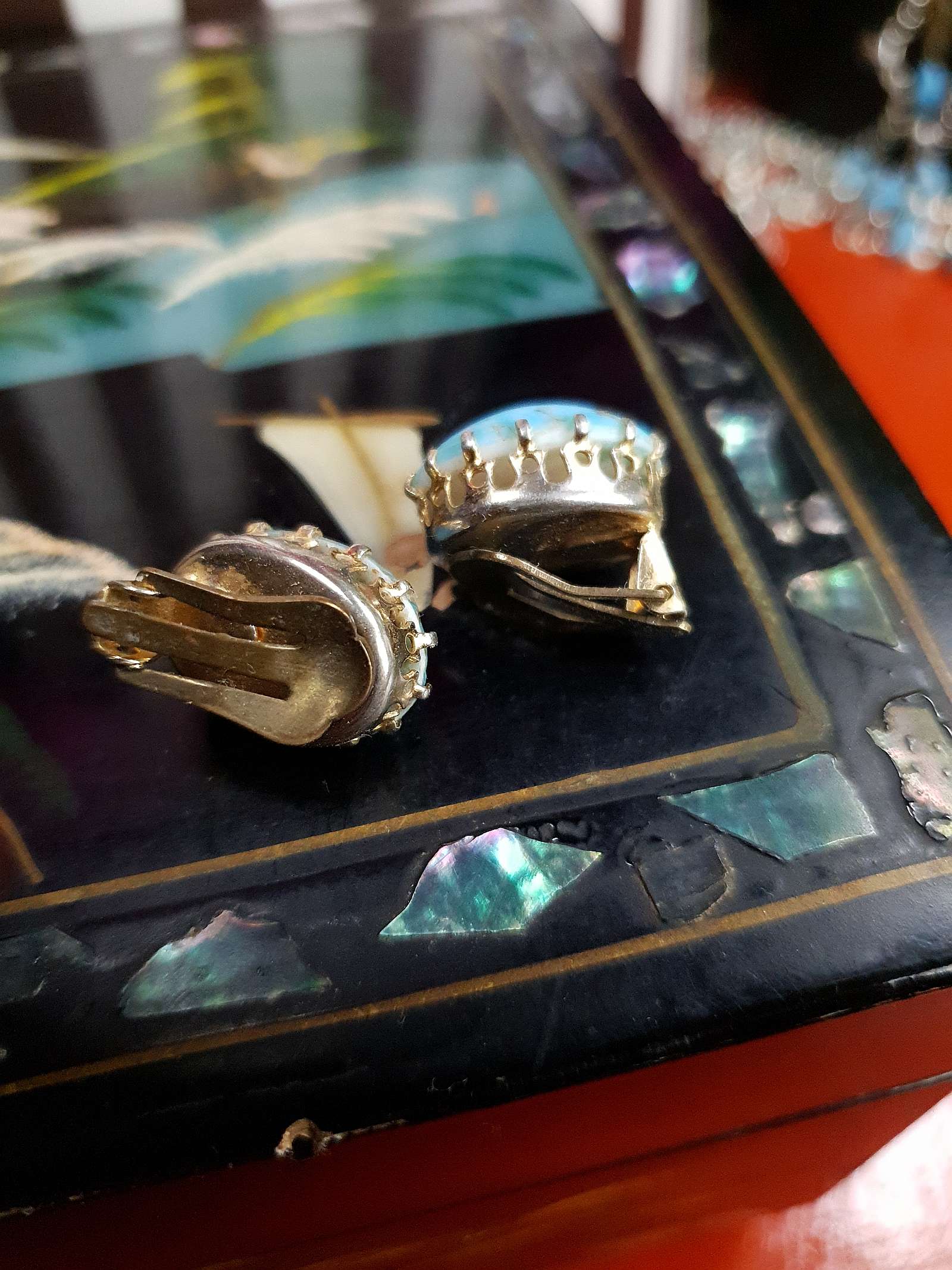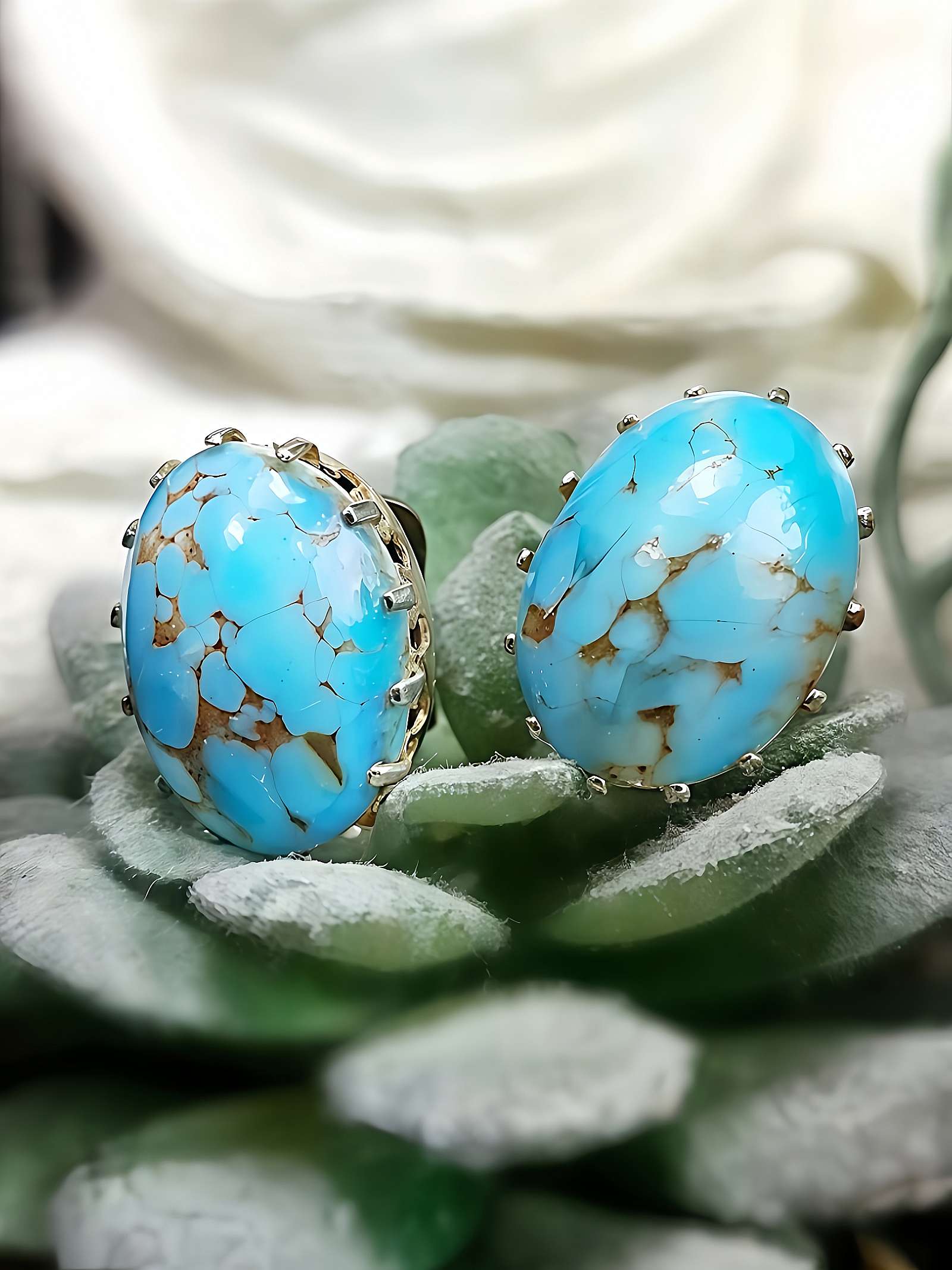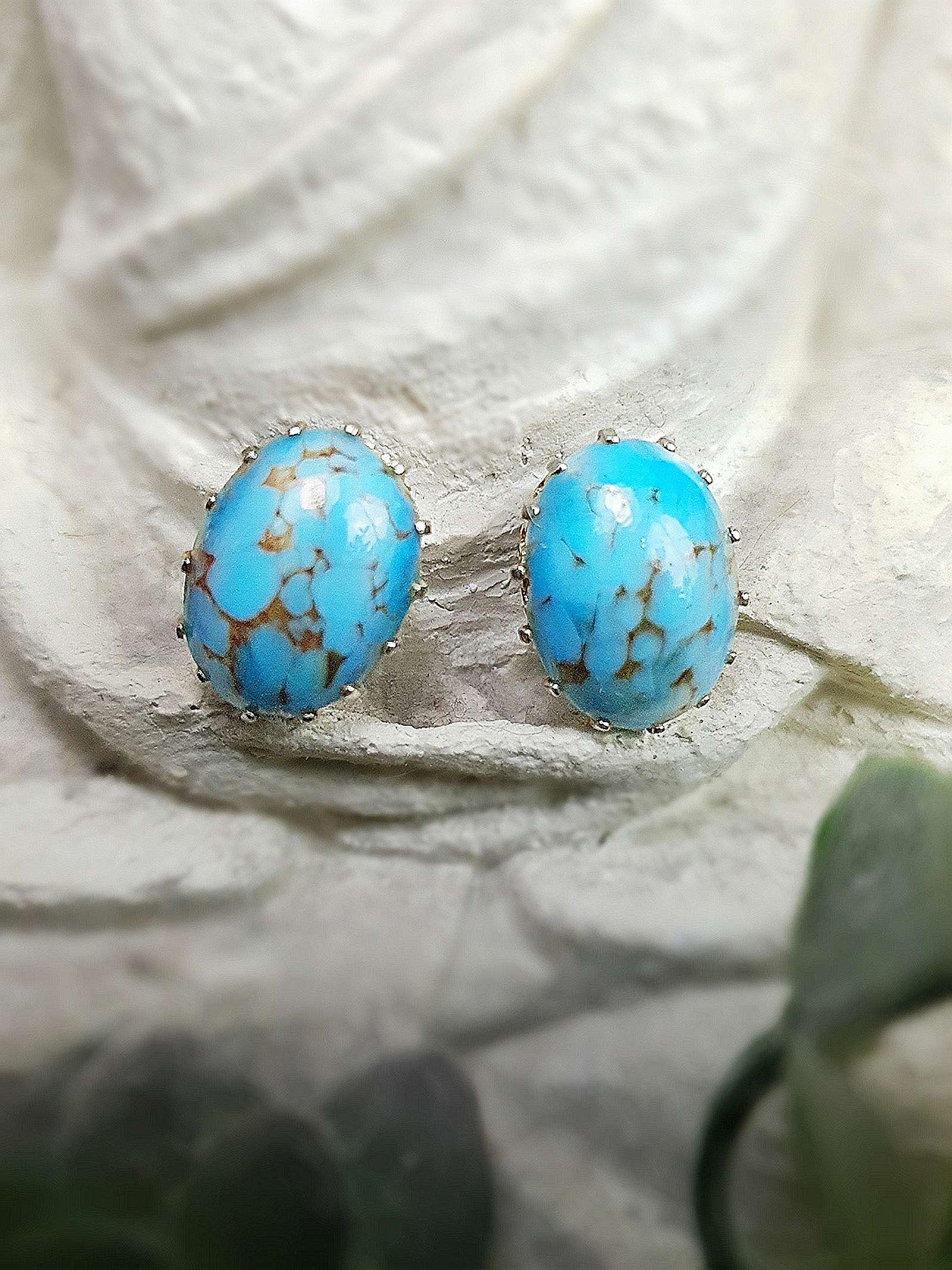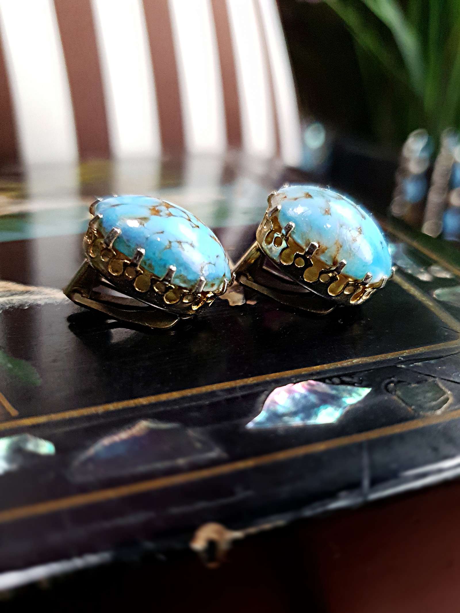 These mid-century vintage earrings feature oval blue ceramic with a marbled pattern of brown veining. Set in gold-tone metal with a crown-like edge, capturing classic style. Clip-on fastenings ensure easy wear for non-pierced ears.