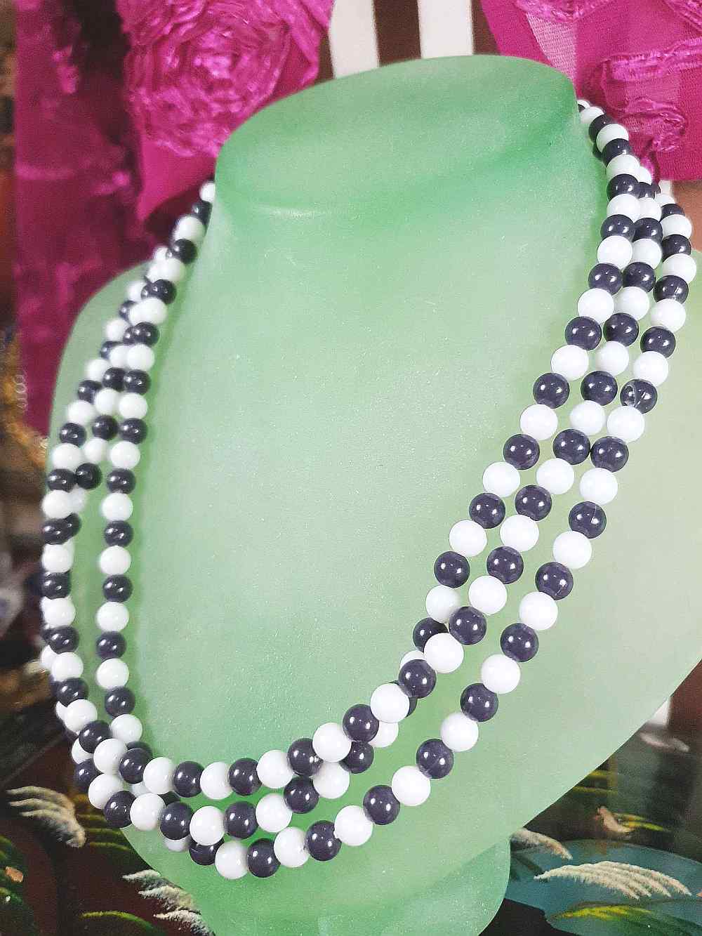 This 1960s necklace features three strands of round plastic beads in white and muted navy blue. The alternating pattern creates a bold contrast, capturing the era’s iconic style. Perfect for vintage jewellery collectors seeking authentic pieces. Brass spring ring clasp fastening.