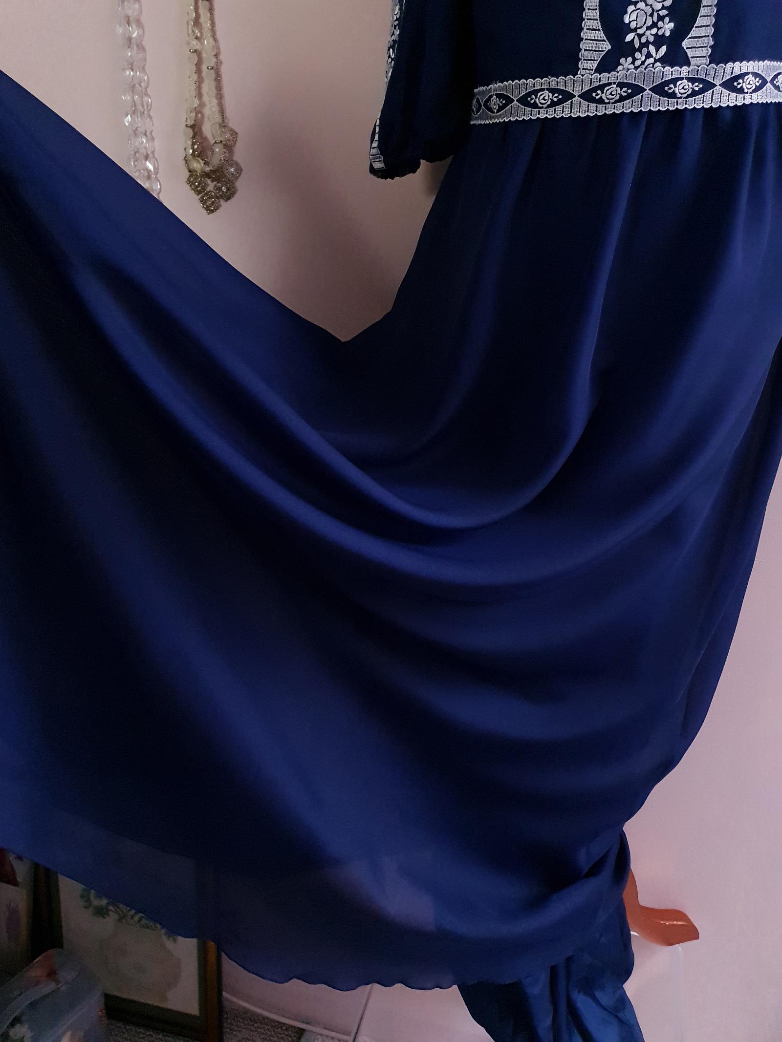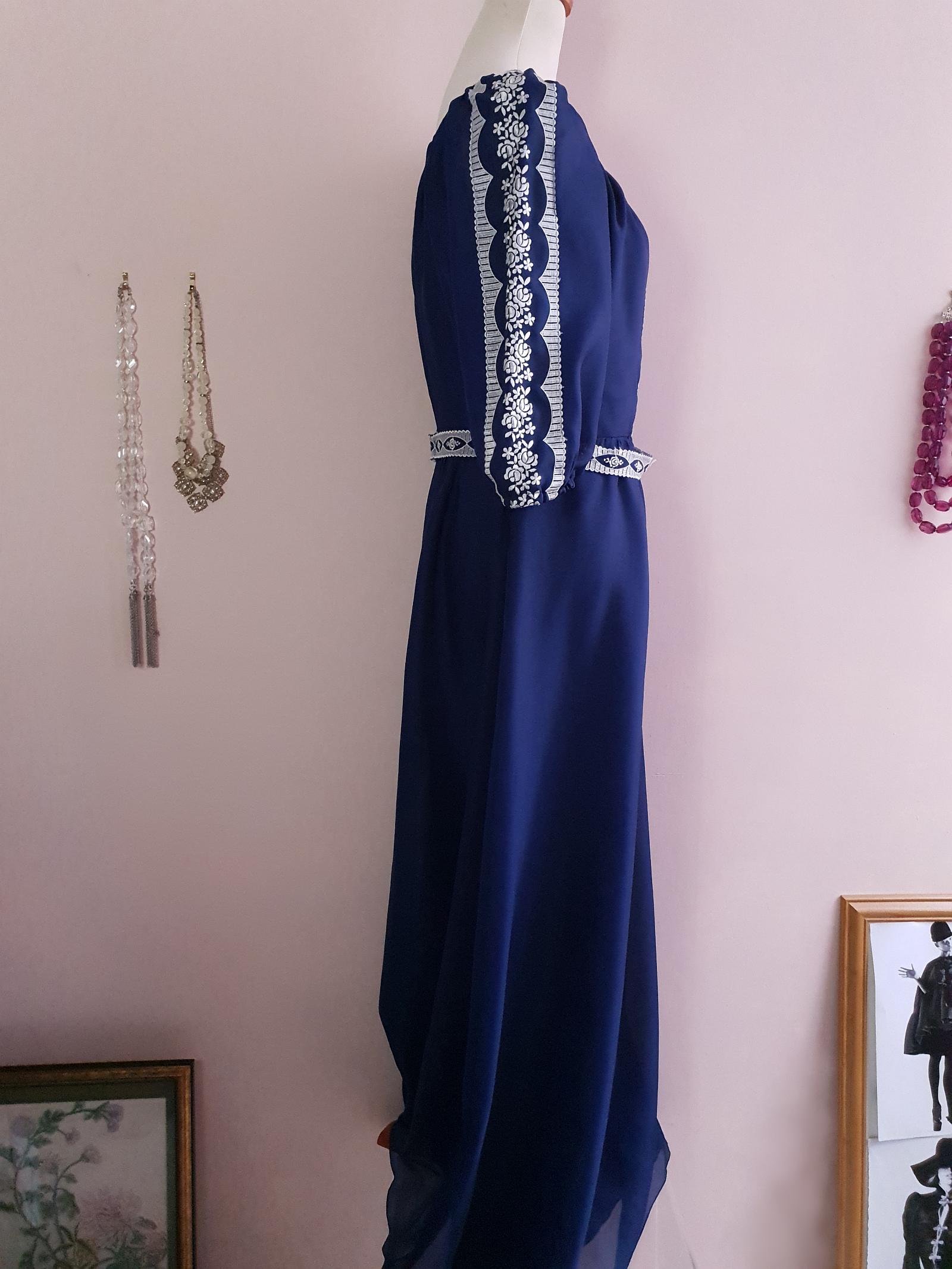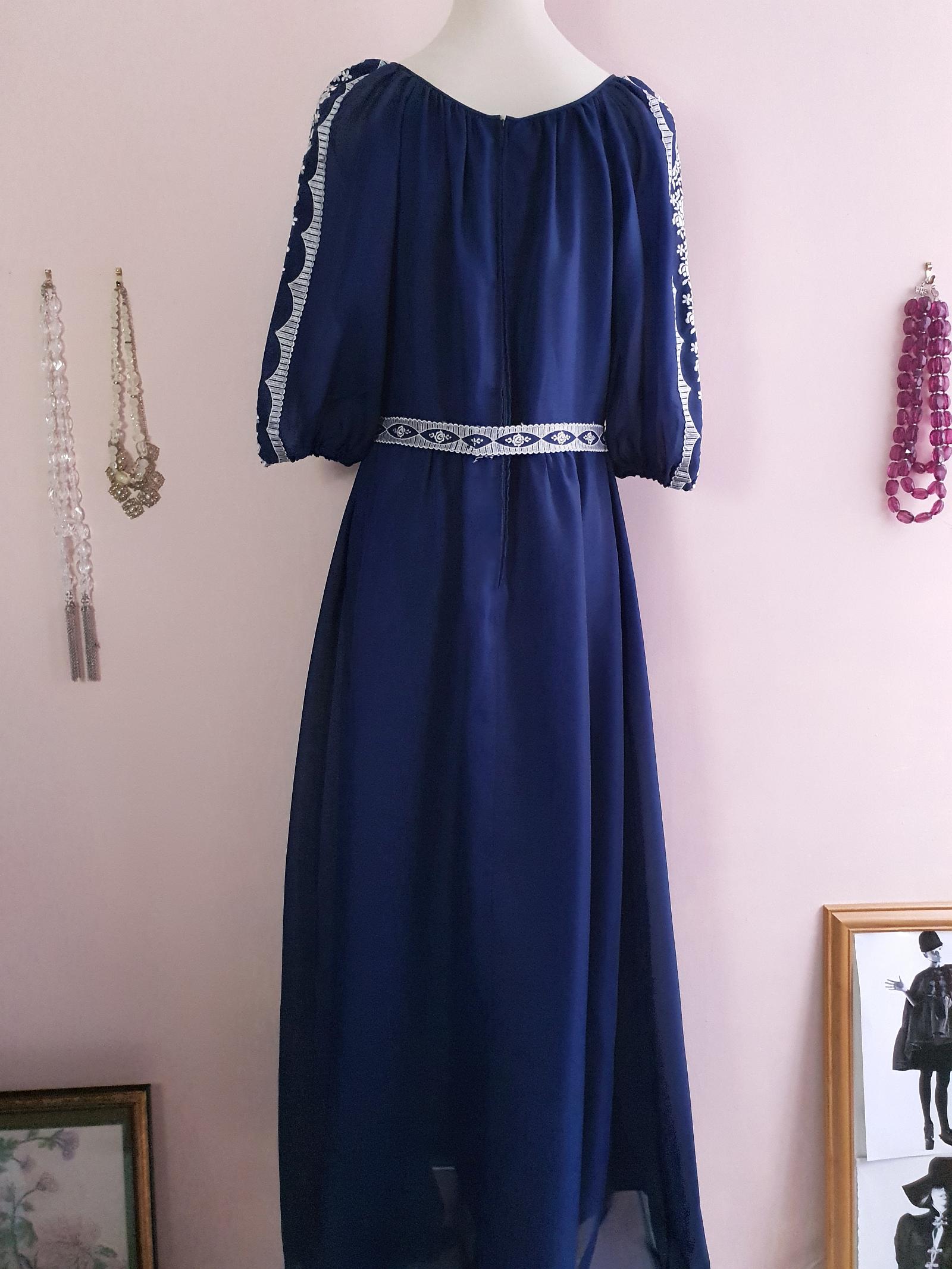 This lovely bohemian maxi dress from the 70s is made from chiffon fabric in a deep rich navy blue hue, providing an airy, lightweight fit. A white embroidered floral panel decorates the front and on the semi-sheer chiffon puff sleeves. Matching floral belt.