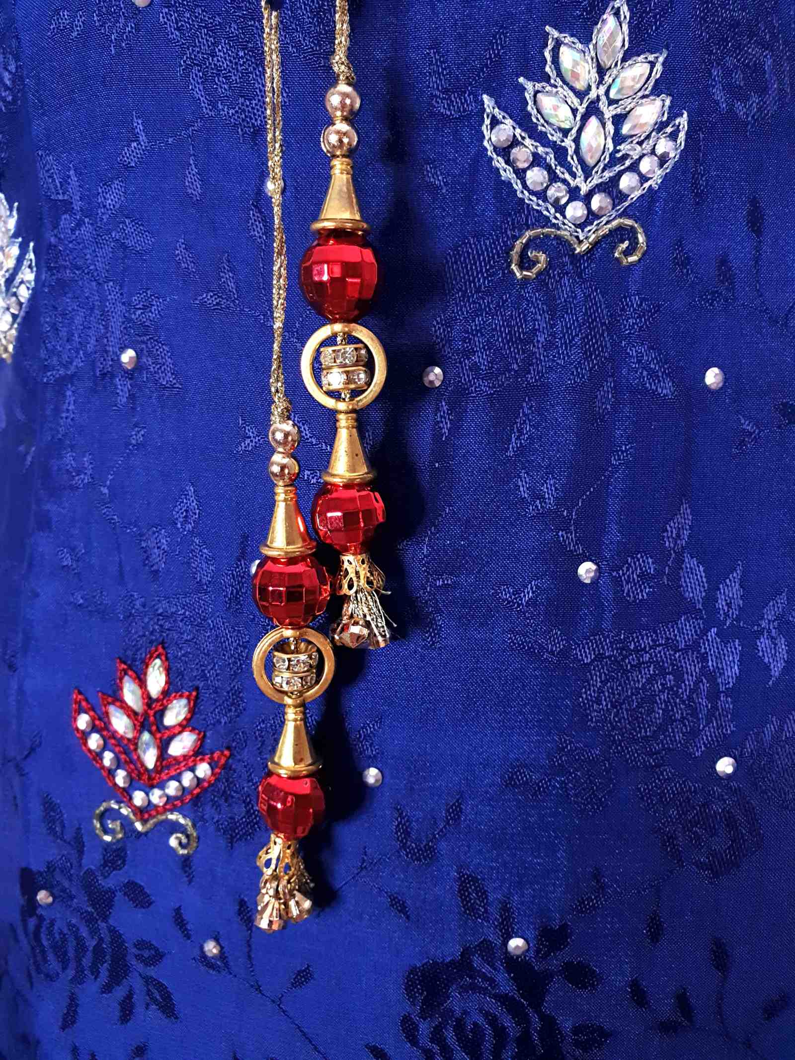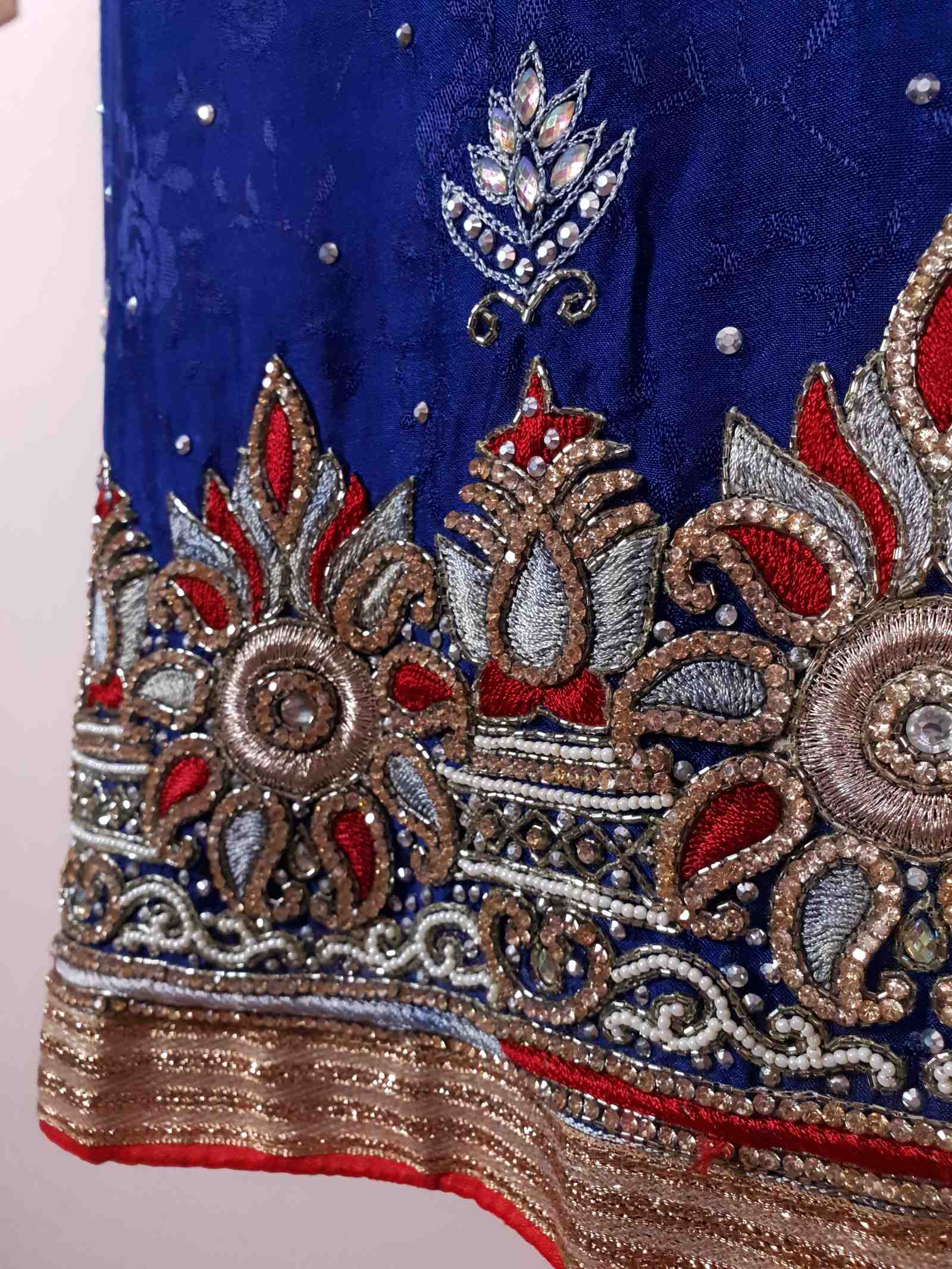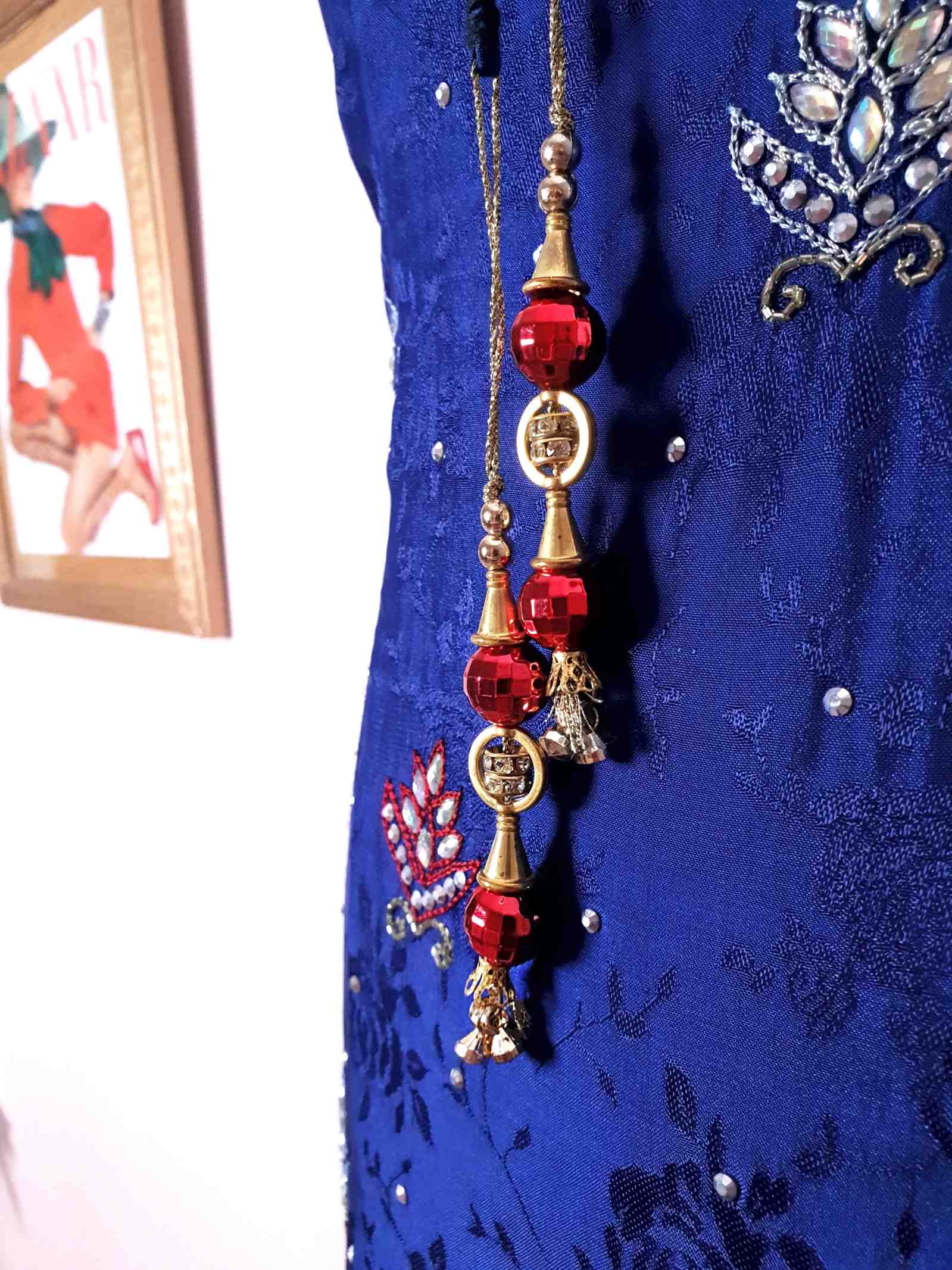 This stunning 70s vintage kaftan dress is truly special. Crafted from rich purple silk, it features an intricate array of pale gold rhinestones with red, silver, and pale gold embroidery, finished with a gold and red band on the hem. The two ties each feature pendants of red faceted beads, rhinestones, and gild accents for a truly luxurious finish. The ties can be worn in various ways. Back zip closure.