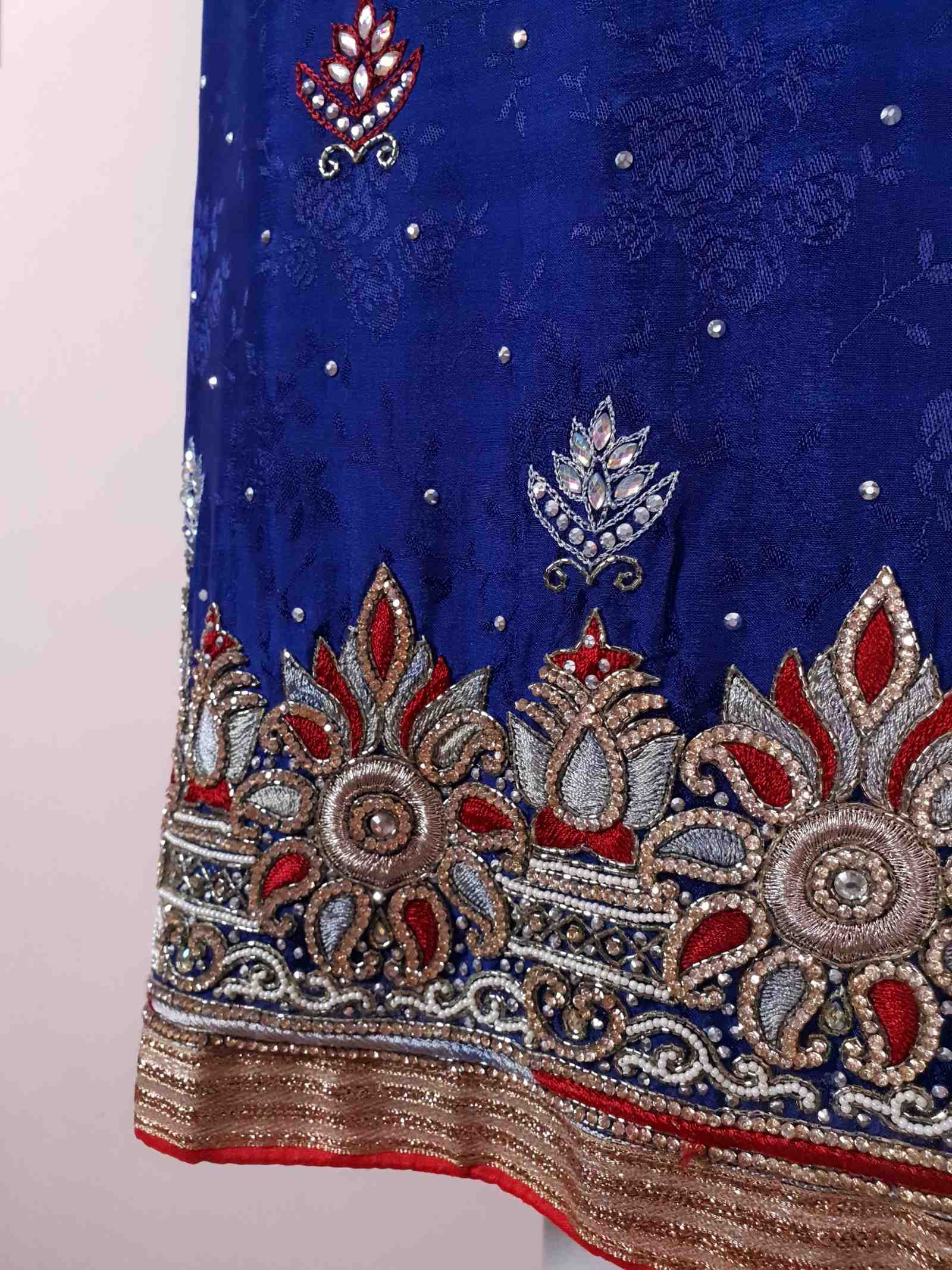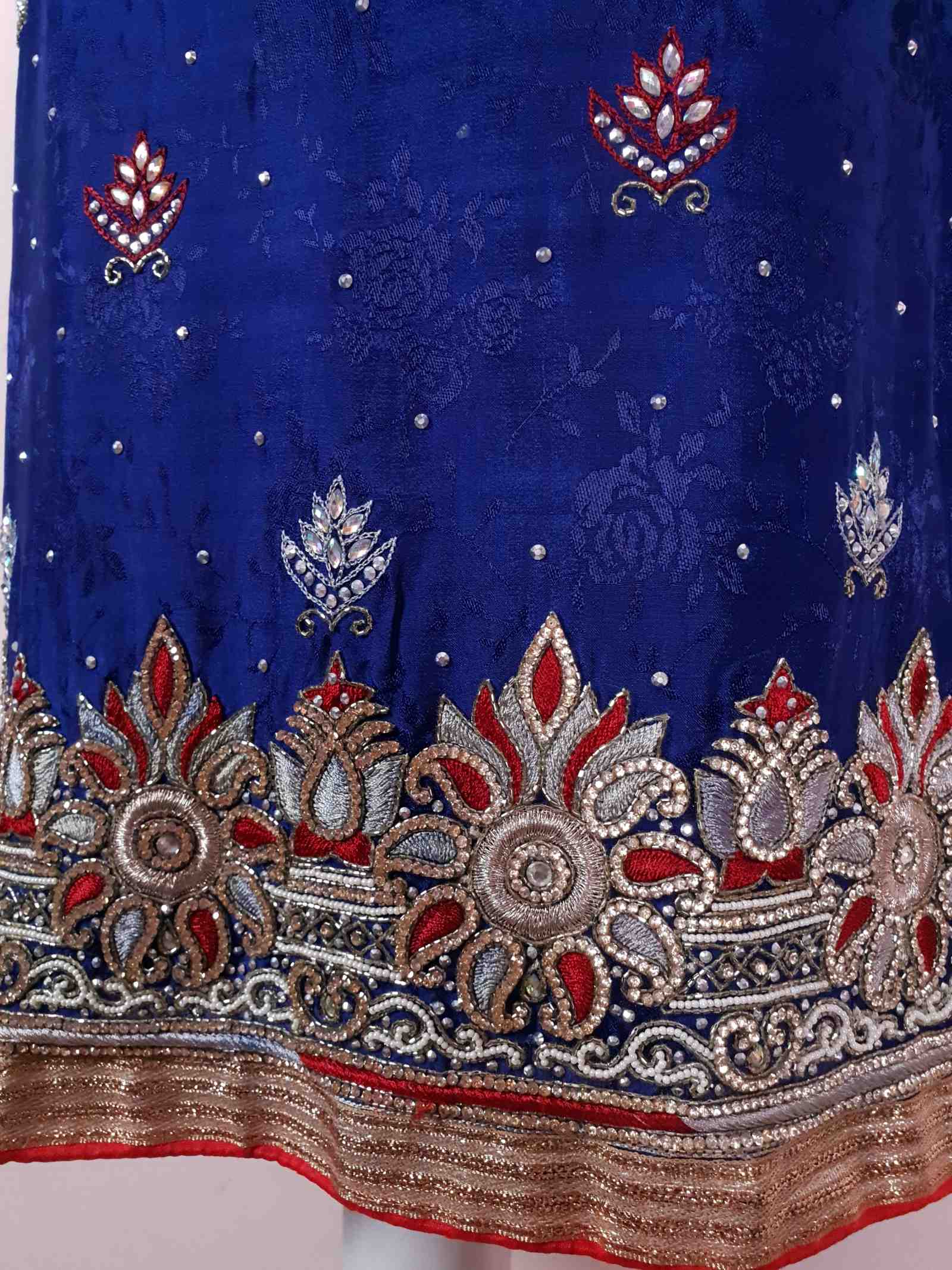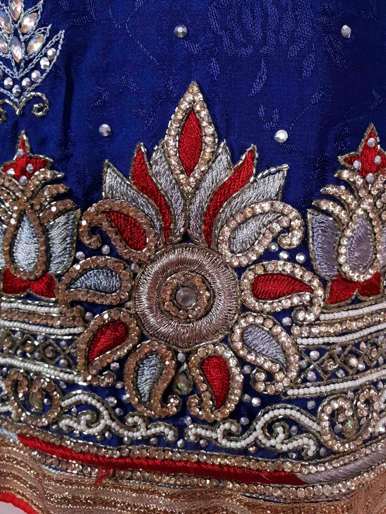 This stunning 70s vintage kaftan dress is truly special. Crafted from rich purple silk, it features an intricate array of pale gold rhinestones with red, silver, and pale gold embroidery, finished with a gold and red band on the hem. The two ties each feature pendants of red faceted beads, rhinestones, and gild accents for a truly luxurious finish. The ties can be worn in various ways. Back zip closure.