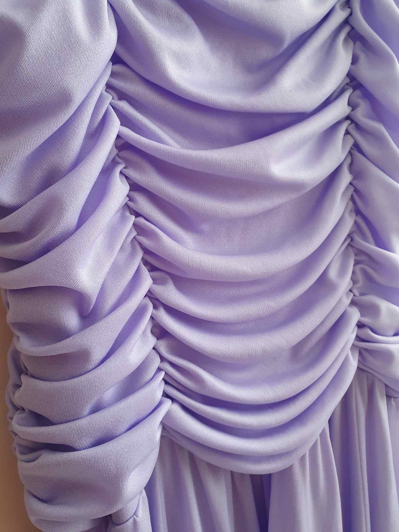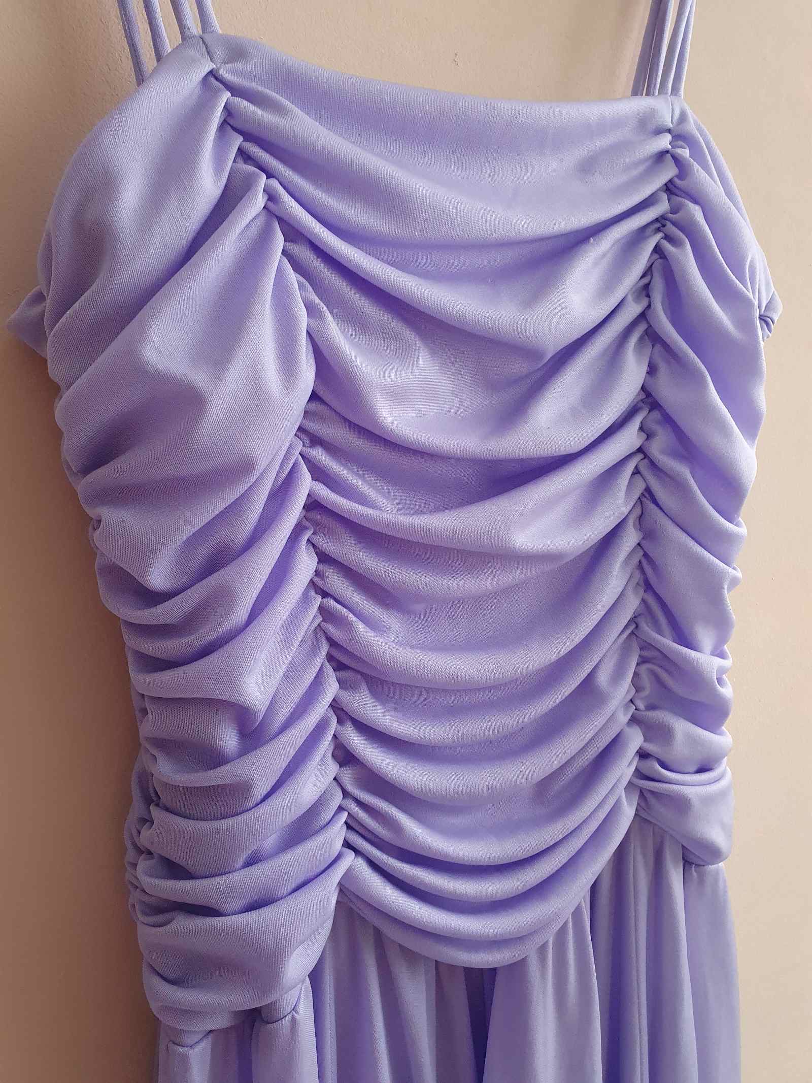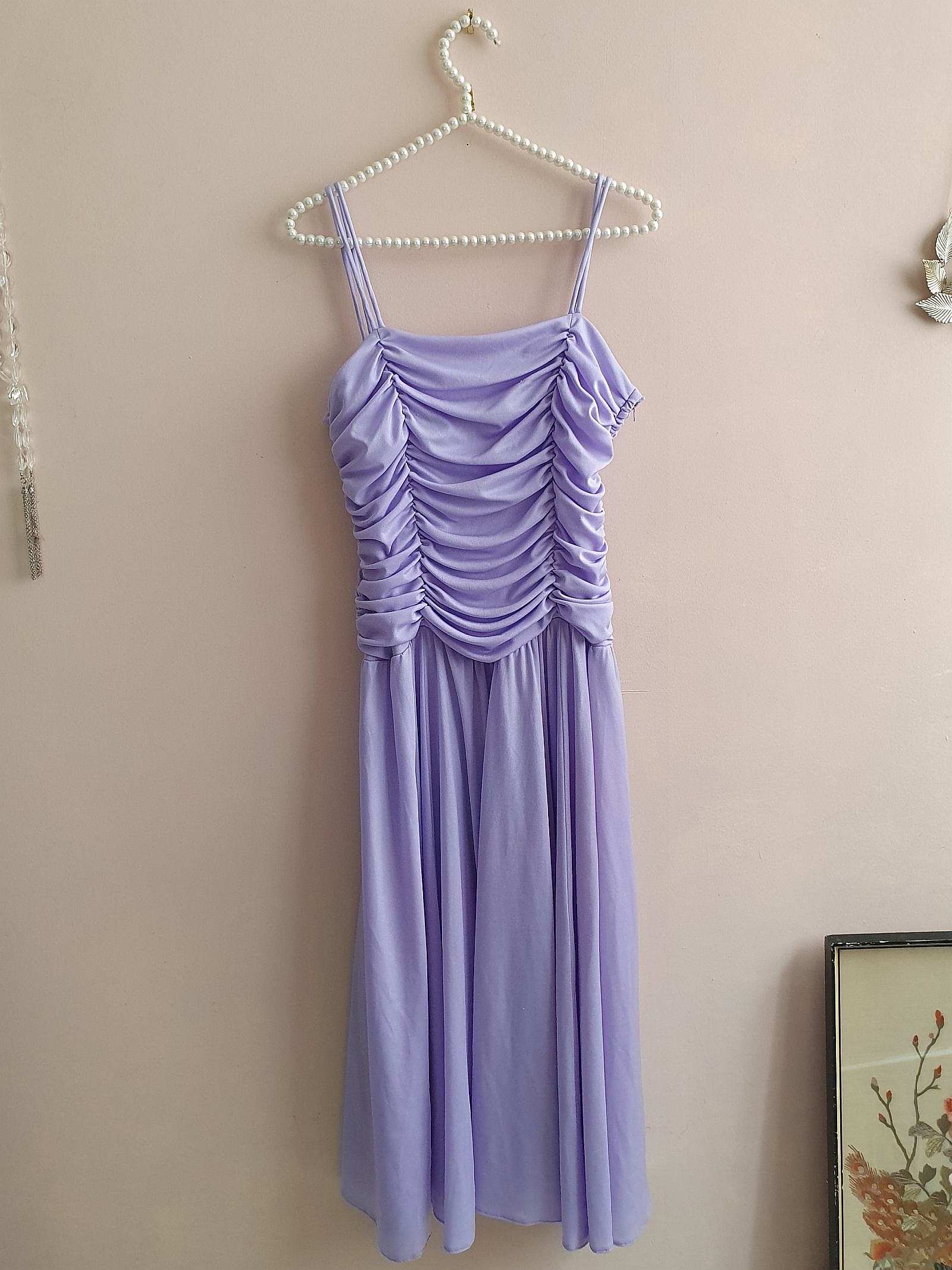 This lovely 70s vintage pale lilac ruched swirl dress features a double spaghetti strap feature, side zip closure, and glamorous draped ruching to the top leading to the full and twirly bottom half of the dress.