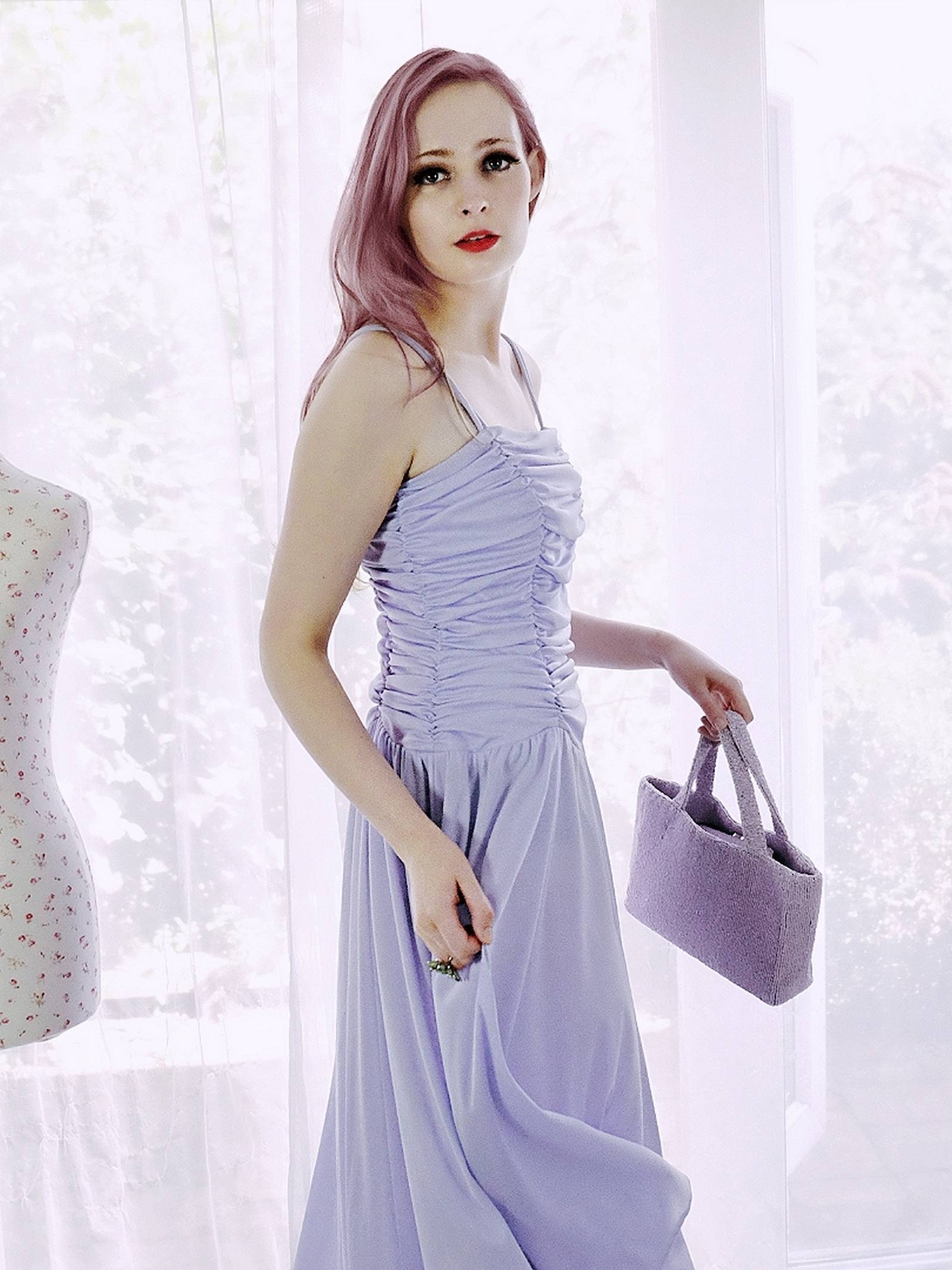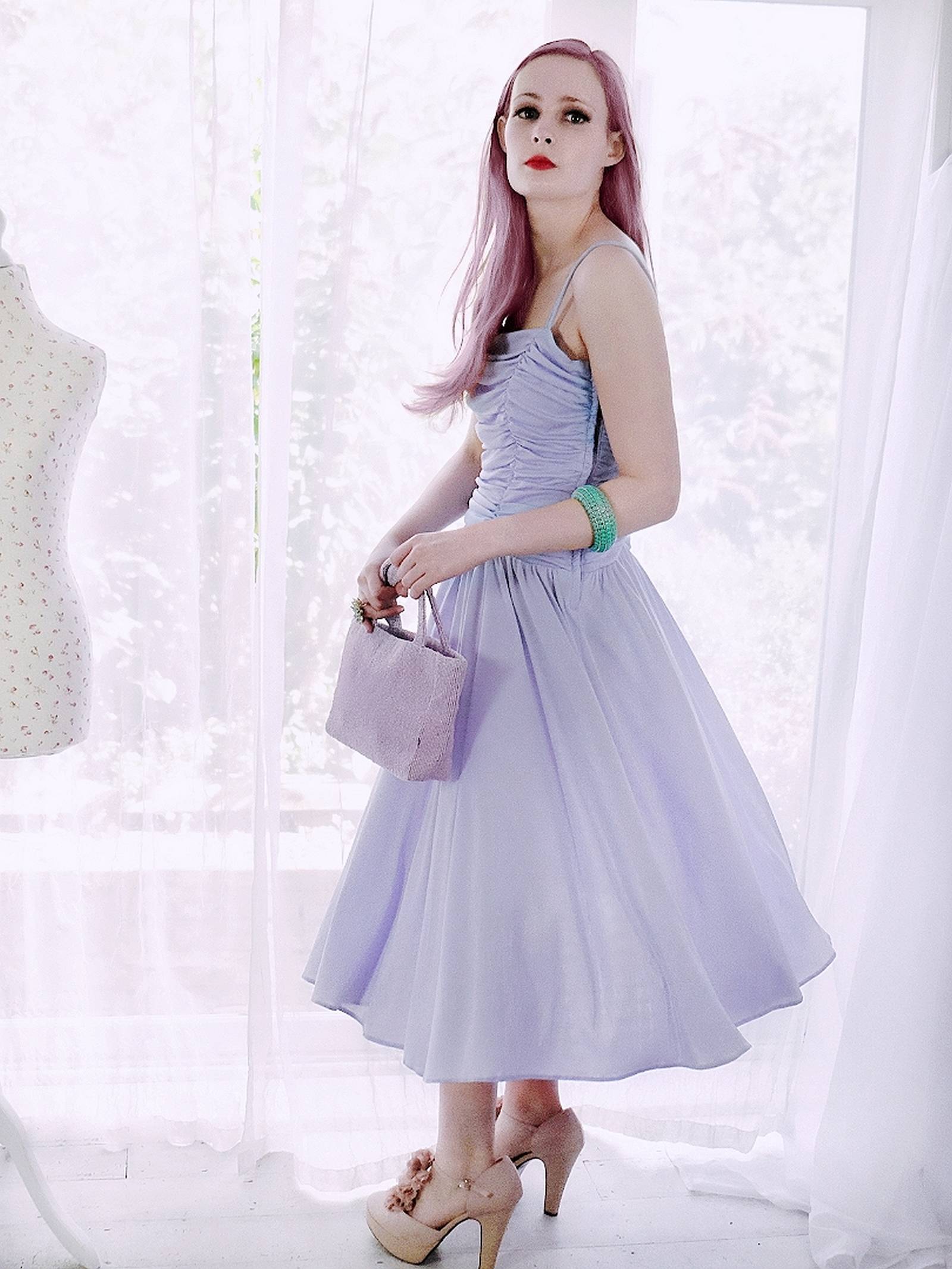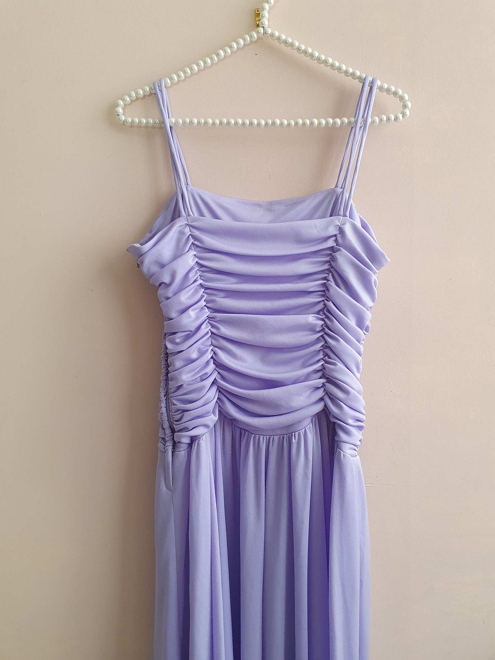 This lovely 70s vintage pale lilac ruched swirl dress features a double spaghetti strap feature, side zip closure, and glamorous draped ruching to the top leading to the full and twirly bottom half of the dress.