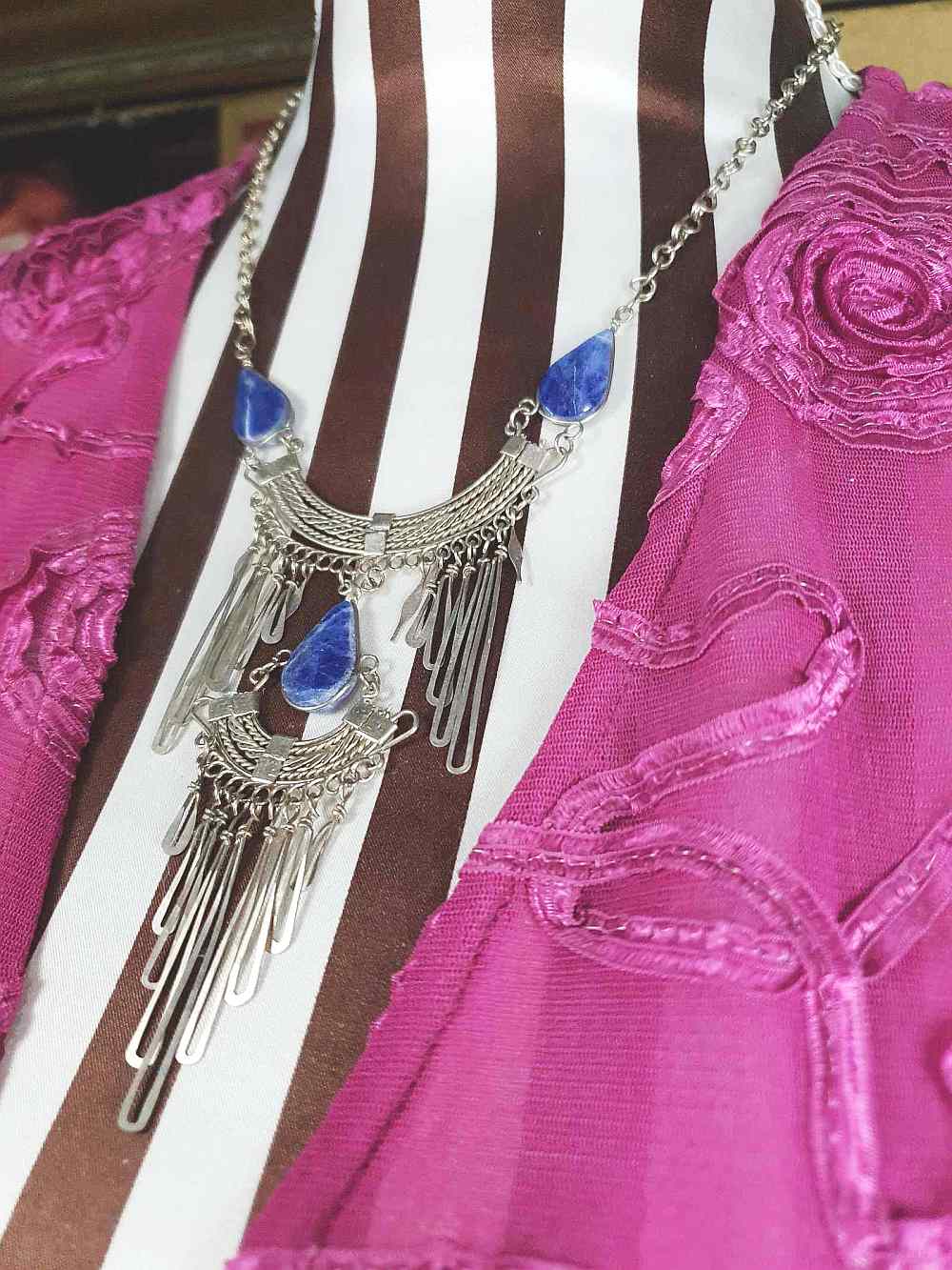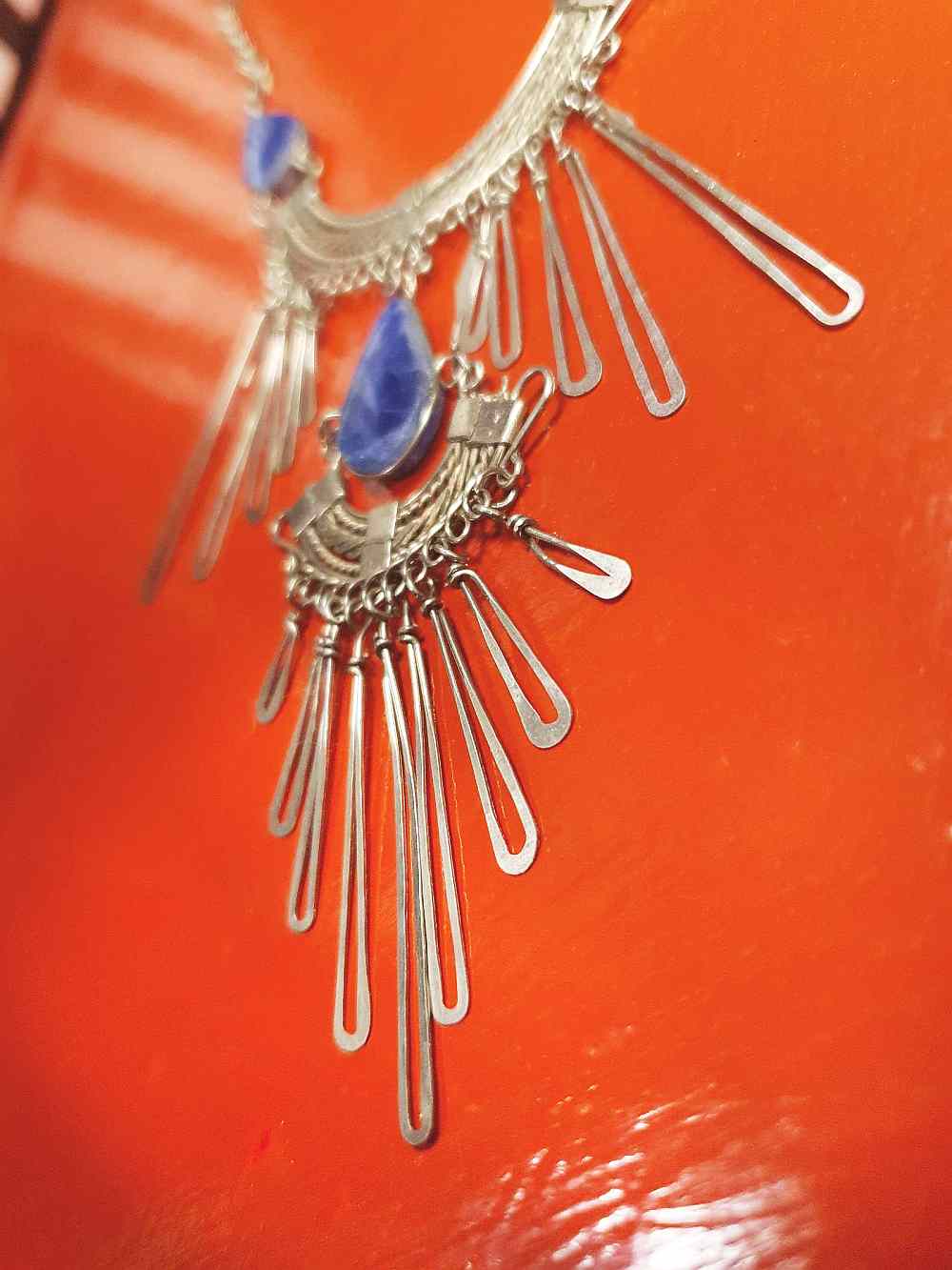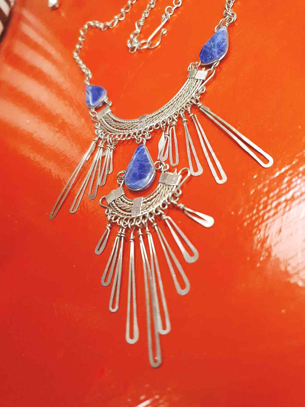 This 80s vintage bib necklace showcases silver-tone metal with teardrop-shaped sodalite gemstones, designed in a layered bohemian style with elongated tapered oval metal pendants suspended from a belcher link chain. Hook fastening.