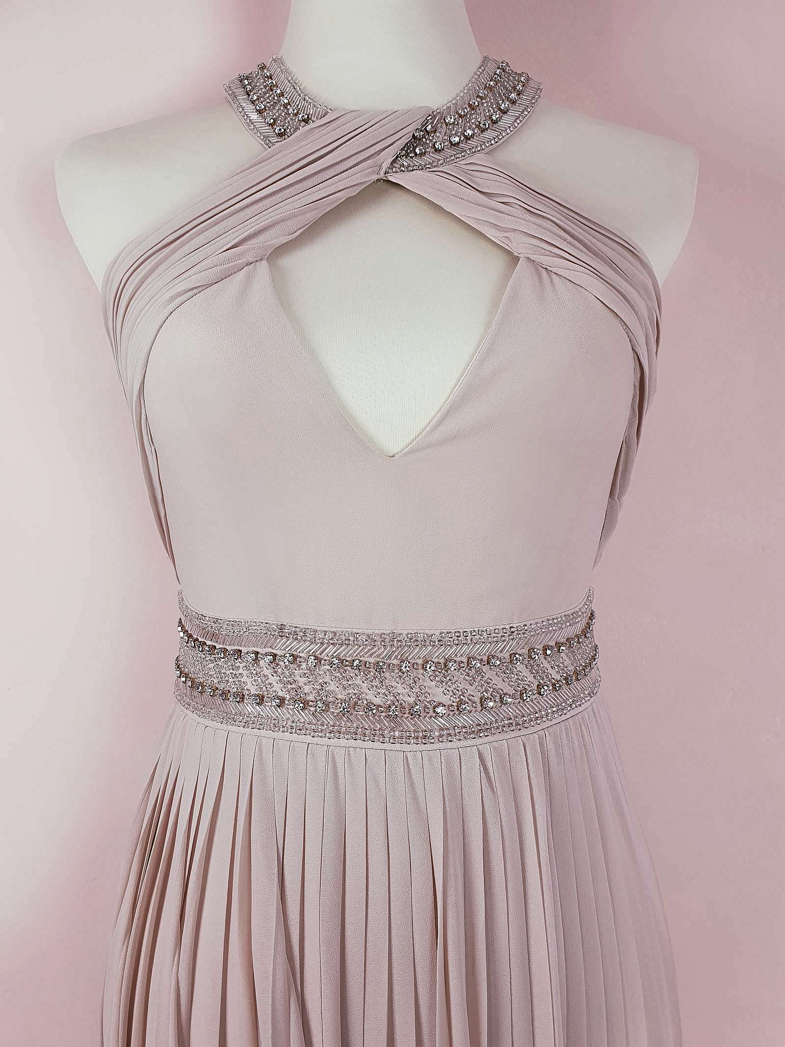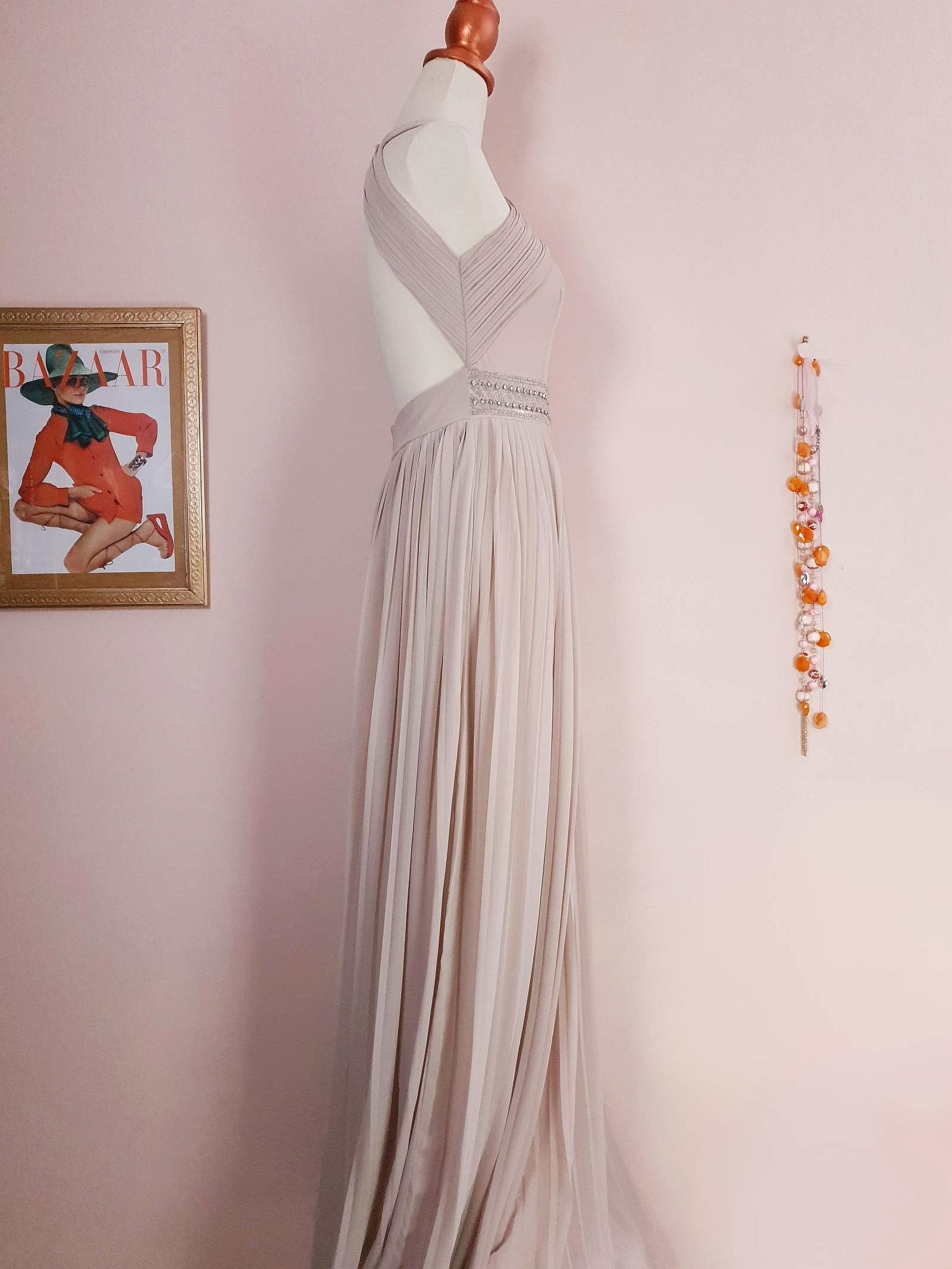 This beautiful 90s vintage evening dress in a soft beige chiffon is styled with a sleeveless and open back. The cross-halter neckline and waistband are embellished with beading and shimmering rhinestones. Fully lined with a pleated chiffon overlay on the flowing skirt. Secured with a back zip and a fabric button closure at the nape.
