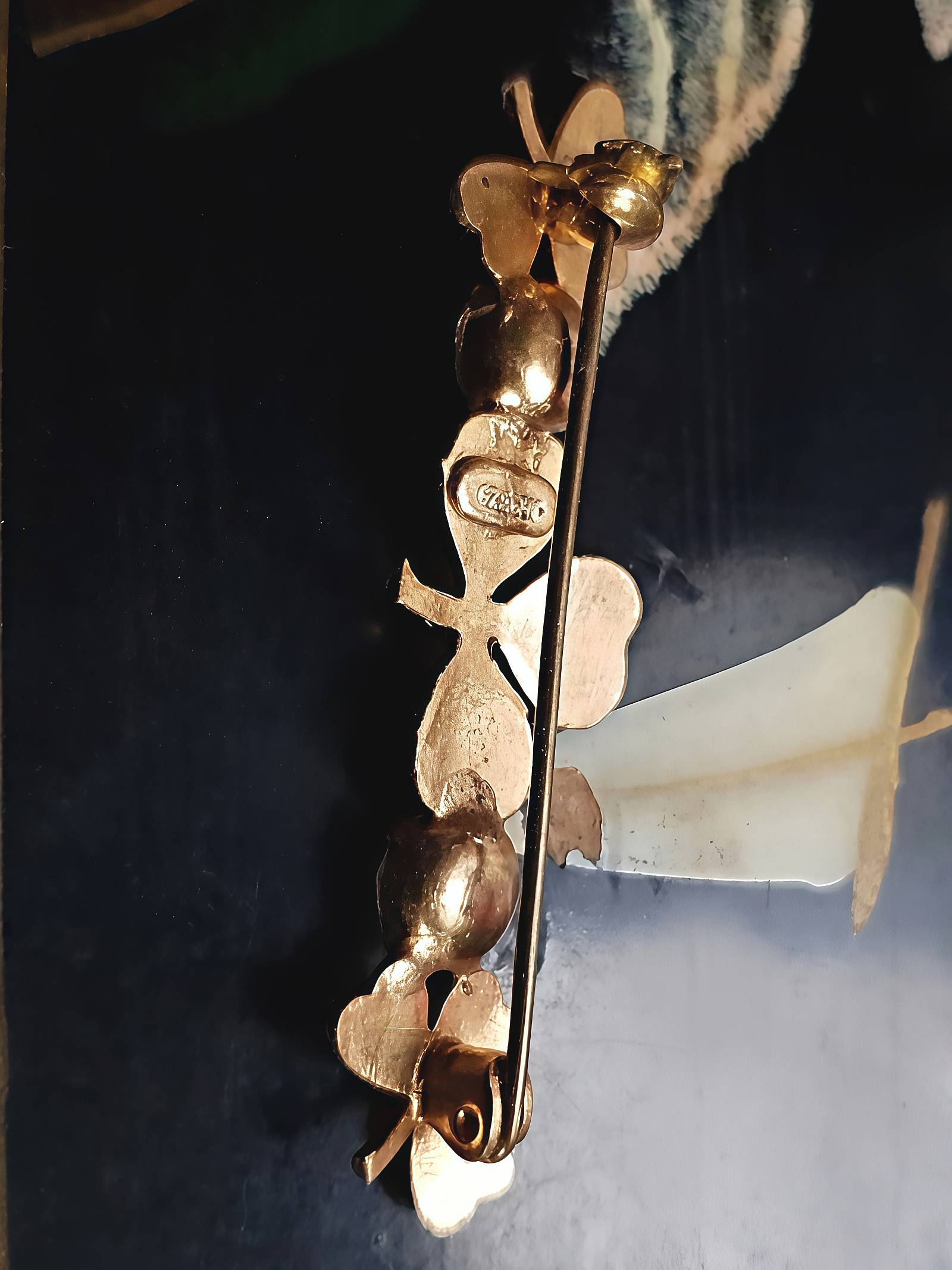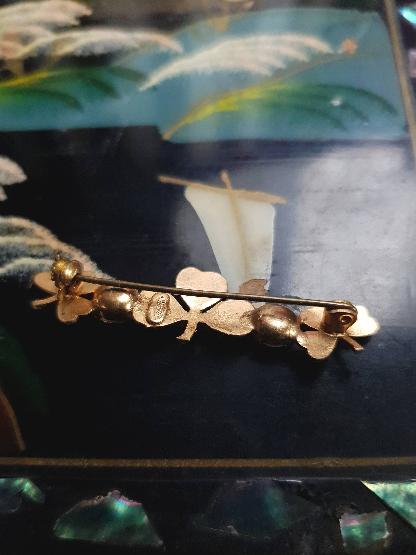 This small, dainty 50s vintage brooch has a gold-tone metal base with three clover shapes. Each clover is accented with green enamel, enhanced by two sparkly clear glass rhinestones. Signed Czecho on the back and secured with a safety clasp.