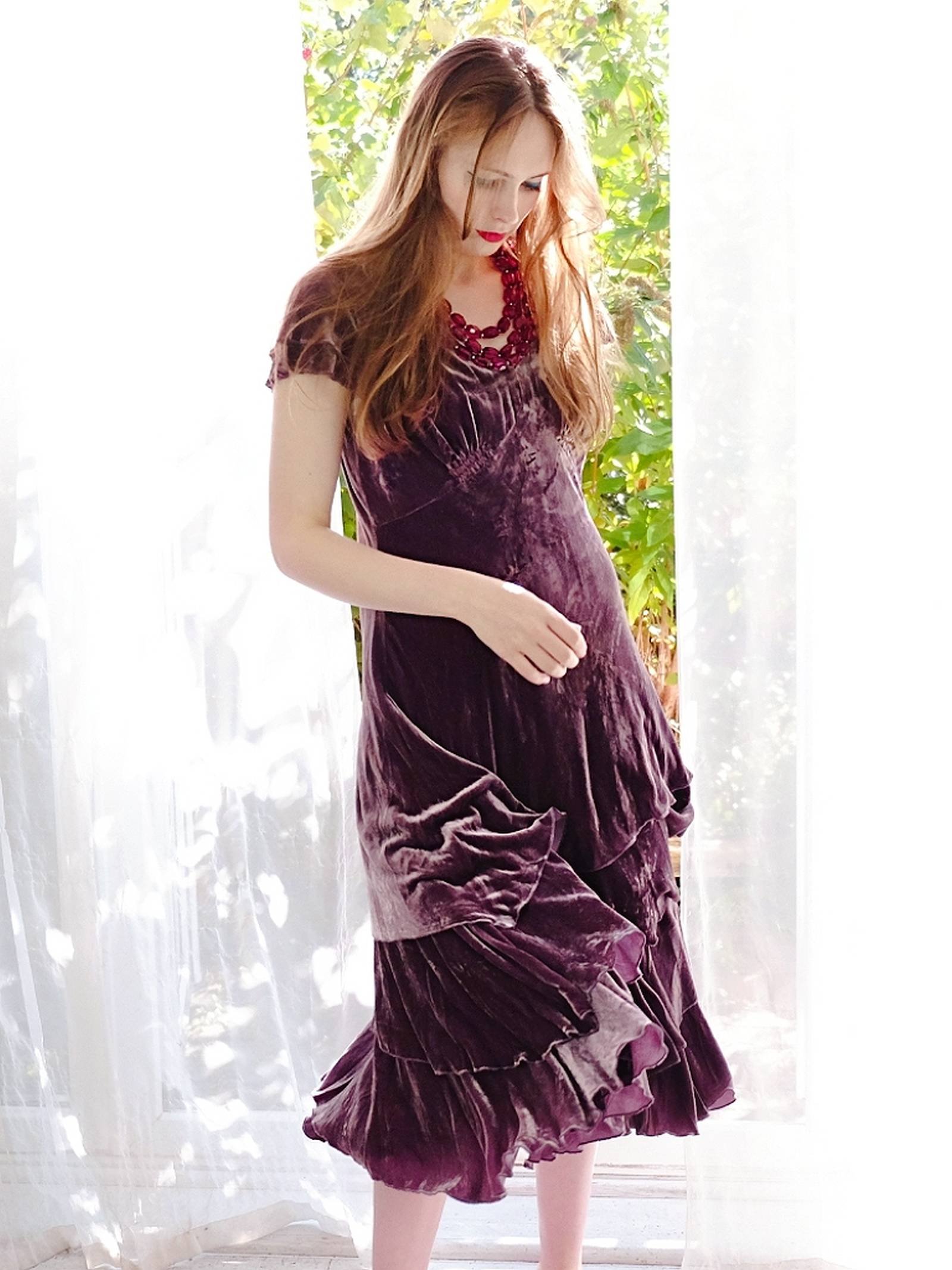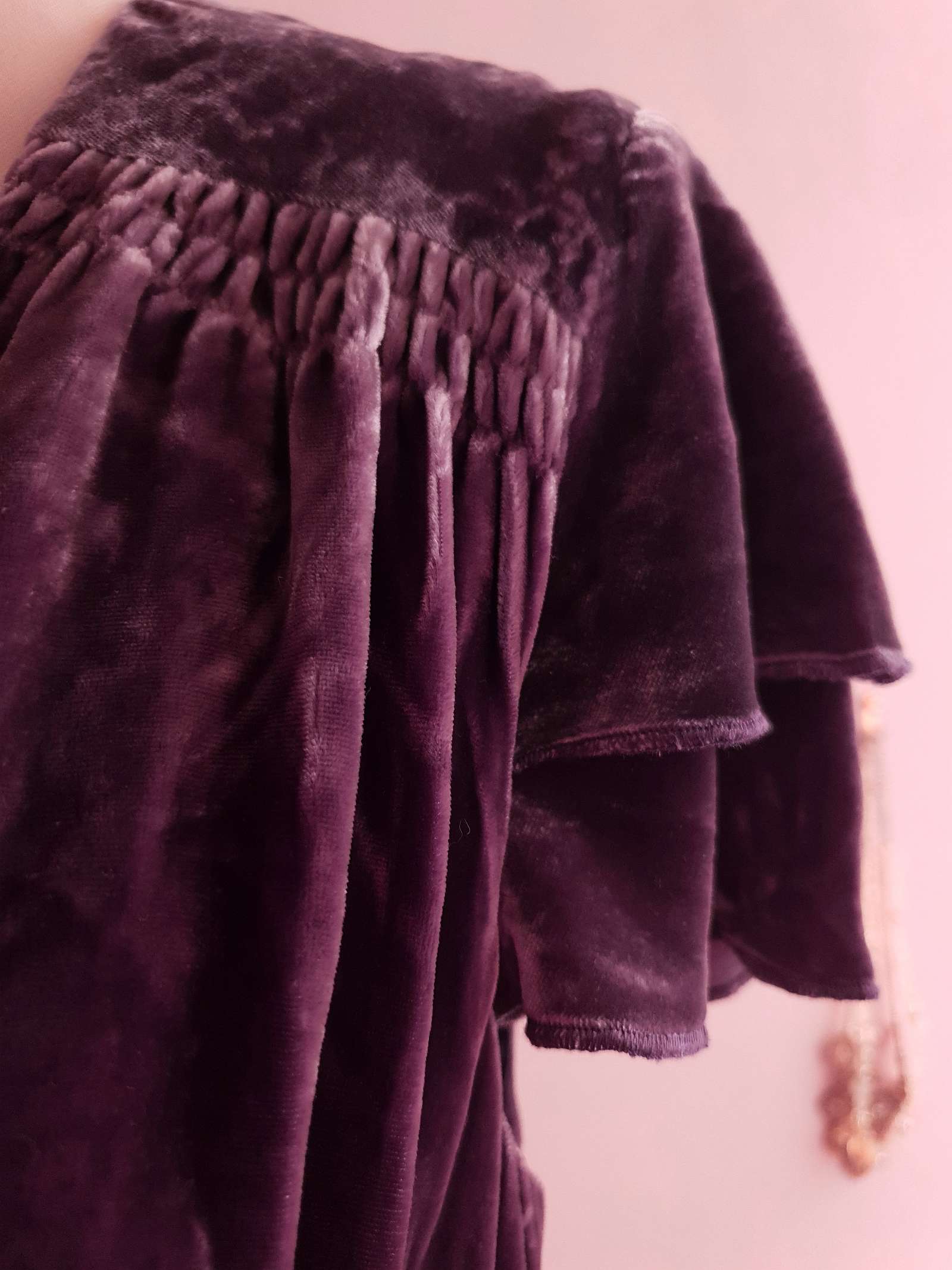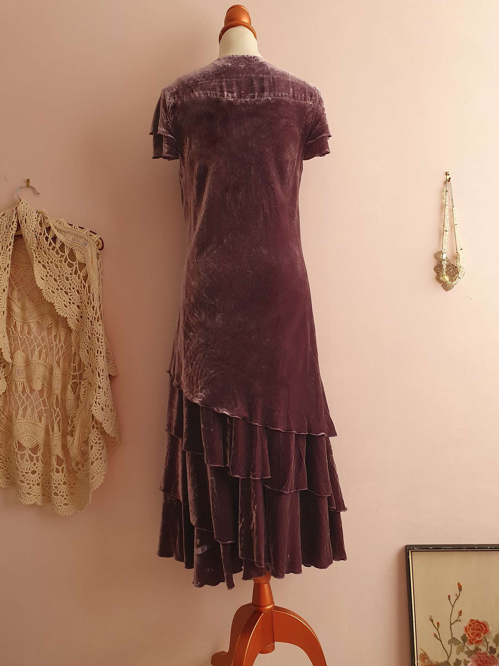 This 1990s vintage Laura Ashley tiered boho dress is a beautiful classic. Crafted with sumptuous luxurious crushed velvet (rayon and silk blend) in a deep, rich purple mauve hue, the dress features layered sleeves and four cascading tiers. Make a statement with this sophisticated vintage piece.