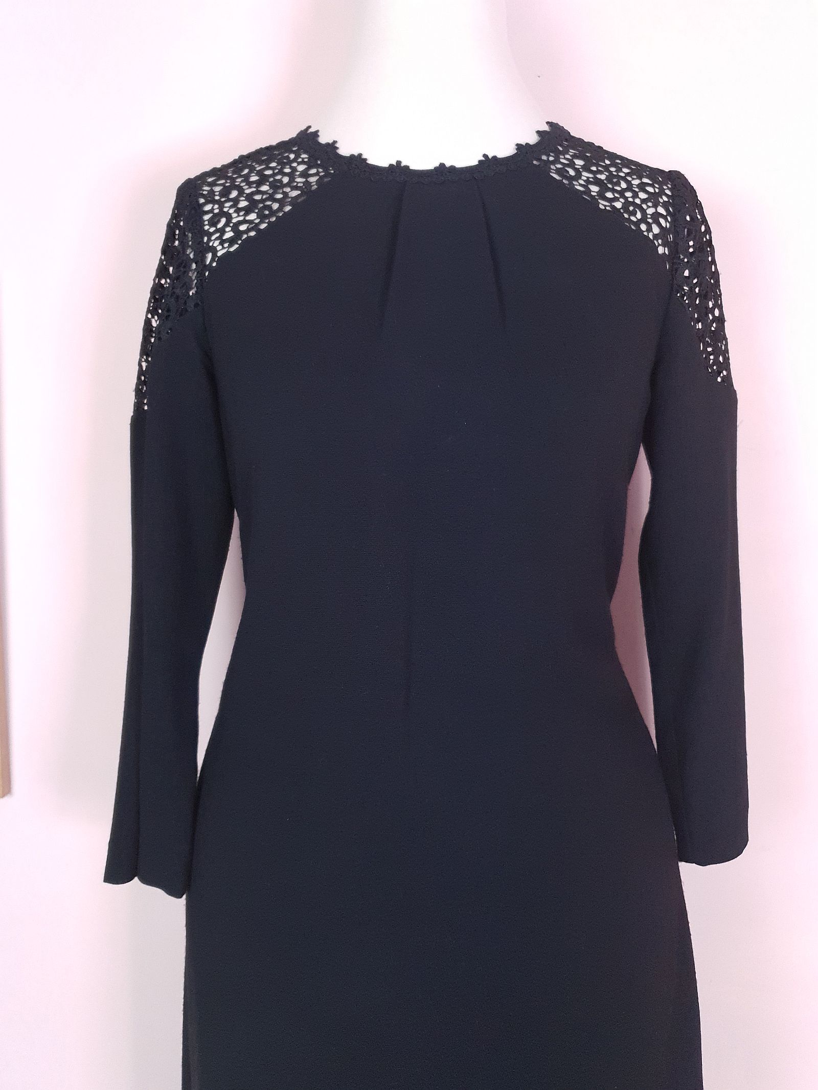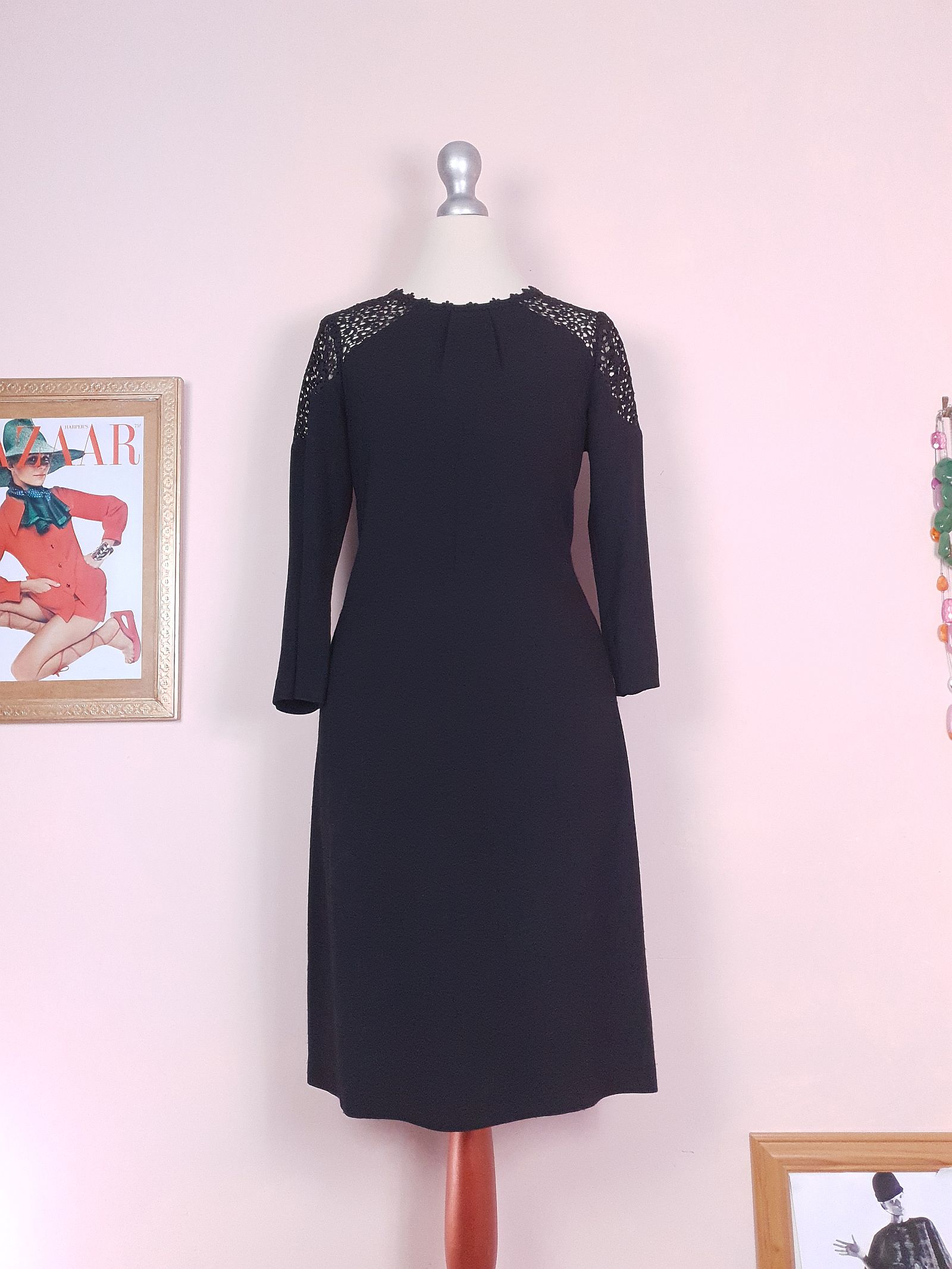 Made in the 1990s from black rayon, this classic little black dress features lace shoulder embellishments, a fitted knee-length silhouette, three-quarter sleeves, and a neckline with subtle lace trim. Back zip fastening.