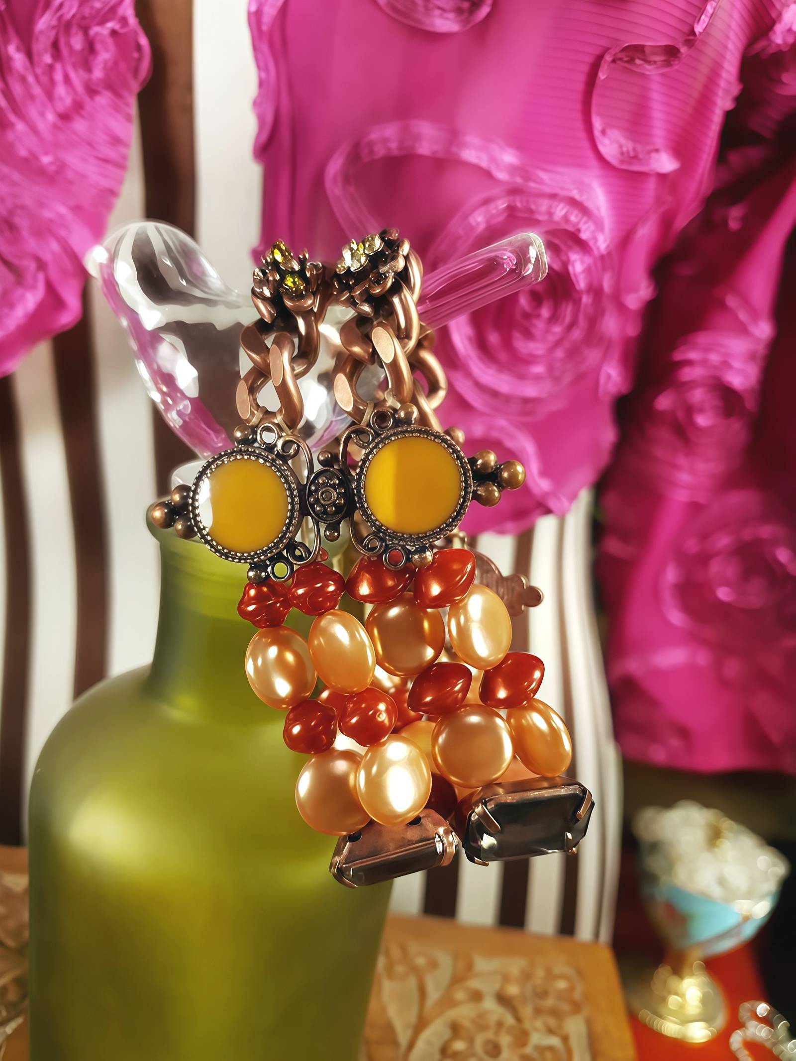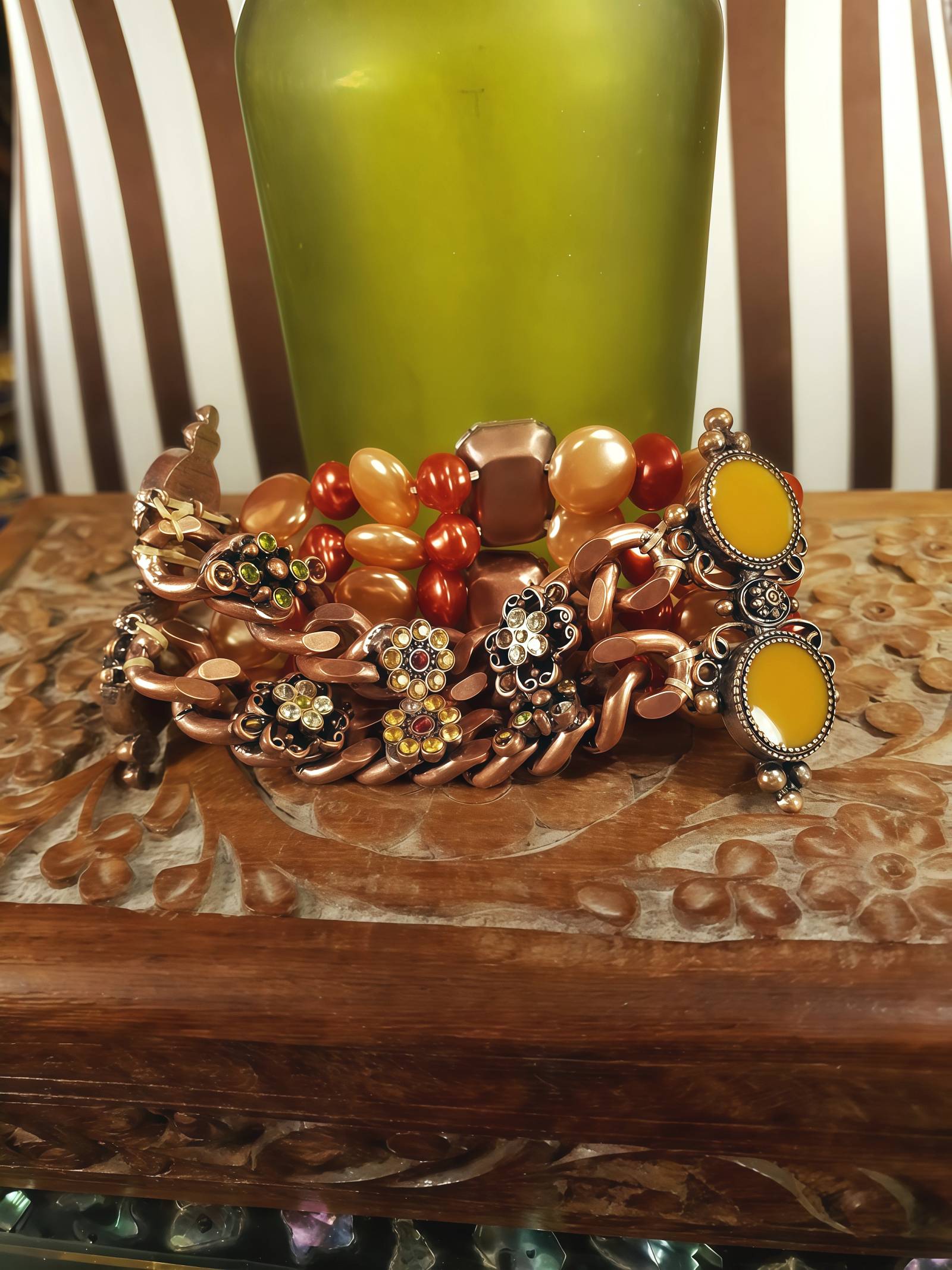 This cool 90s boho vintage bracelet is made with a beautiful blend of gorgeously iridescent pale orange and copper resin pearls, ornate scroll copper yellow enamel, large prong-set baguette cut dark grey resin rhinestones, olive green, orange, and red rhinestone flowers, all set on a chunky copper curb chain. Slip-on design.