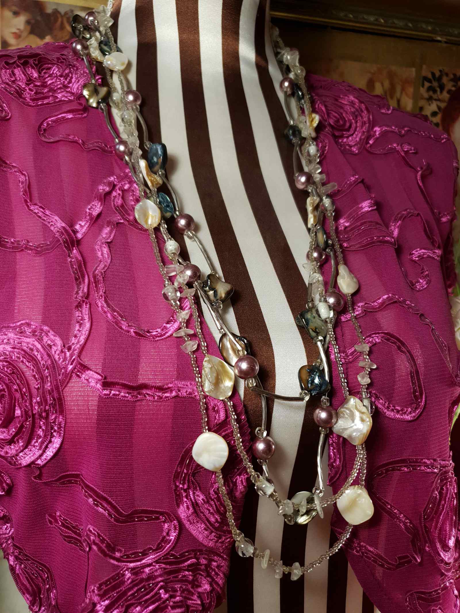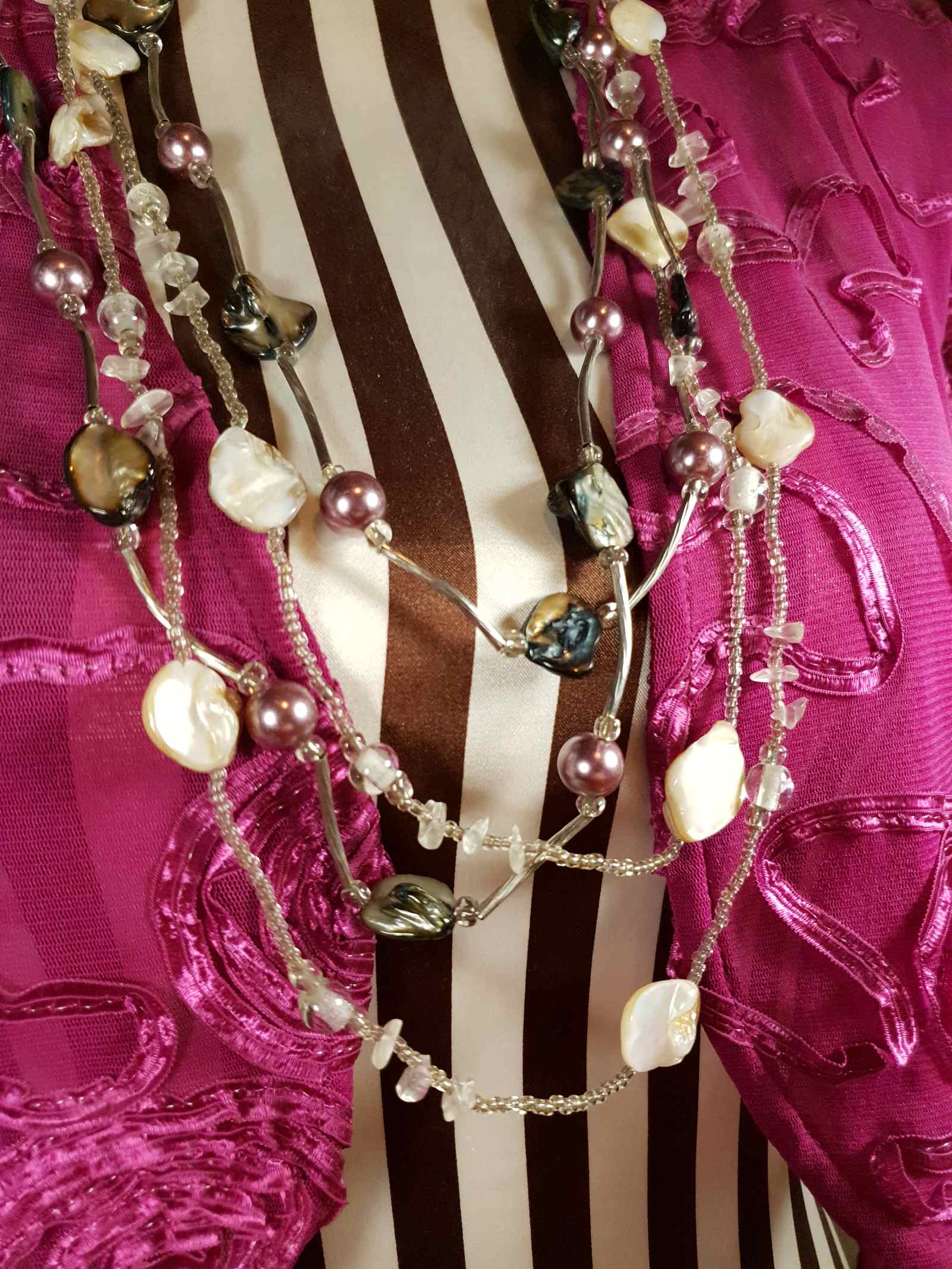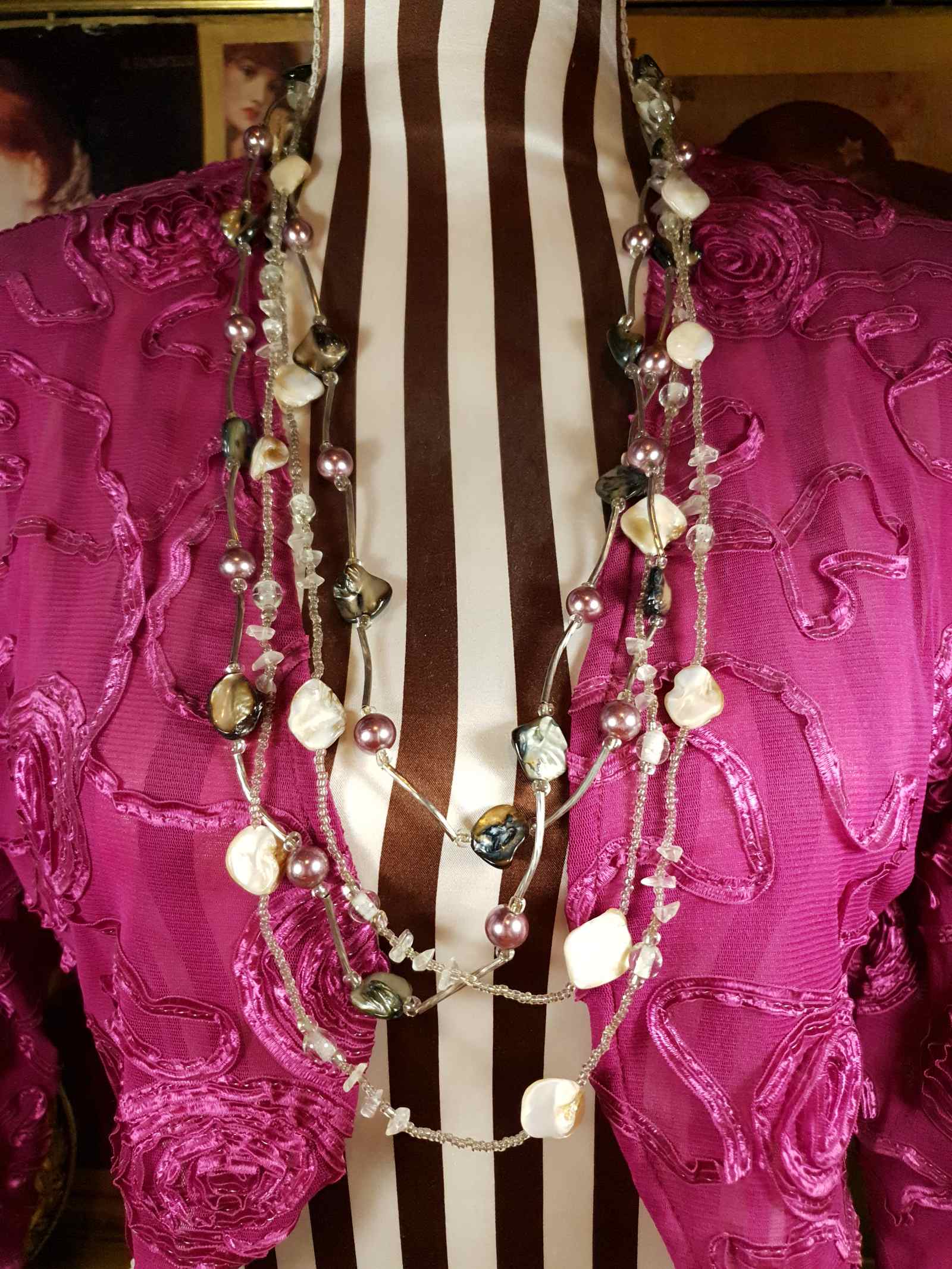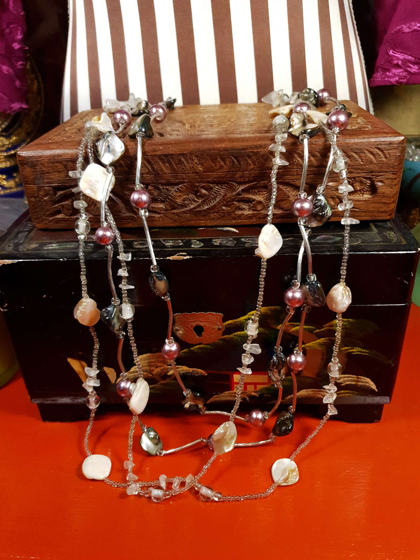 A stunning pre-owned necklace from the Y2K era featuring four graduating strands of abalone shell, mother of pearl, pale pink faux pearls, clear glass beads and silver-tone metal tubular beads. Secures with a lobster claw clasp.