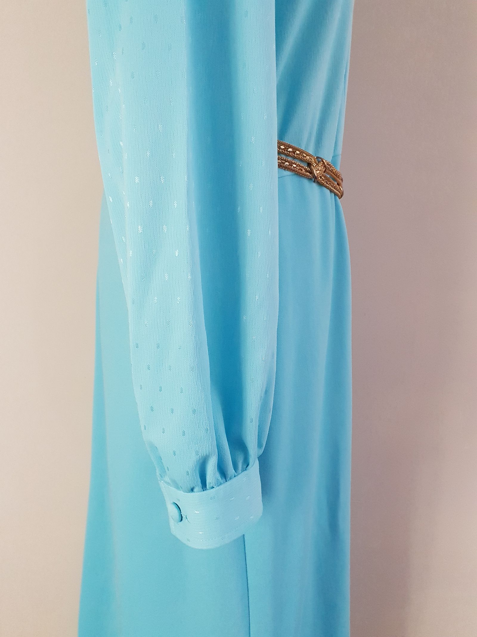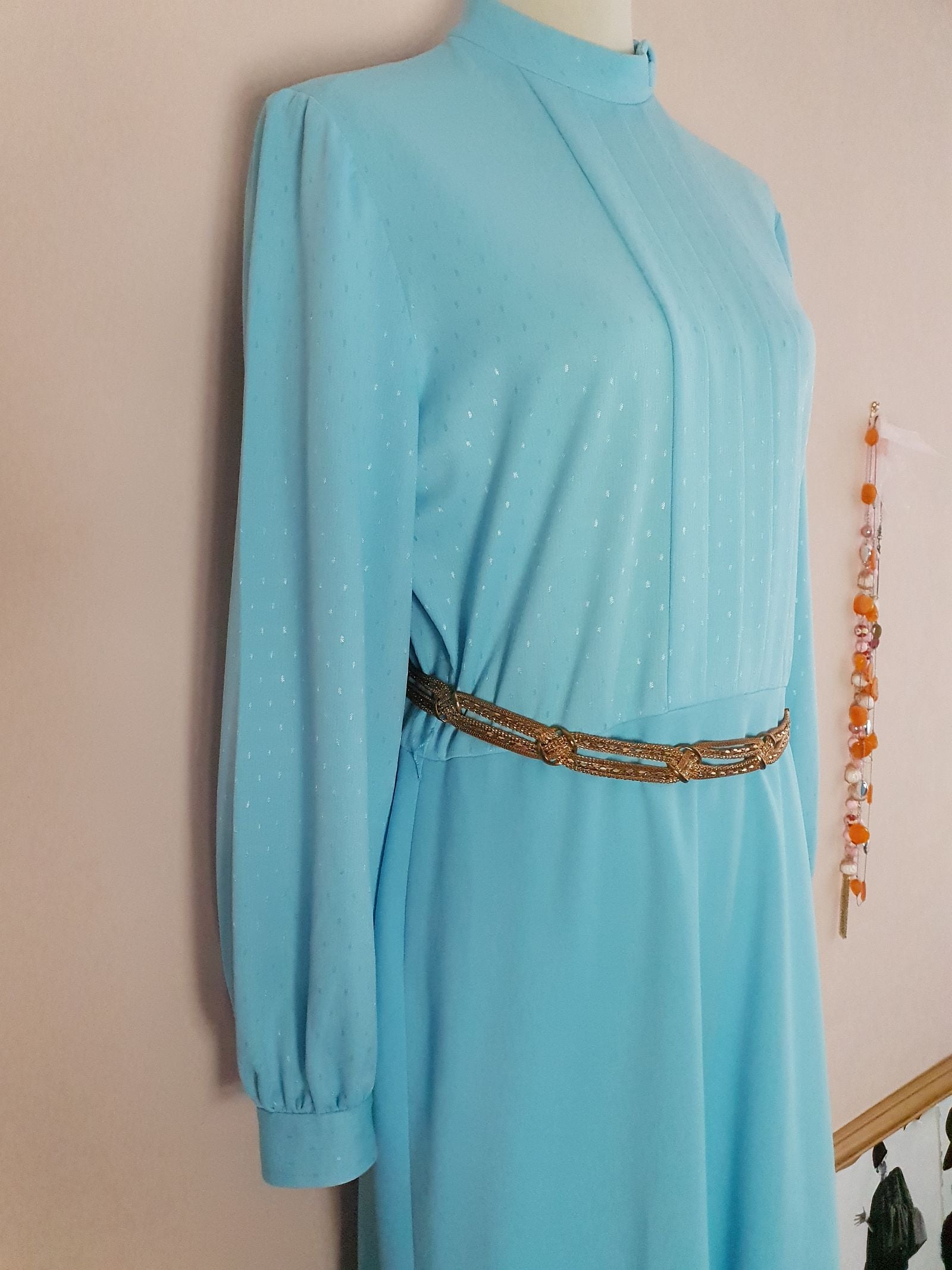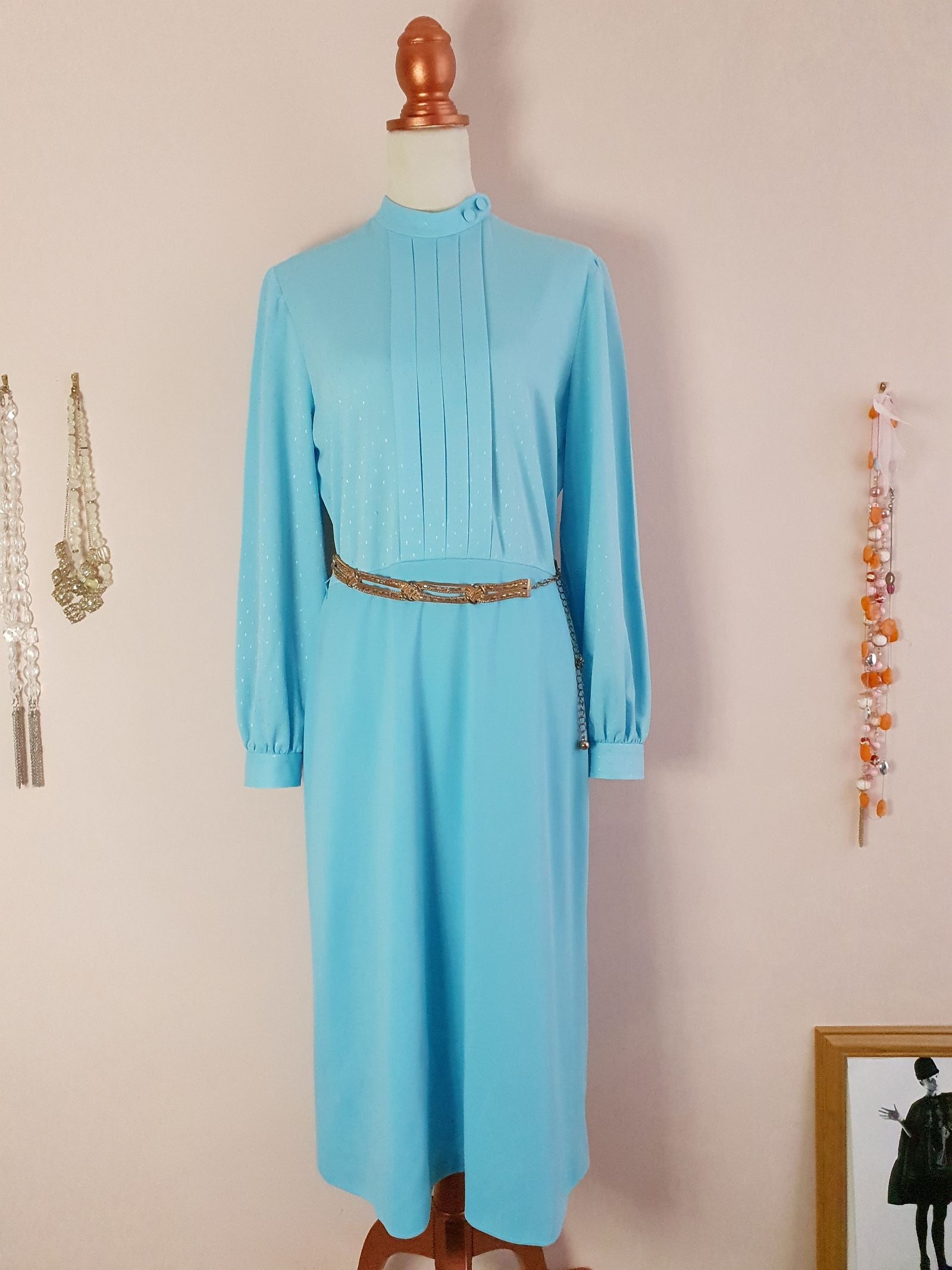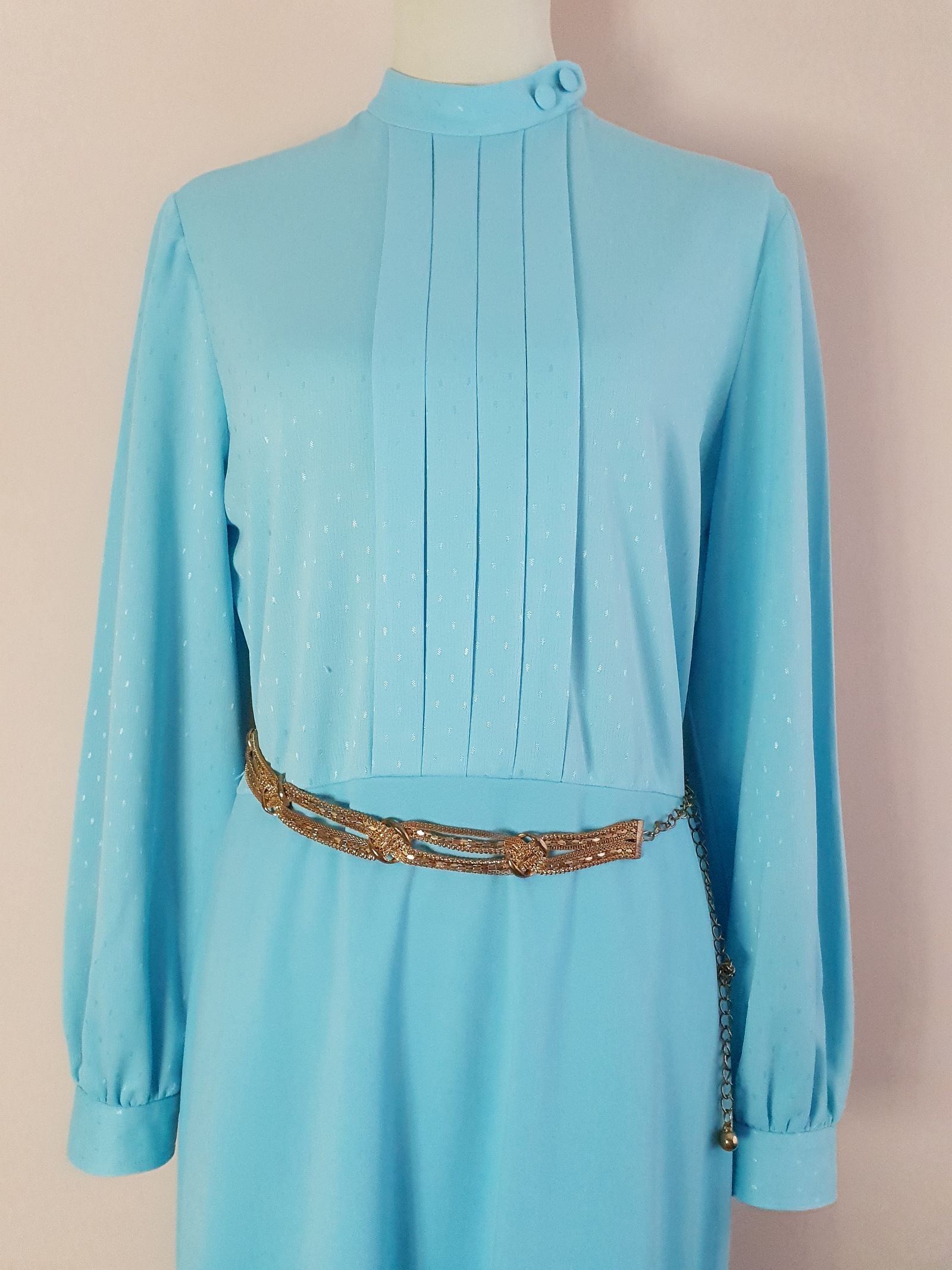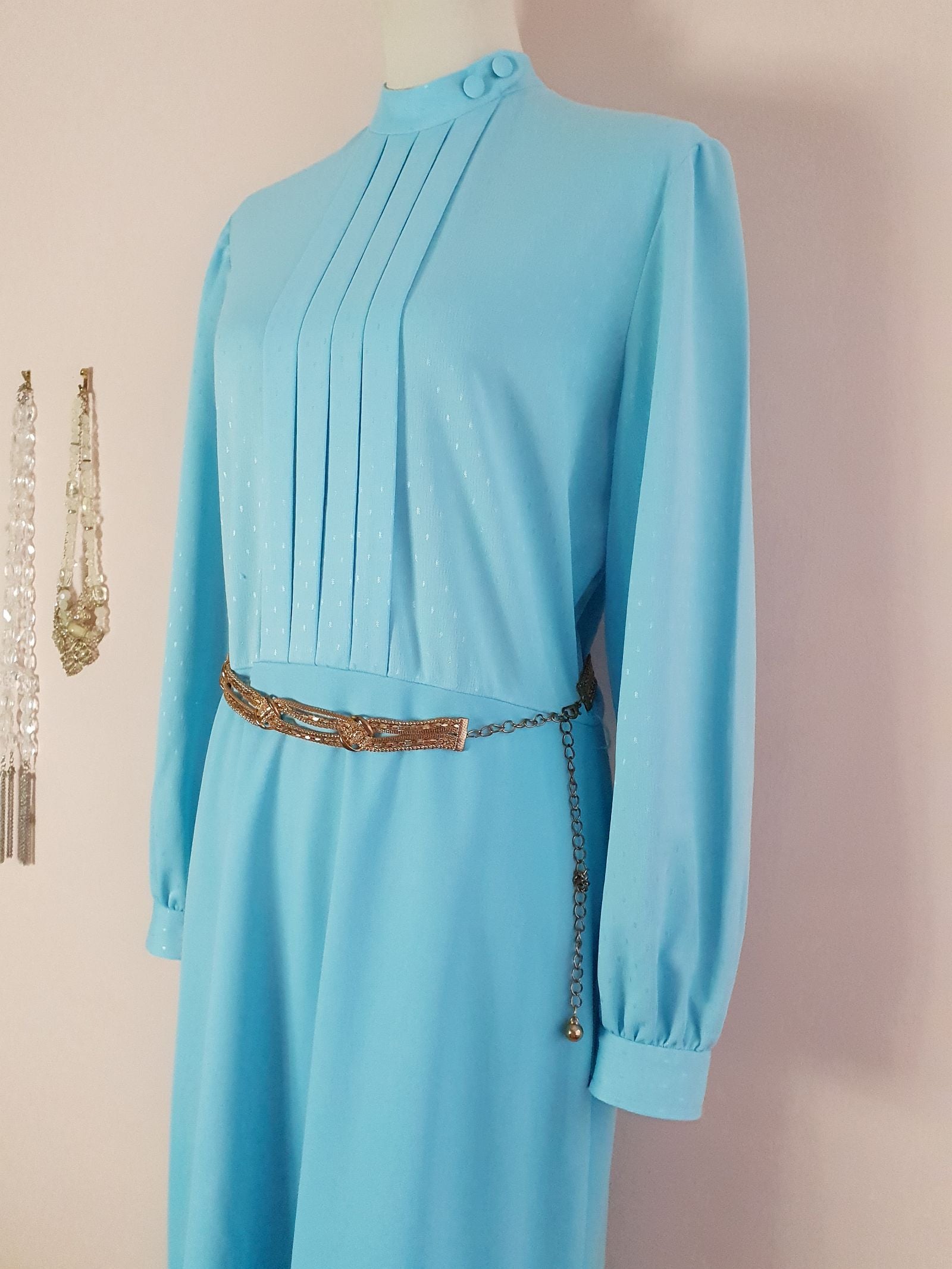This feminine vintage 60s pale blue dress is tailored to perfection and features a pleated front, fabric-covered button neckline detail, and back zip closure. The perfect piece for effortless elegance.