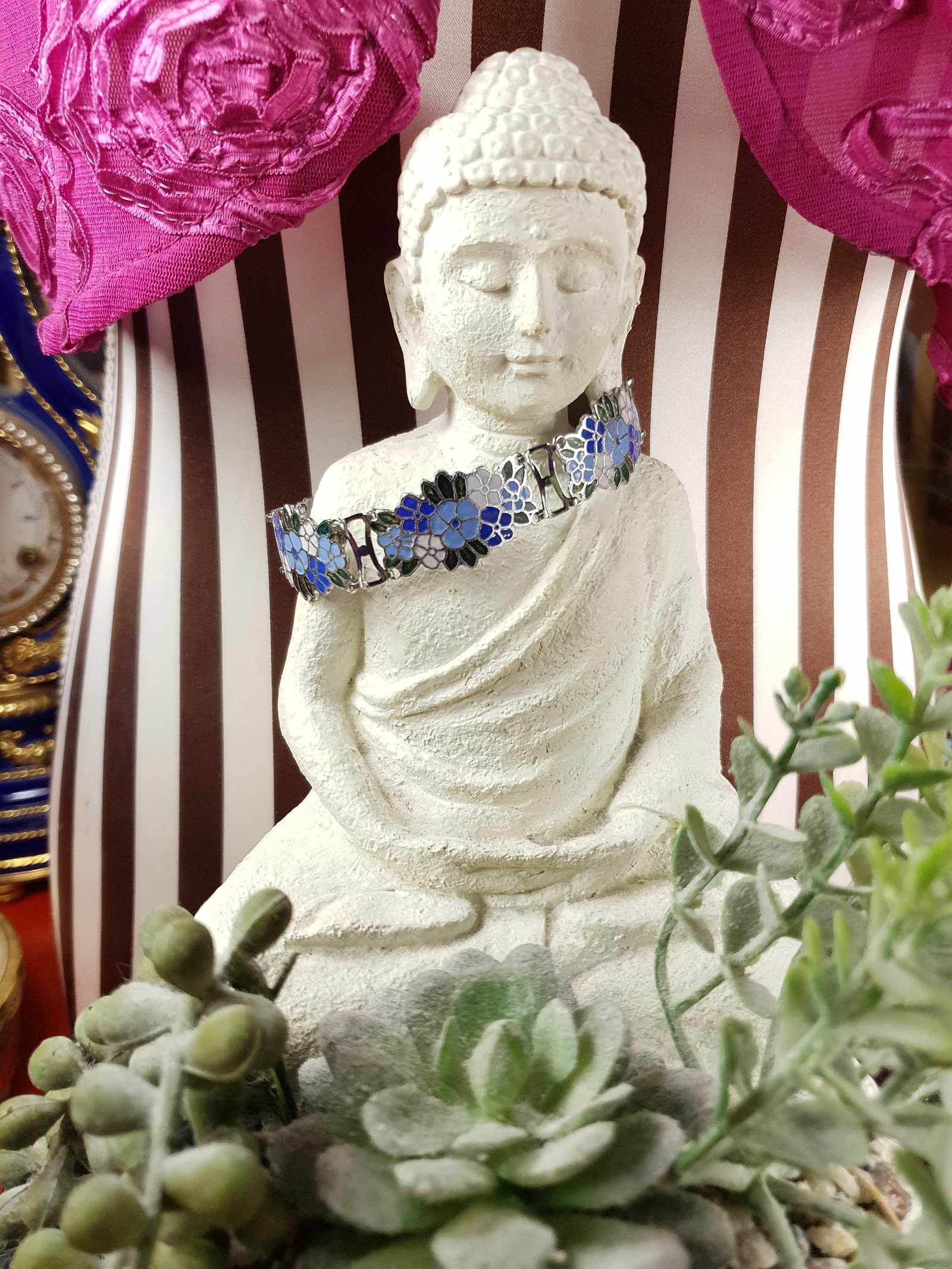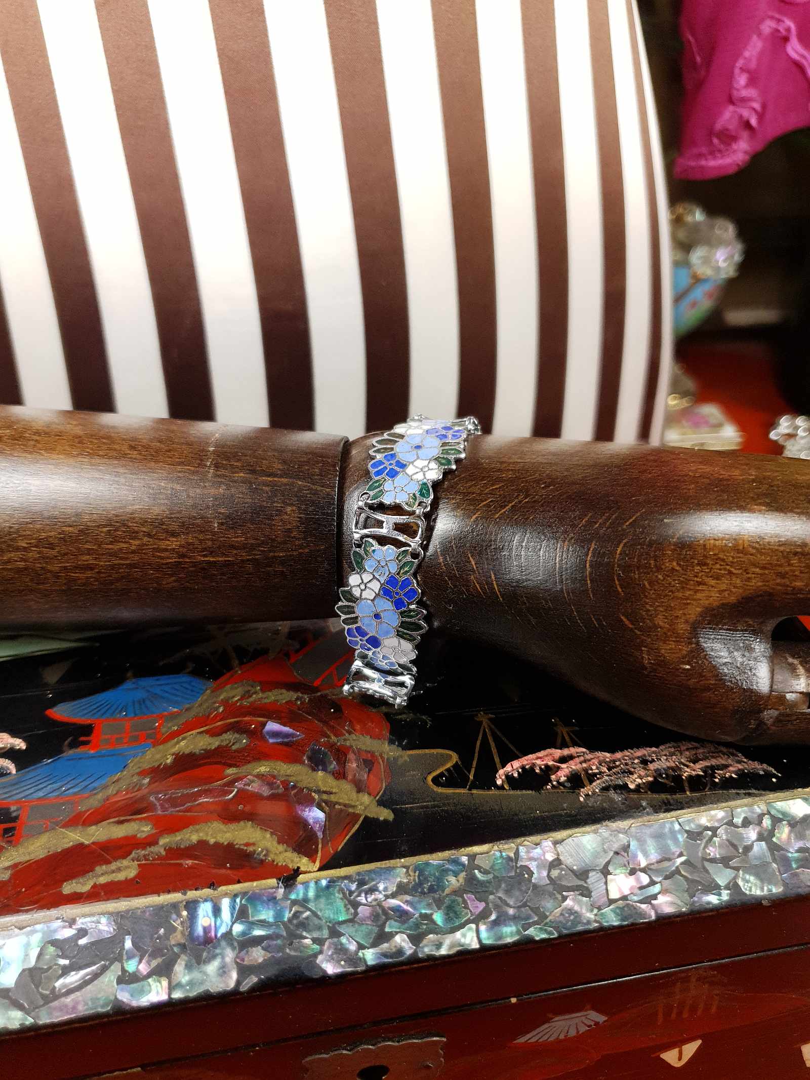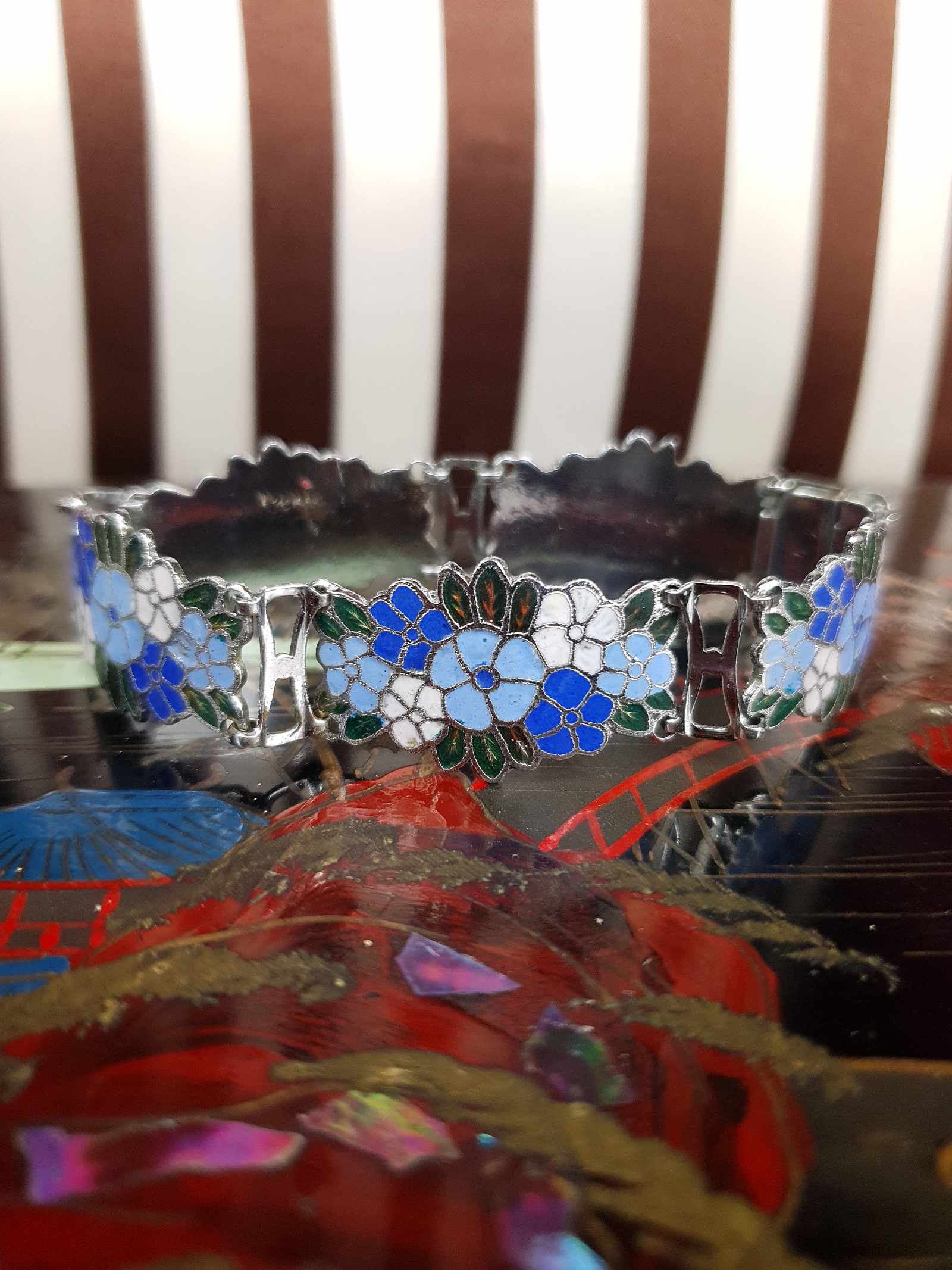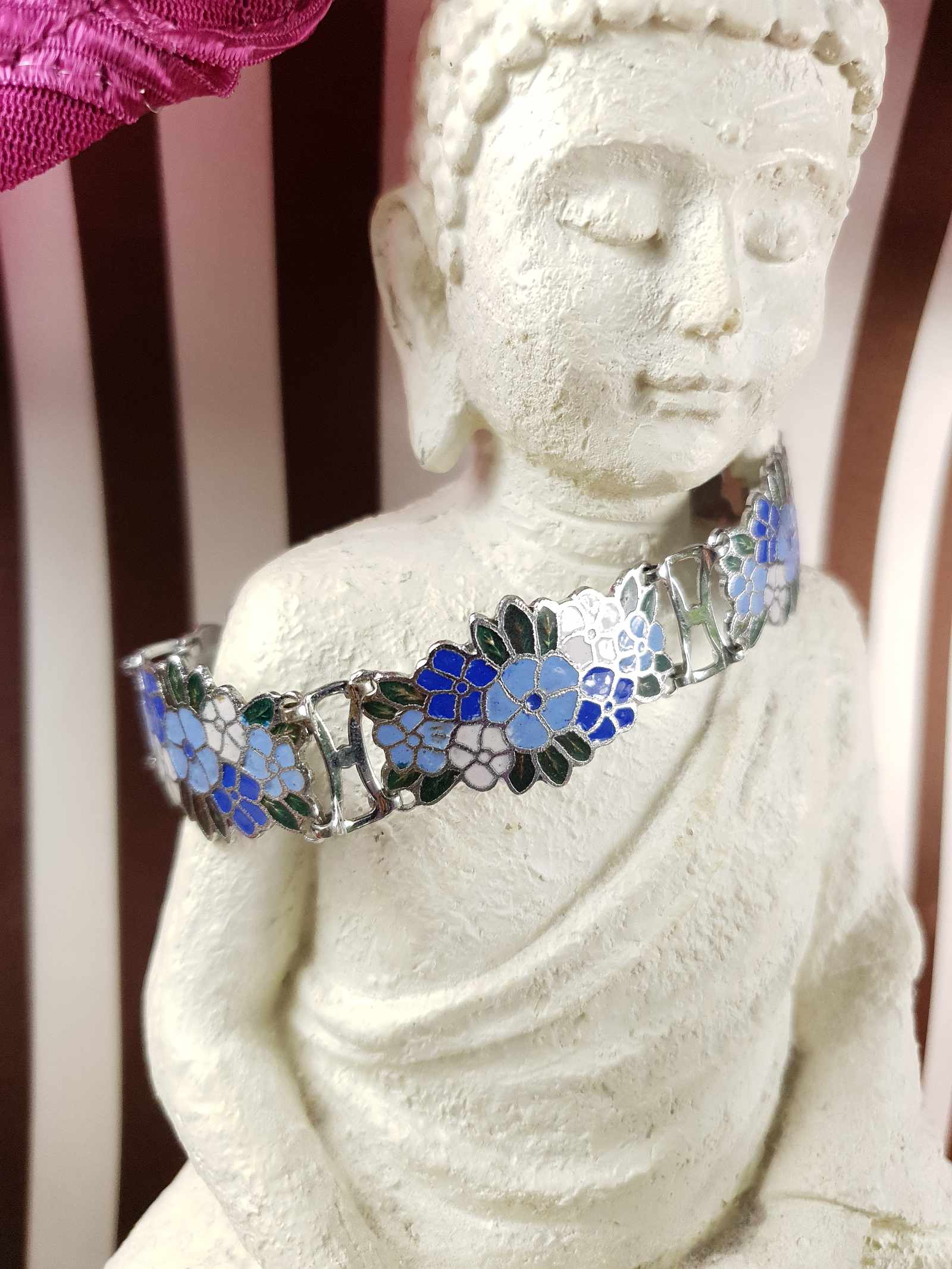 Vintage 1980s Blue Floral Cloisonne Bracelet Flower