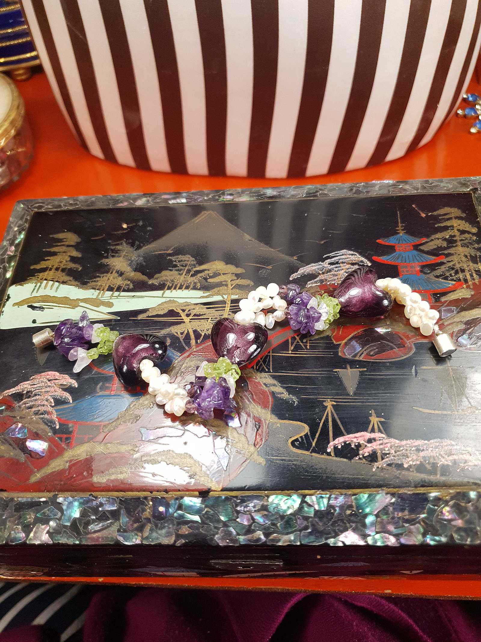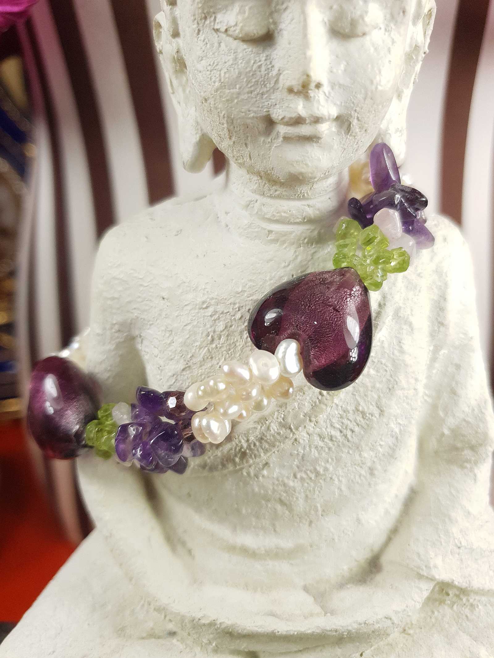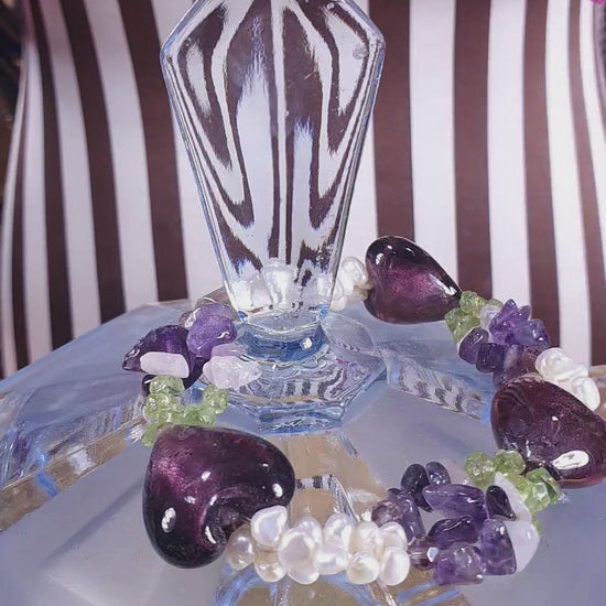 This charming vintage 80s bracelet combines lustrous white seed pearls with vibrant peridot, amethyst gemstones and pink quartz. Interspersed with three silver-foiled art glass purple hearts.