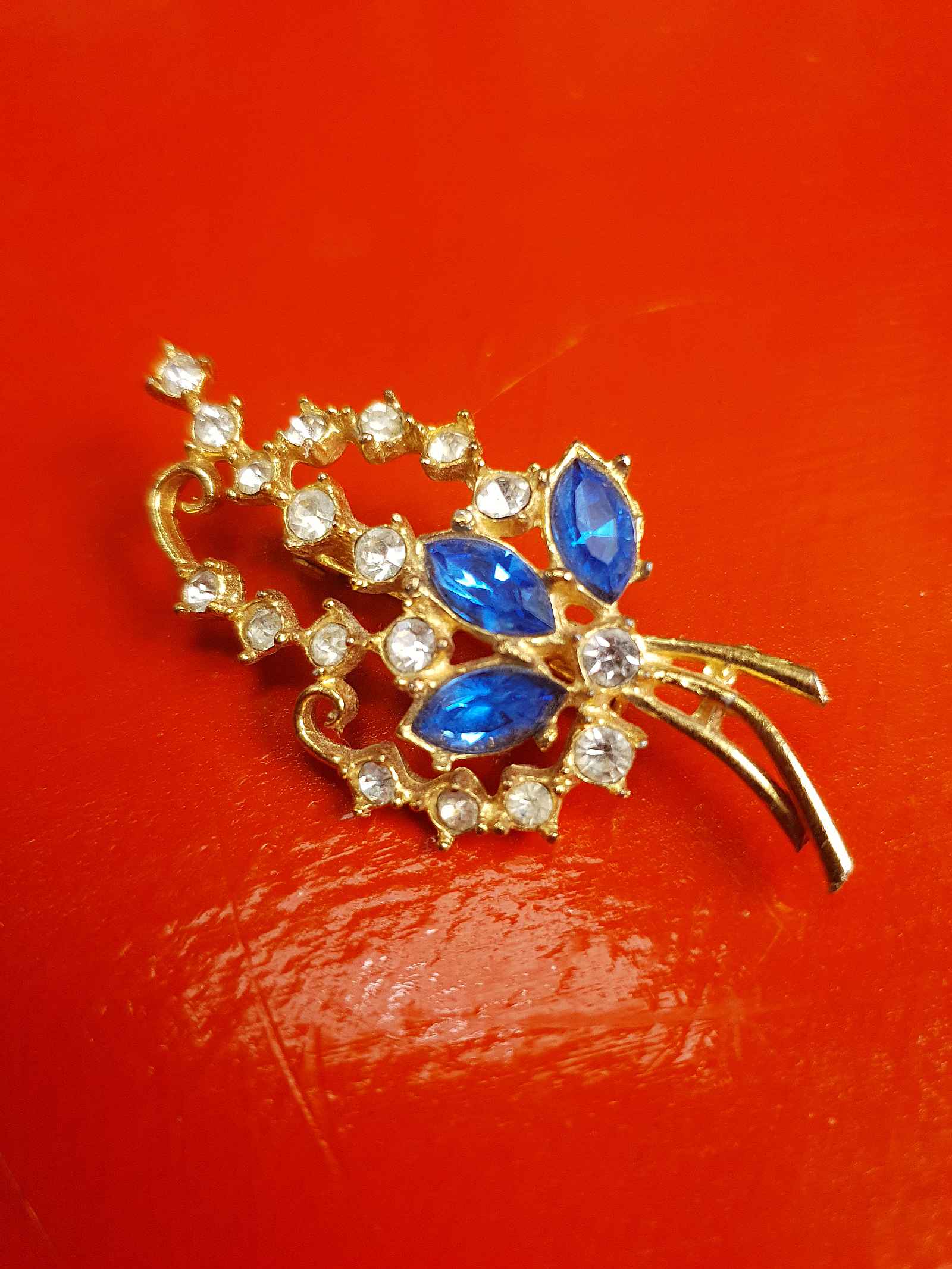 Vintage 1940s Blue Rhinestone Floral Brooch Flower Sprig Gold Tone