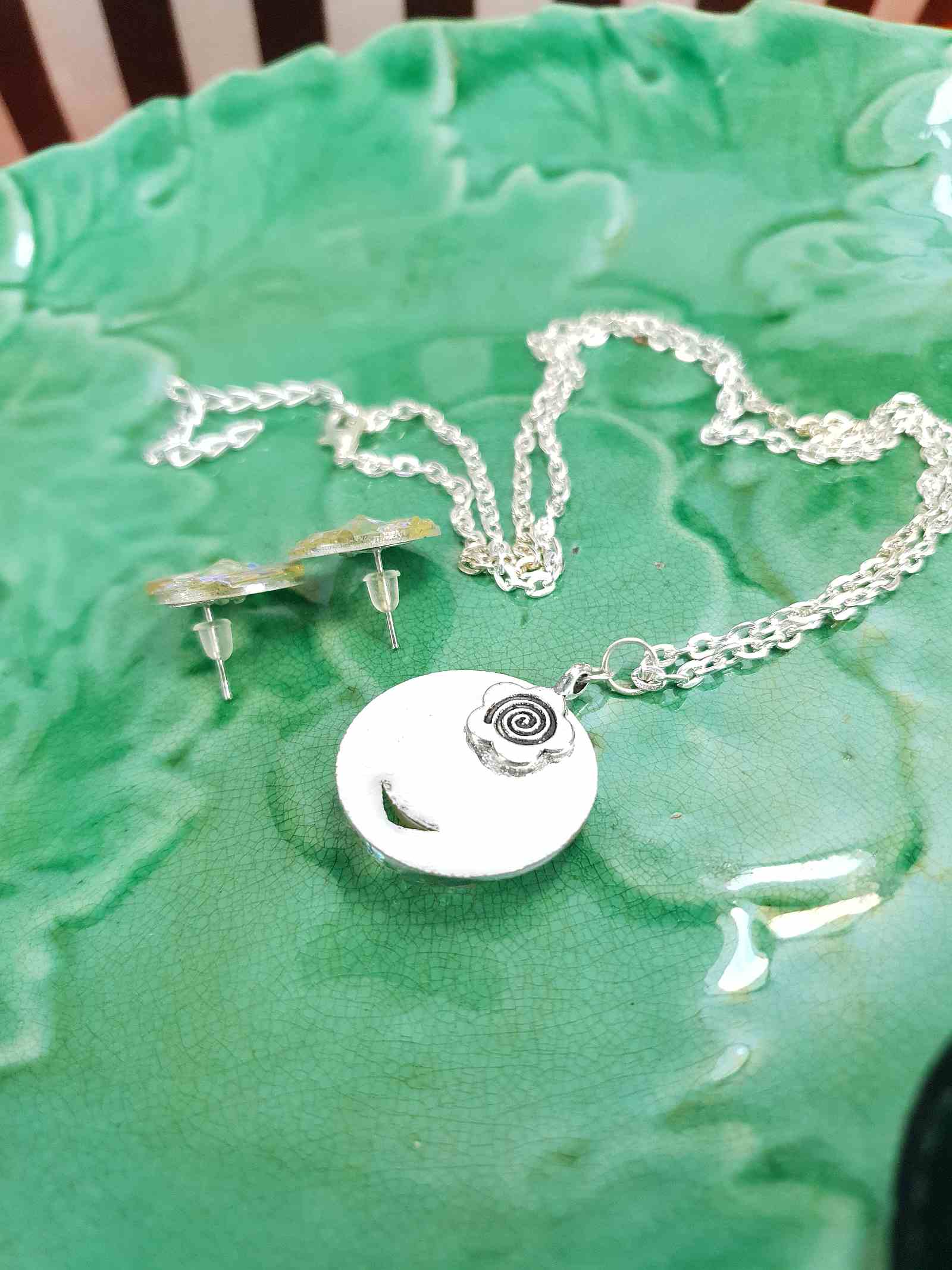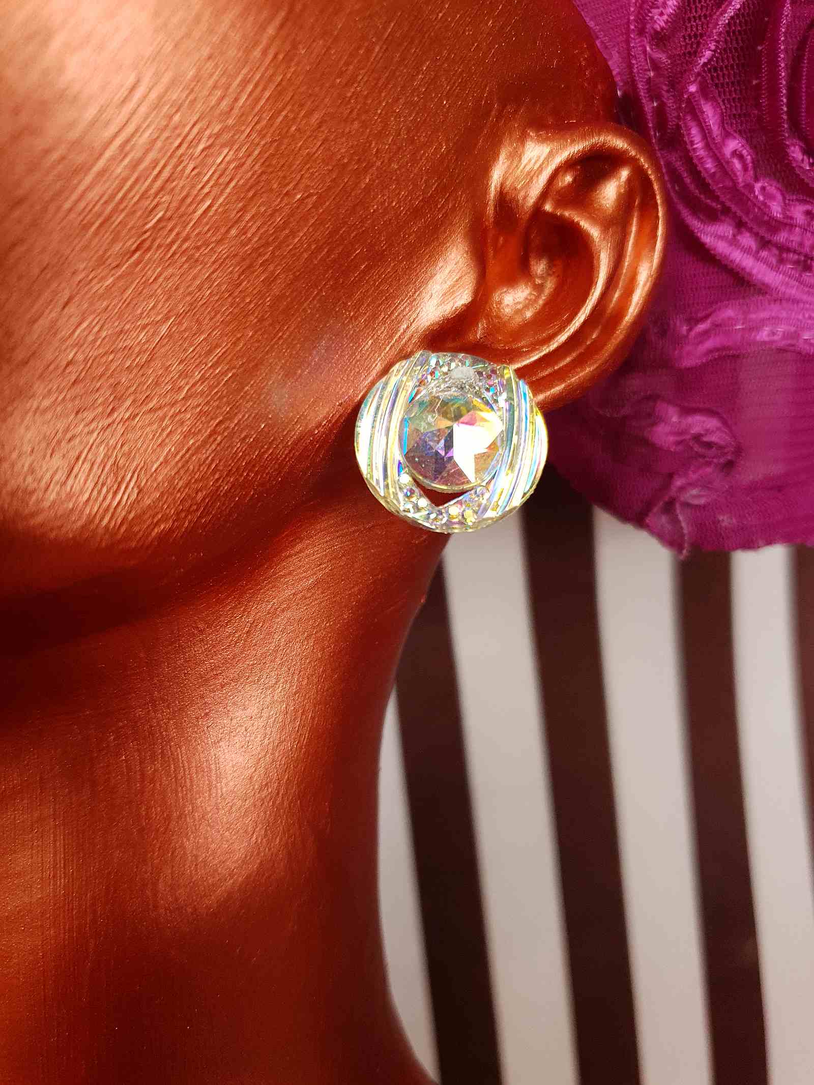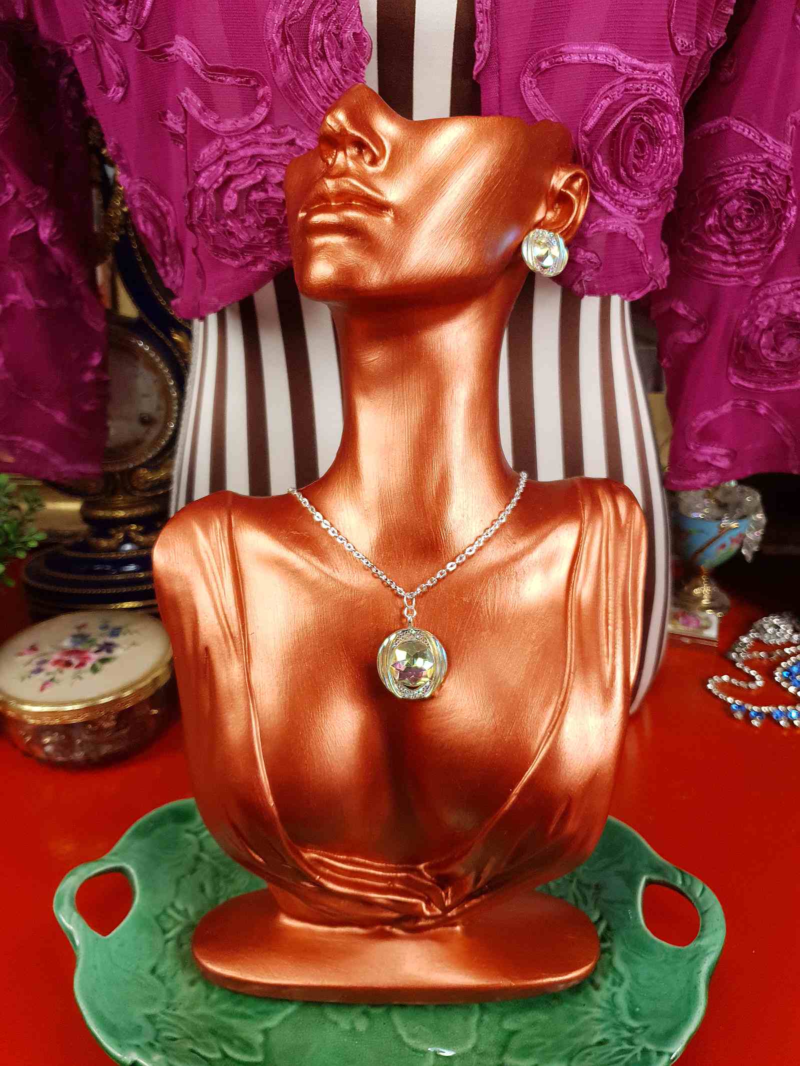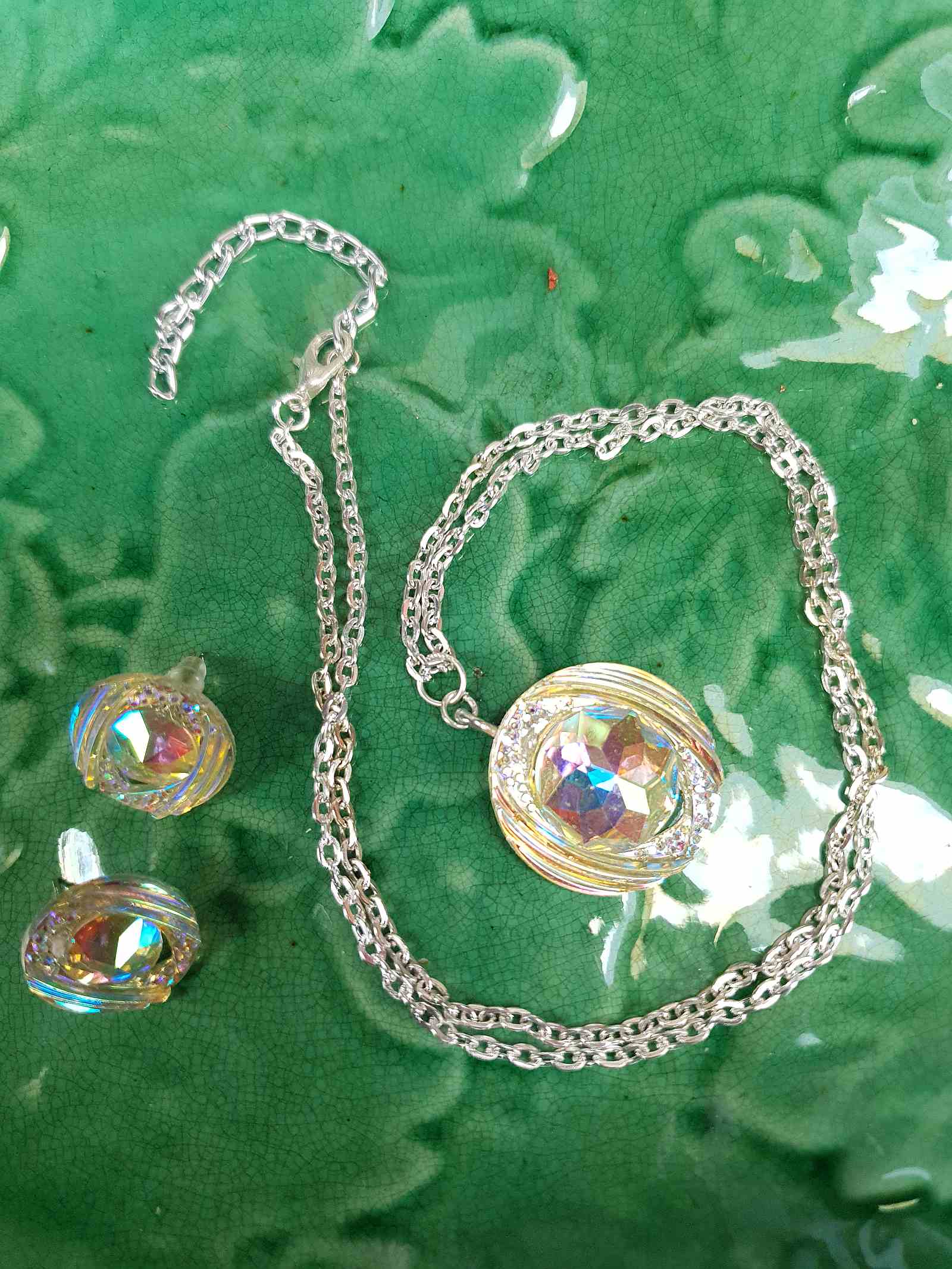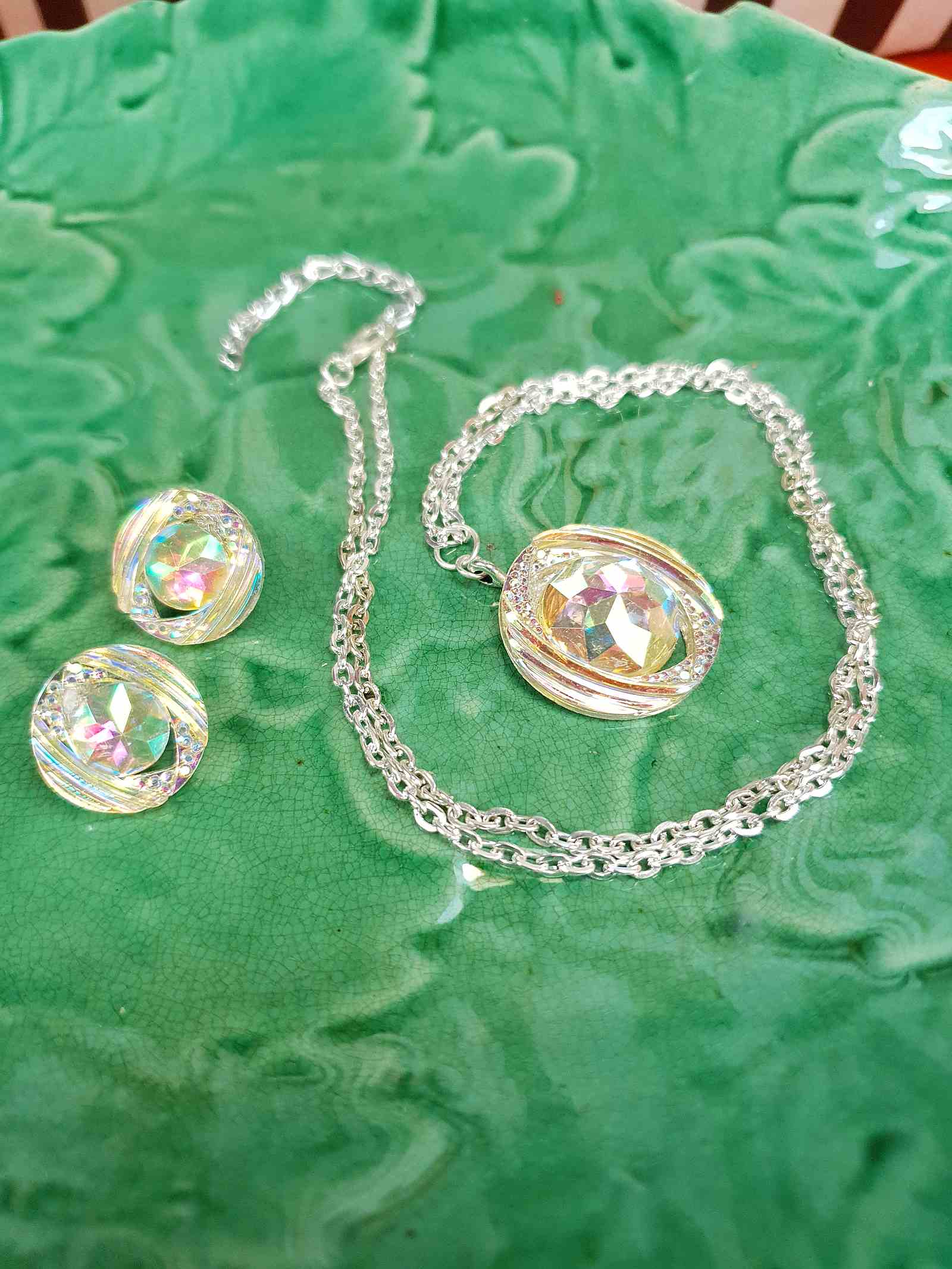 Y2K jewellery set with beautifully iridescent Aurora Borealis faceted resin rhinestones and bright silver-tone metal chain. Necklace and matching earrings in one coordinated piece. Lightweight and comfortable to wear. Earrings for pierced ears.