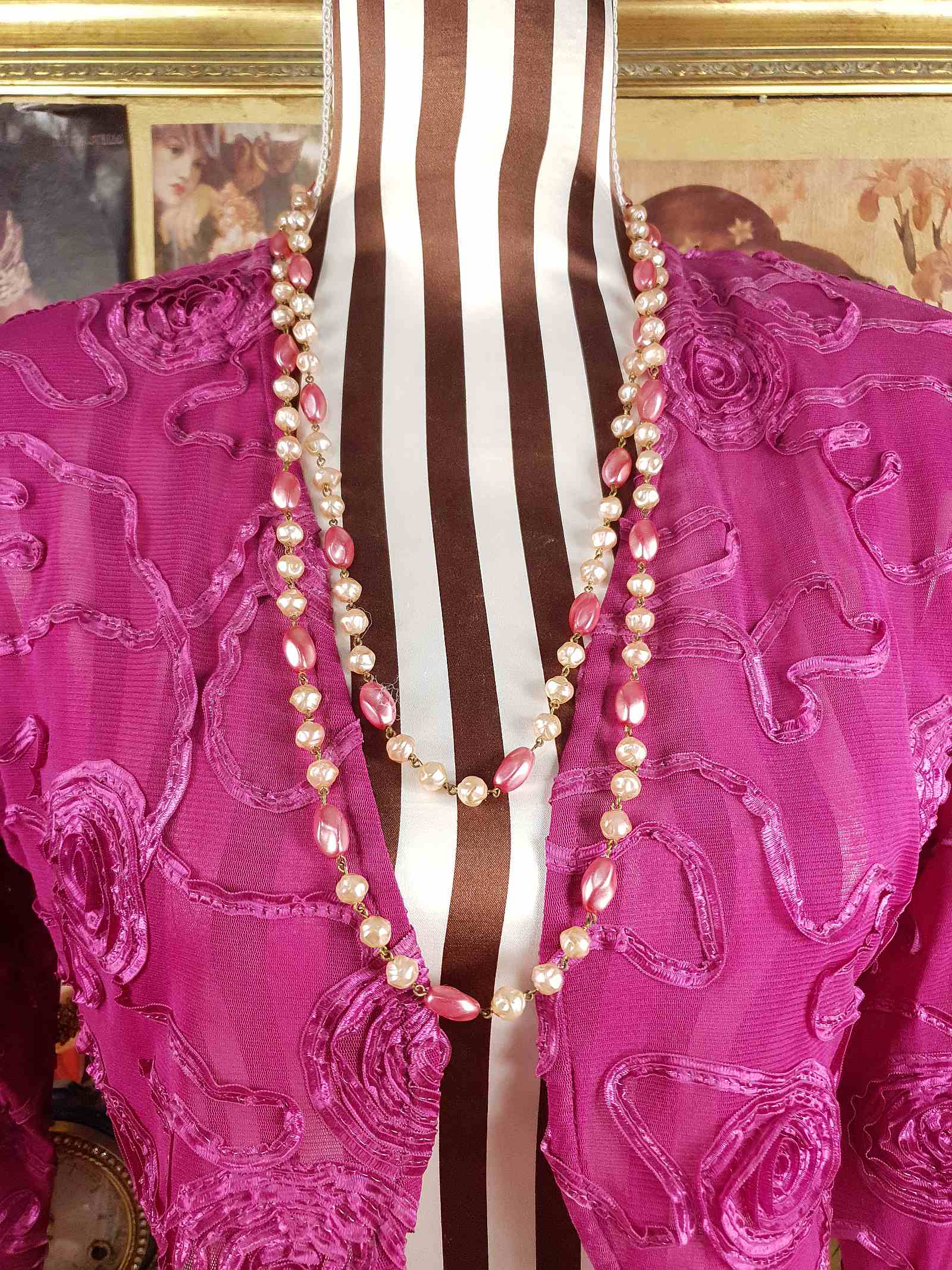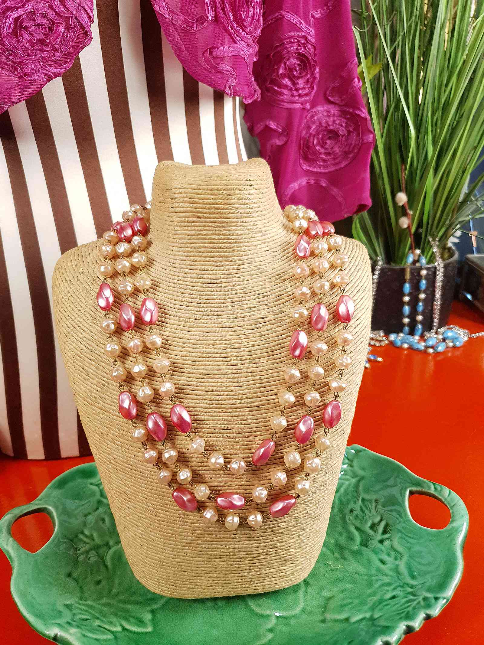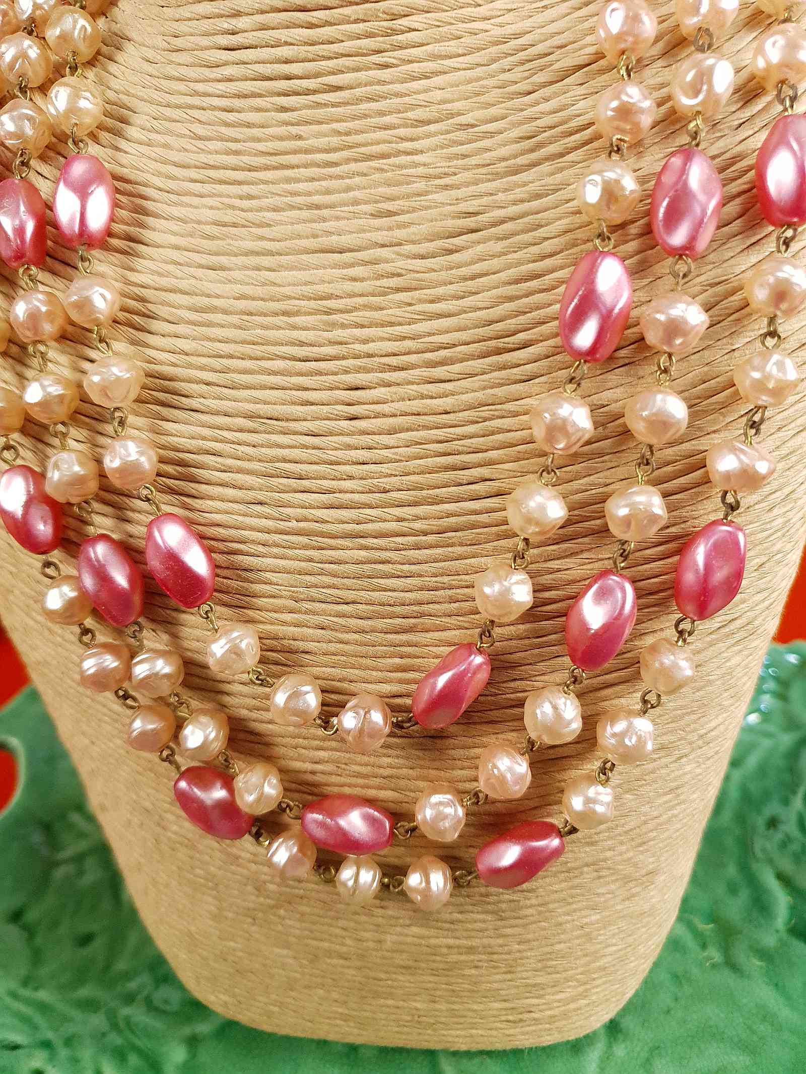 This charming vintage 30s necklace features dainty glass beads in shades of mid pink and pale pink, strung on brass links in a timeless long design. Perfect for versatile looks, wear long or double or triple wrap for a chic layered look.