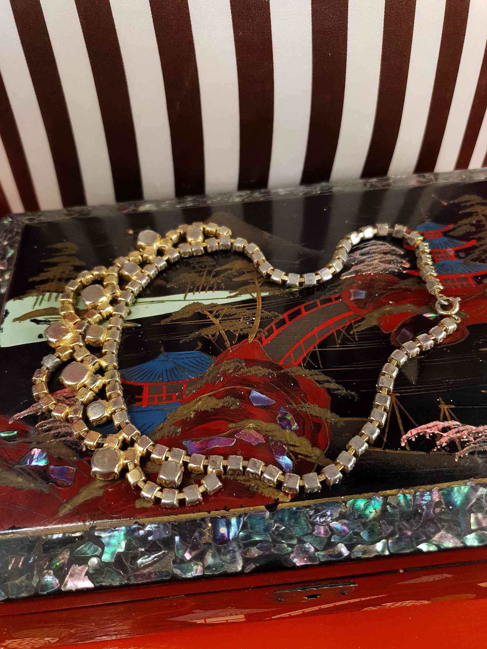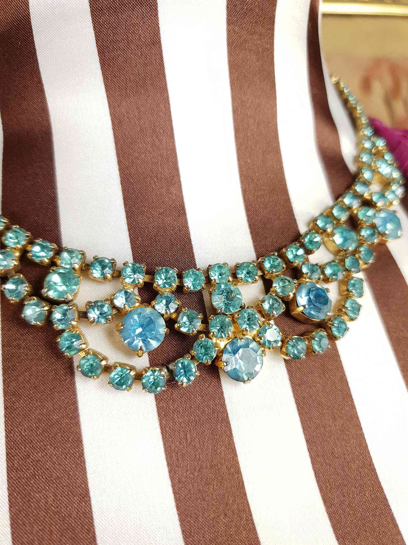 This exquisite 40s choker necklace features stunning mid-blue rhinestones set in a classic vintage design. Prong Set gold-tone metal, which has acquired a patina over the years The choker style sits beautifully at the neck, making it an ideal statement accessory for vintage enthusiasts and collectors. A timeless treasure that brings old-world charm to modern wardrobes.