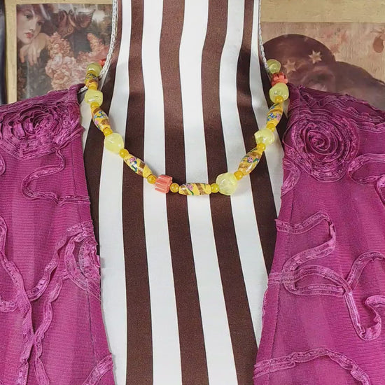 A beautiful 1950s Murano glass necklace featuring iconic wedding cake beads (Fiorato beads) in warm yellow tones. The hand-crafted wedding cake beads showcase the distinctive lampwork* technique characteristic of Venetian glasswork, with intricate patterns visible throughout. Decorated with a first layer of sparkling golden aventurine and a second layer using a trailing pattern technique and featuring golden swirls and flowers In shades of pink and blue, connected with green swirls.