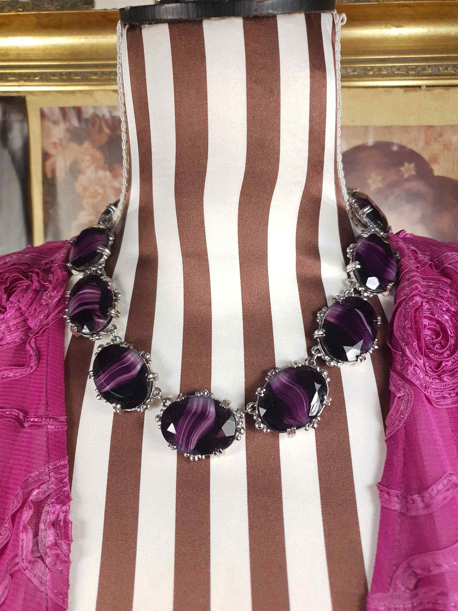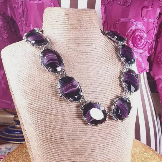 This striking 60s vintage necklace features prong set faceted, large oval, rich purple glass stones with wavy lilac stripes, simulating agate. A gorgeously bold statement piece from the 1960s. The deep, jewel-toned art glass catches the light beautifully. Set in silver tone metal and finished with a hook clasp with an extender for a customisable fit.