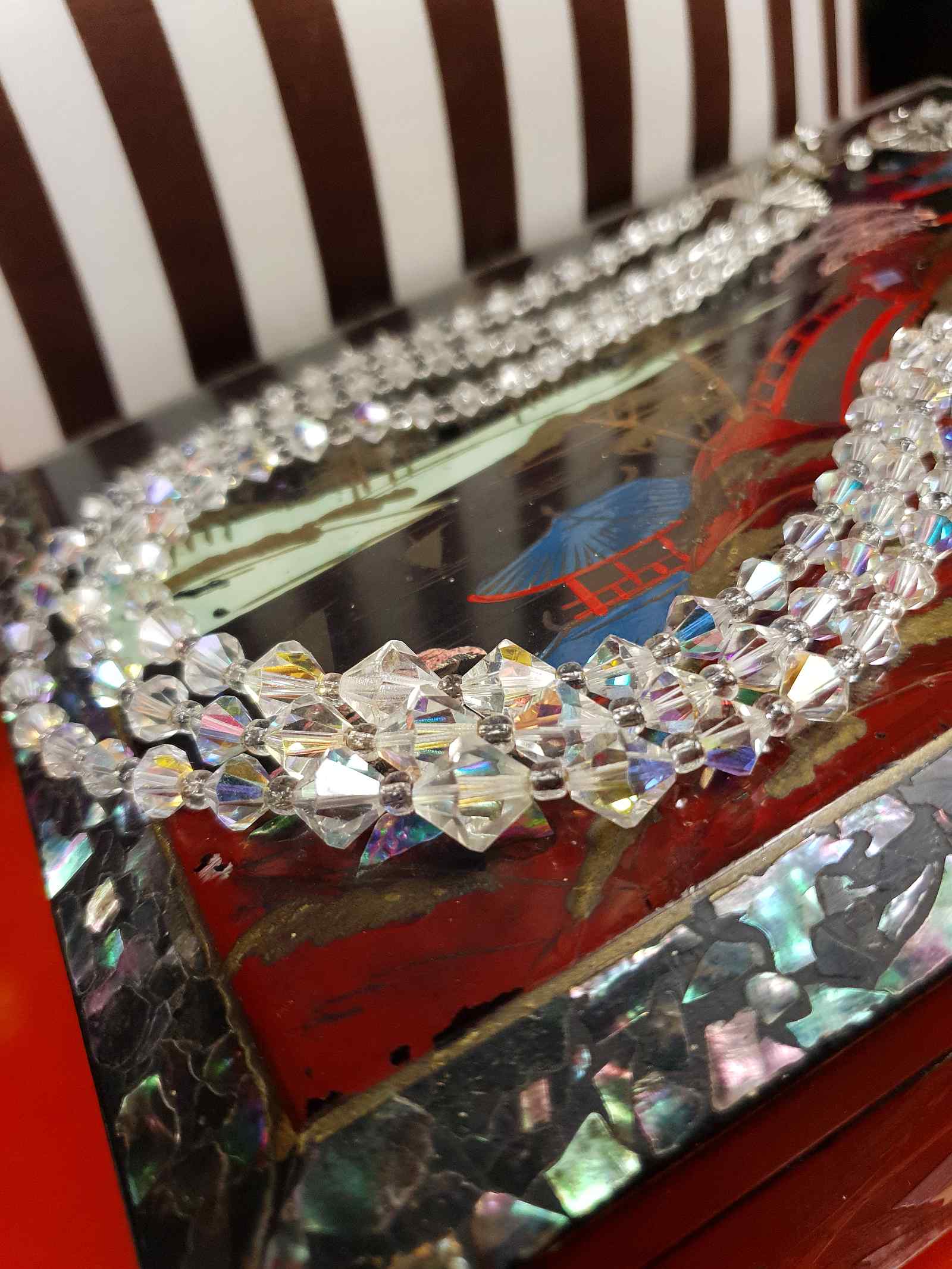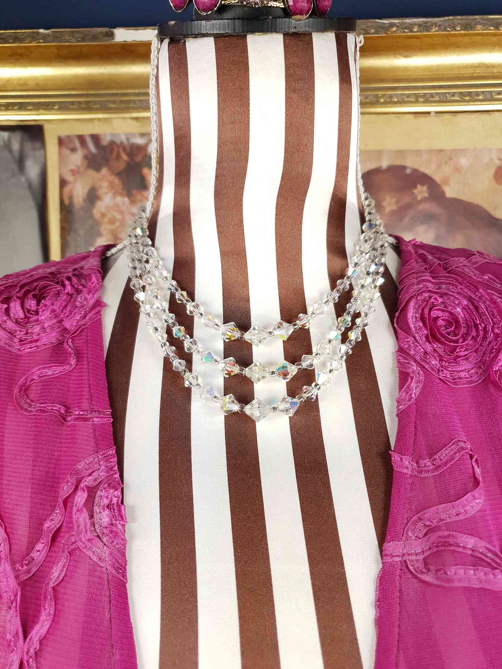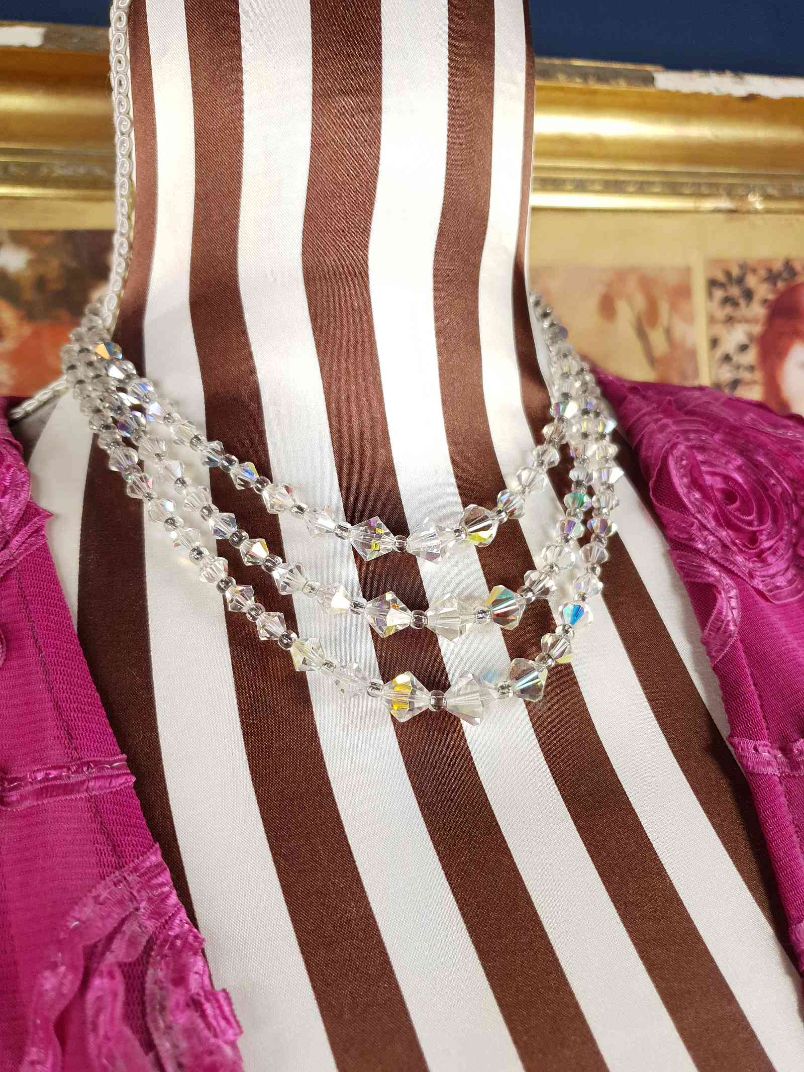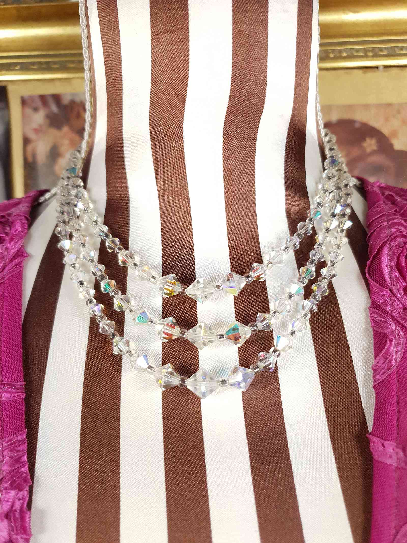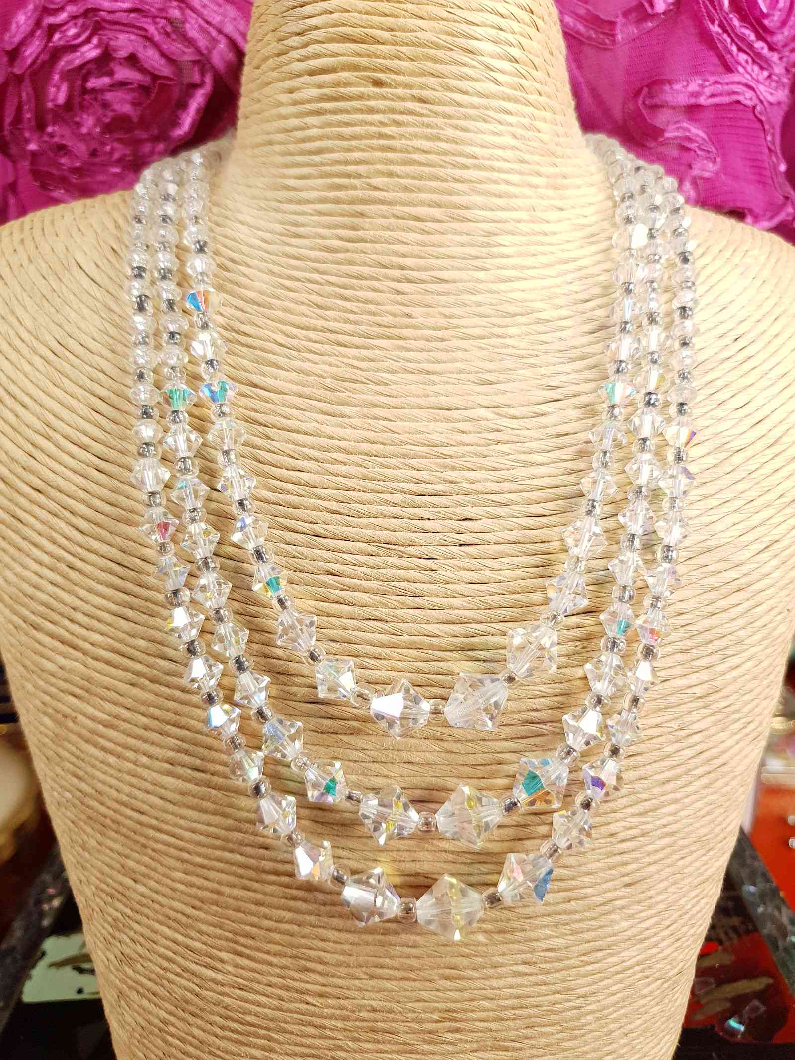 Stunning three-strand 60s necklace featuring Aurora Borealis crystal beads. Each faceted bead catches light with mesmerising rainbow iridescence, creating an enchanting play of colour. Interspersed with silver glass beads. silver-tone metal ornate fan clasp detailing.