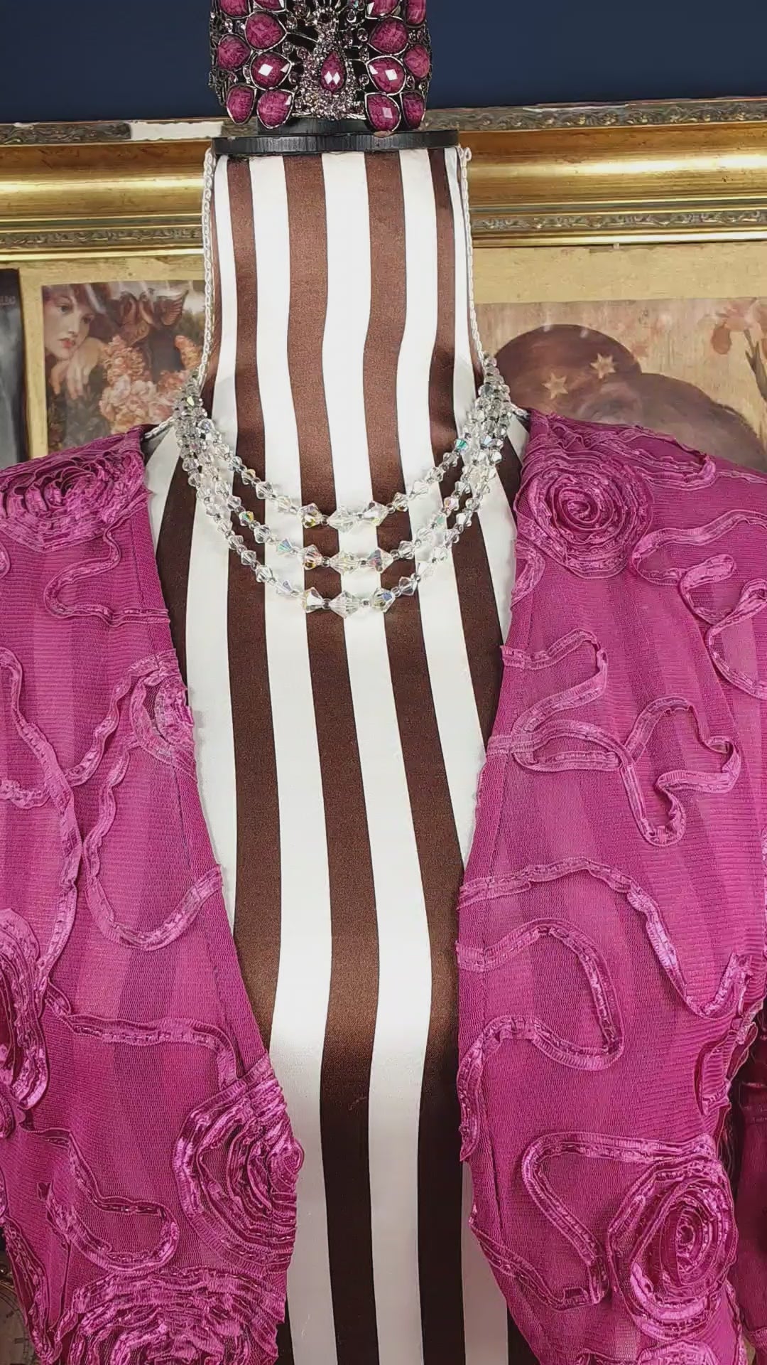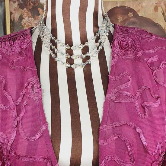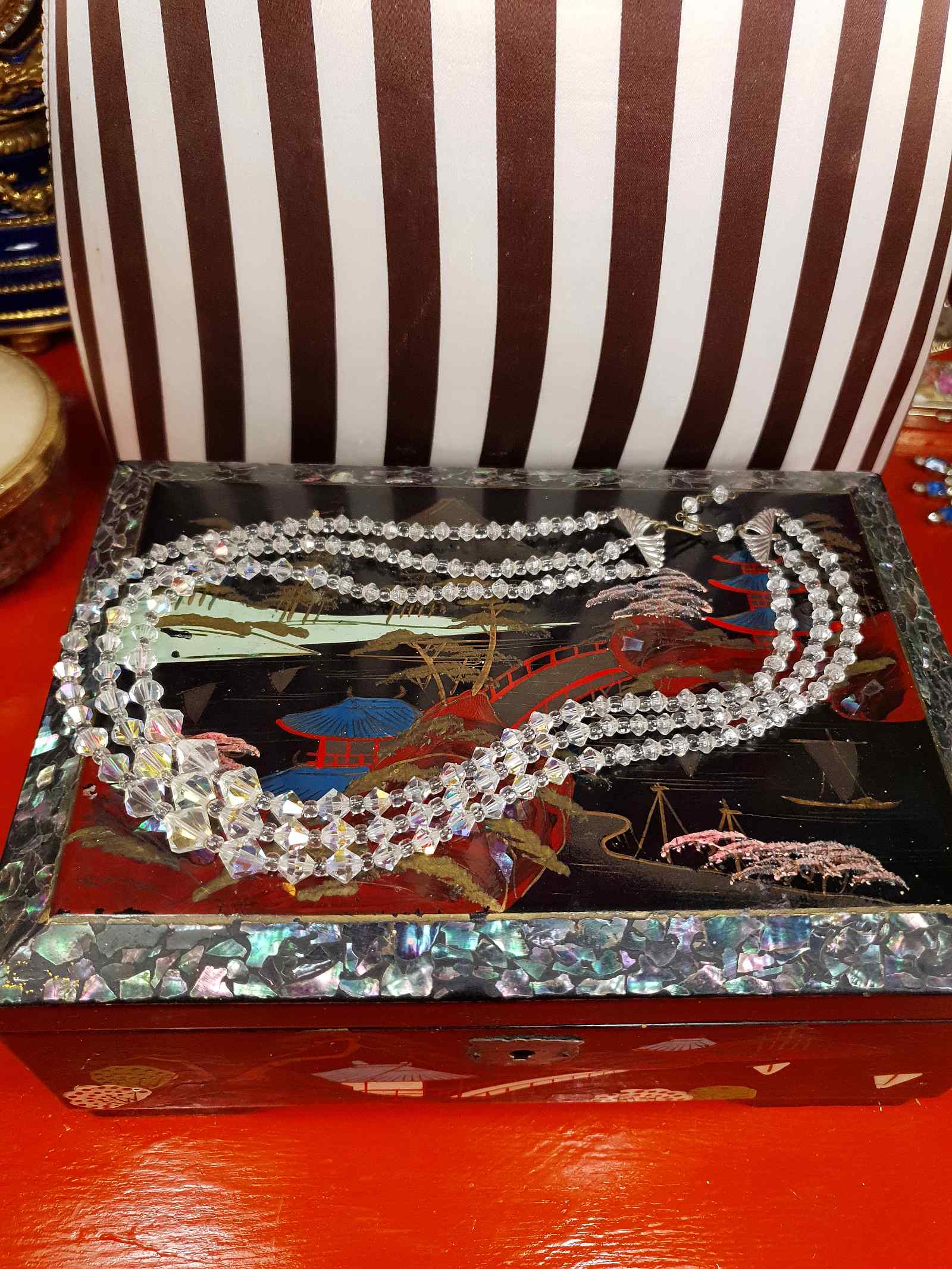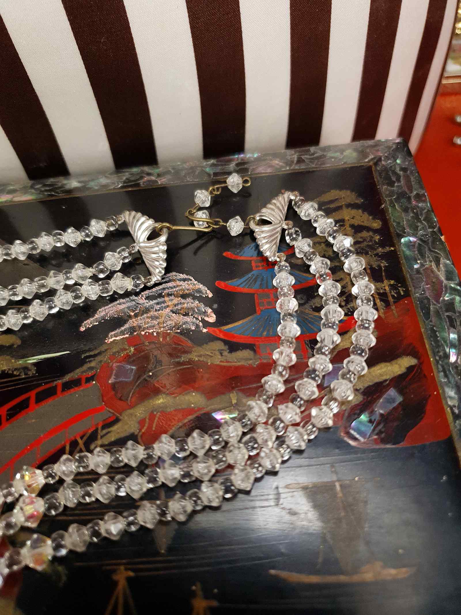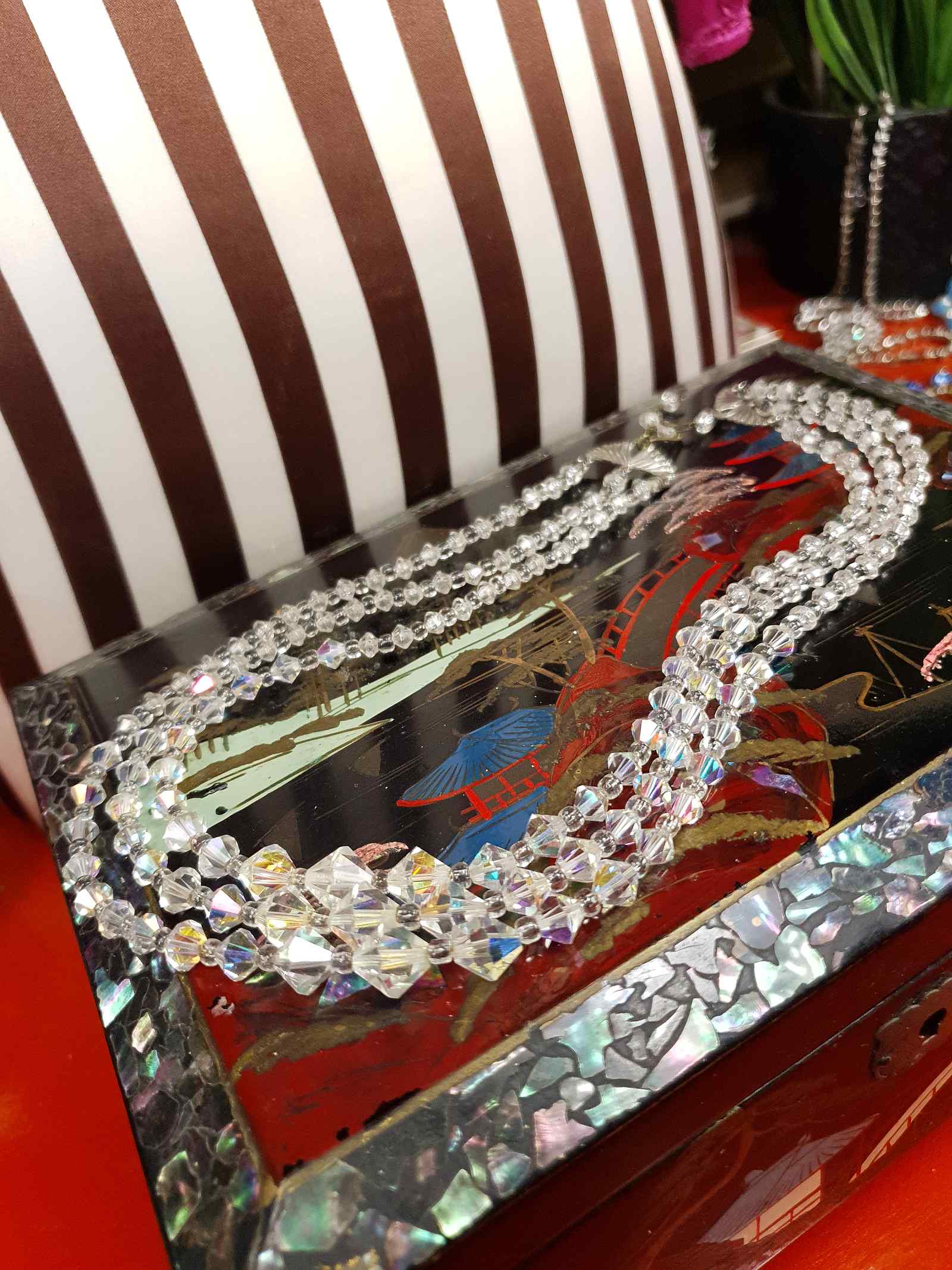 Stunning three-strand 60s necklace featuring Aurora Borealis crystal beads. Each faceted bead catches light with mesmerising rainbow iridescence, creating an enchanting play of colour. Interspersed with silver glass beads. silver-tone metal ornate fan clasp detailing.