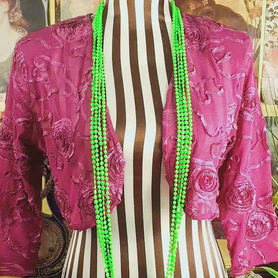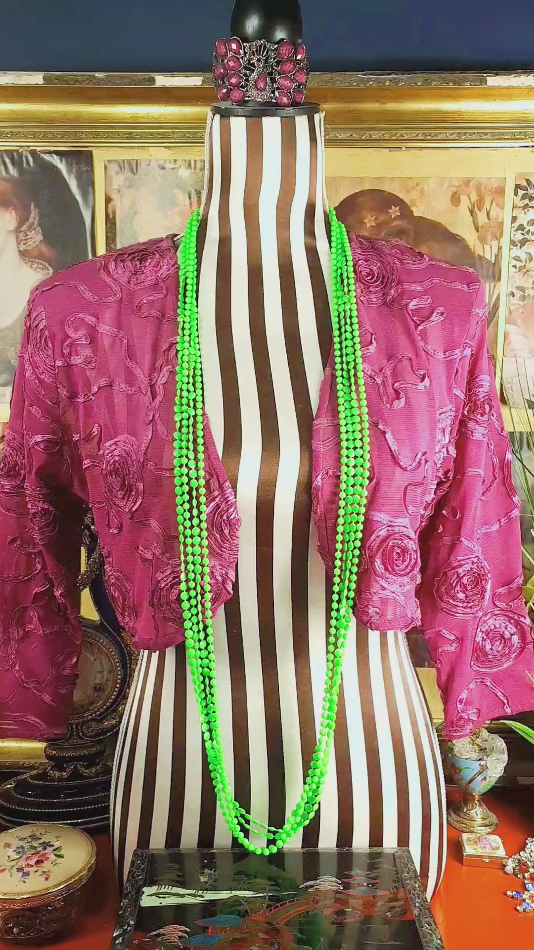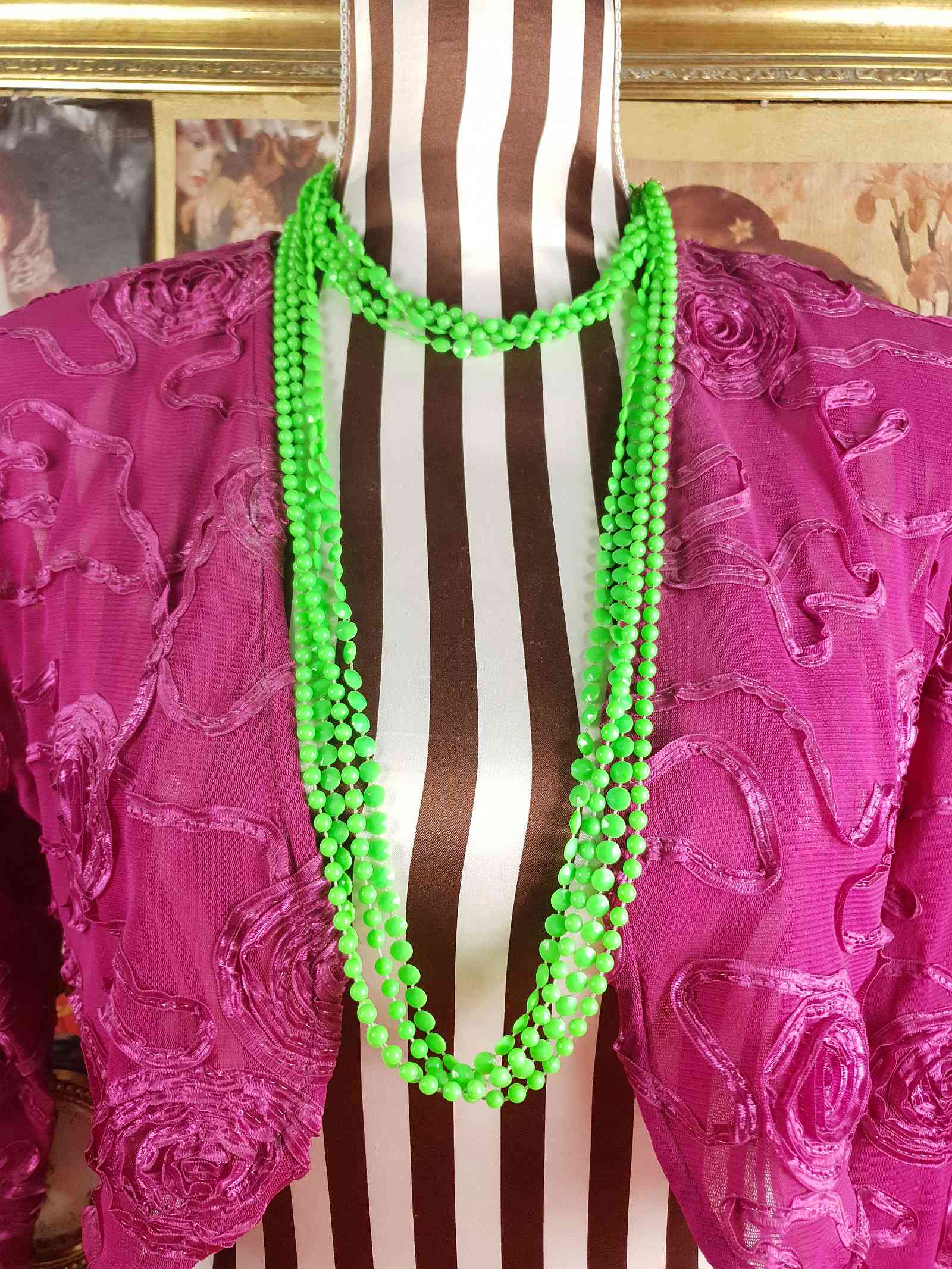 Make a bold statement with this striking vintage 60s mod necklace. Four strands of lime green lightweight plastic beads cascade down in a versatile design that captures the spirit of the swinging sixties. Wear long or doubled in various ways. A genuine piece of fashion history that brings colour and personality to your jewellery collection. Hong Kong signed.