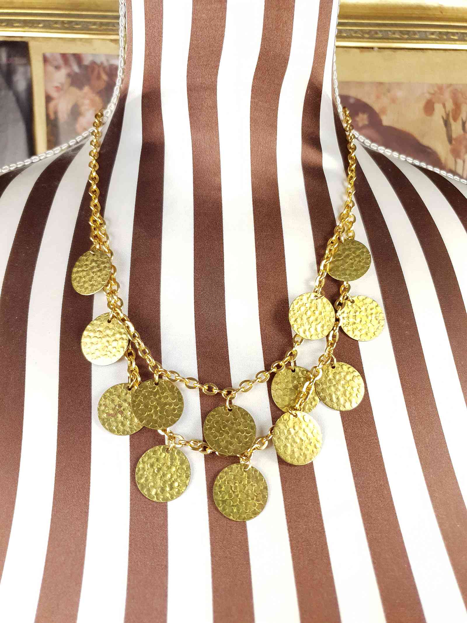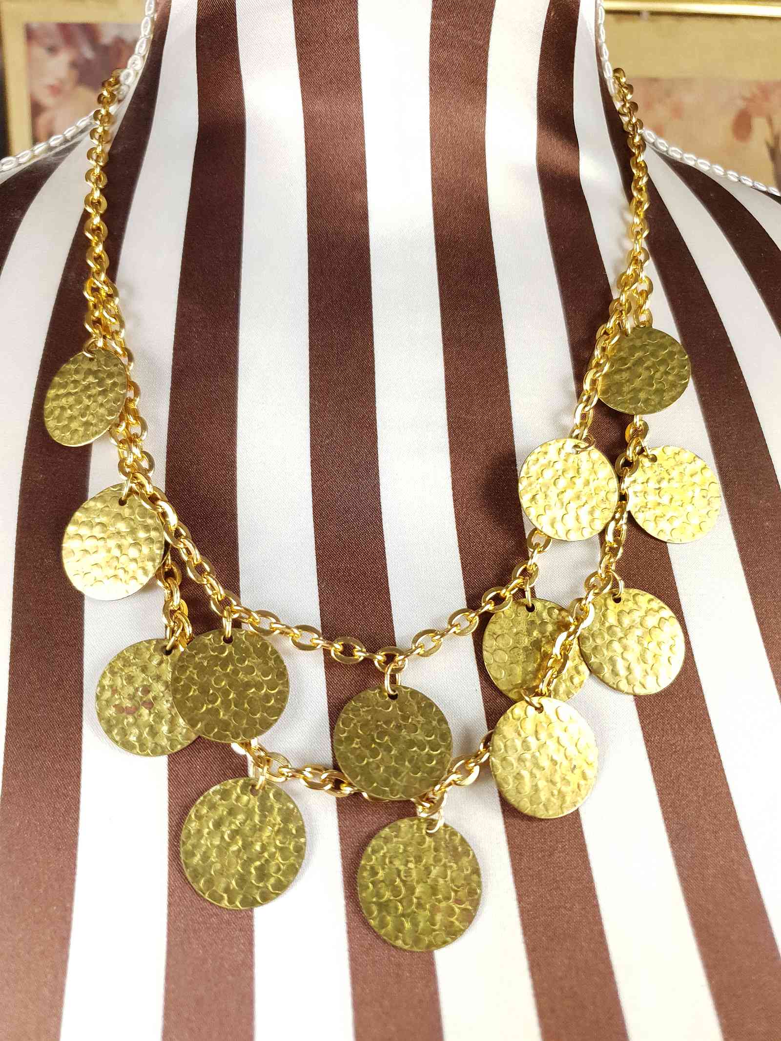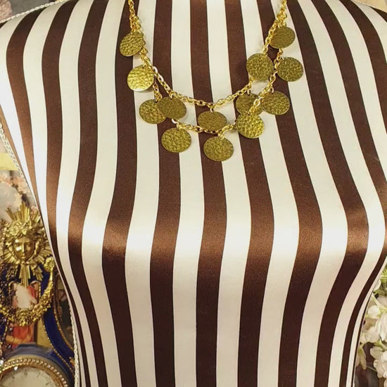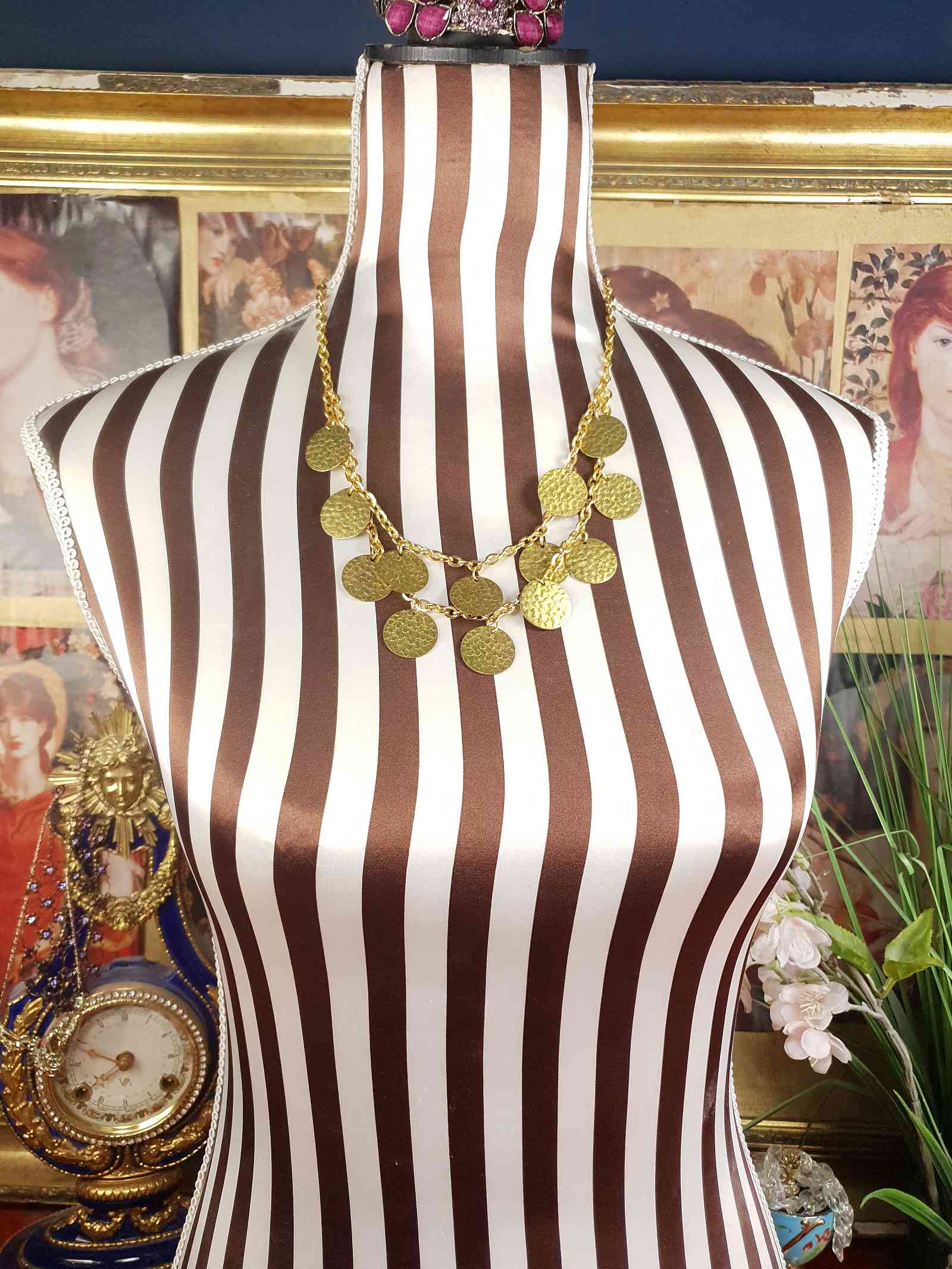 This 60s treasure features hammered gold-tone metal disc medallions that catch the light beautifully, arranged over two layered tiers and suspended on a belcher link chain.