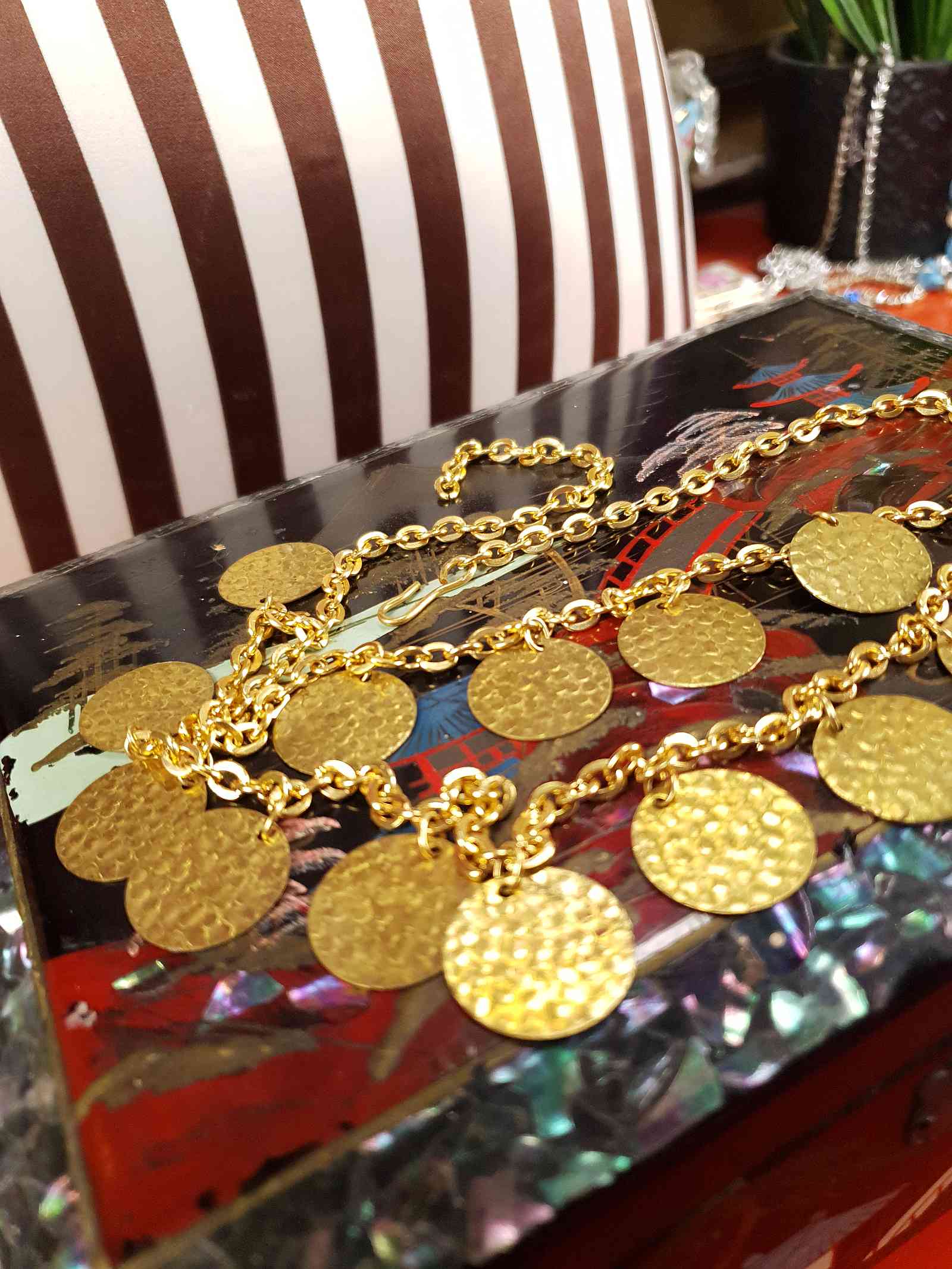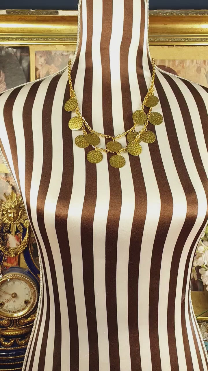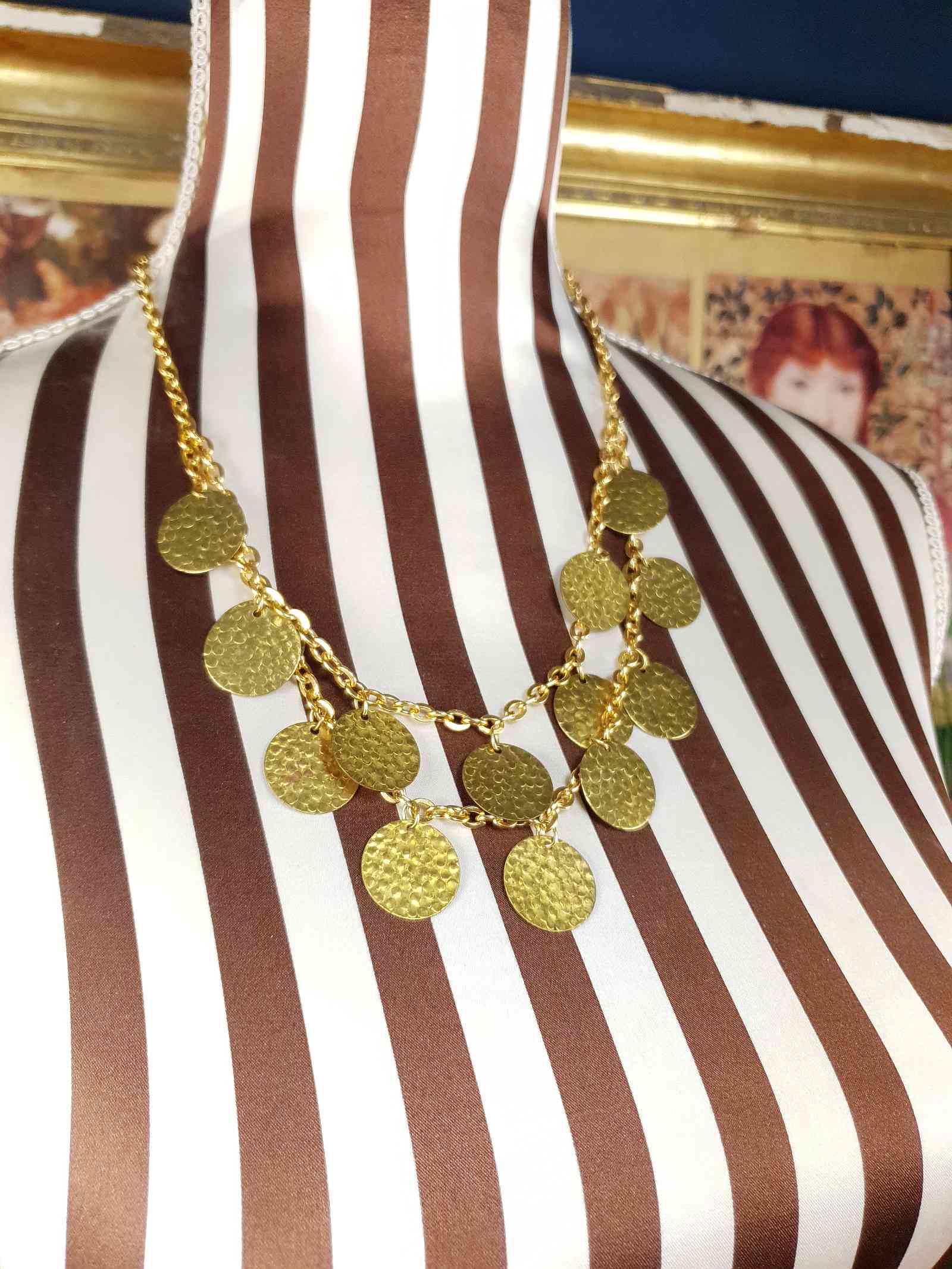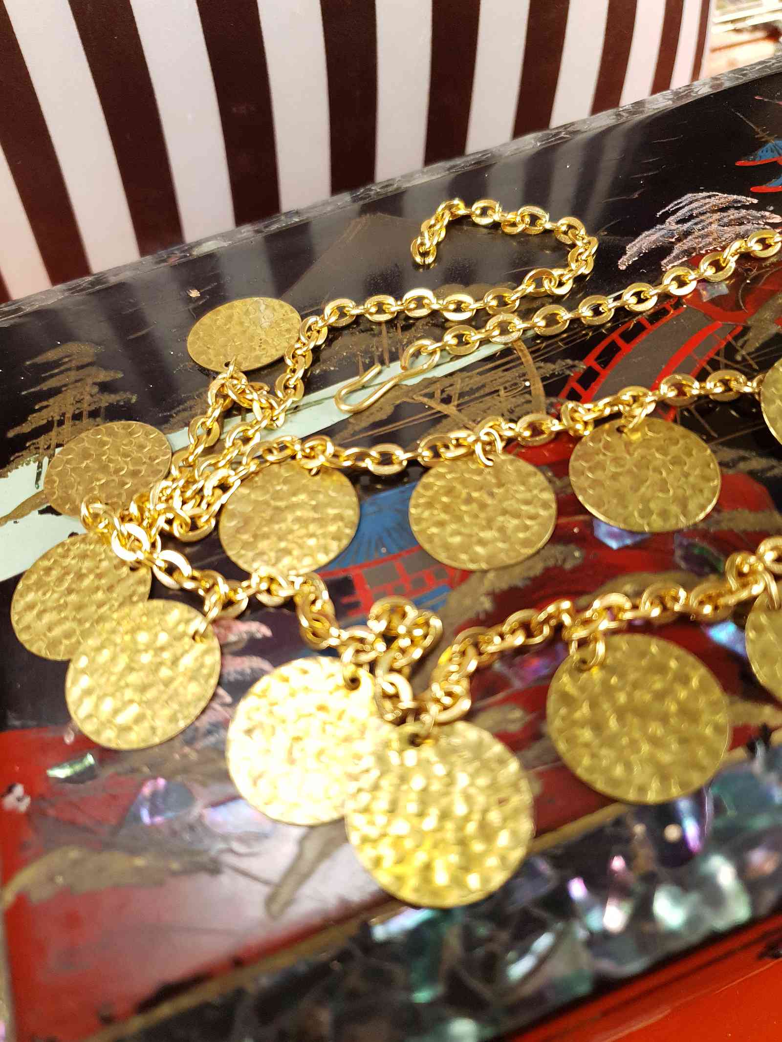 This 60s treasure features hammered gold-tone metal disc medallions that catch the light beautifully, arranged over two layered tiers and suspended on a belcher link chain.