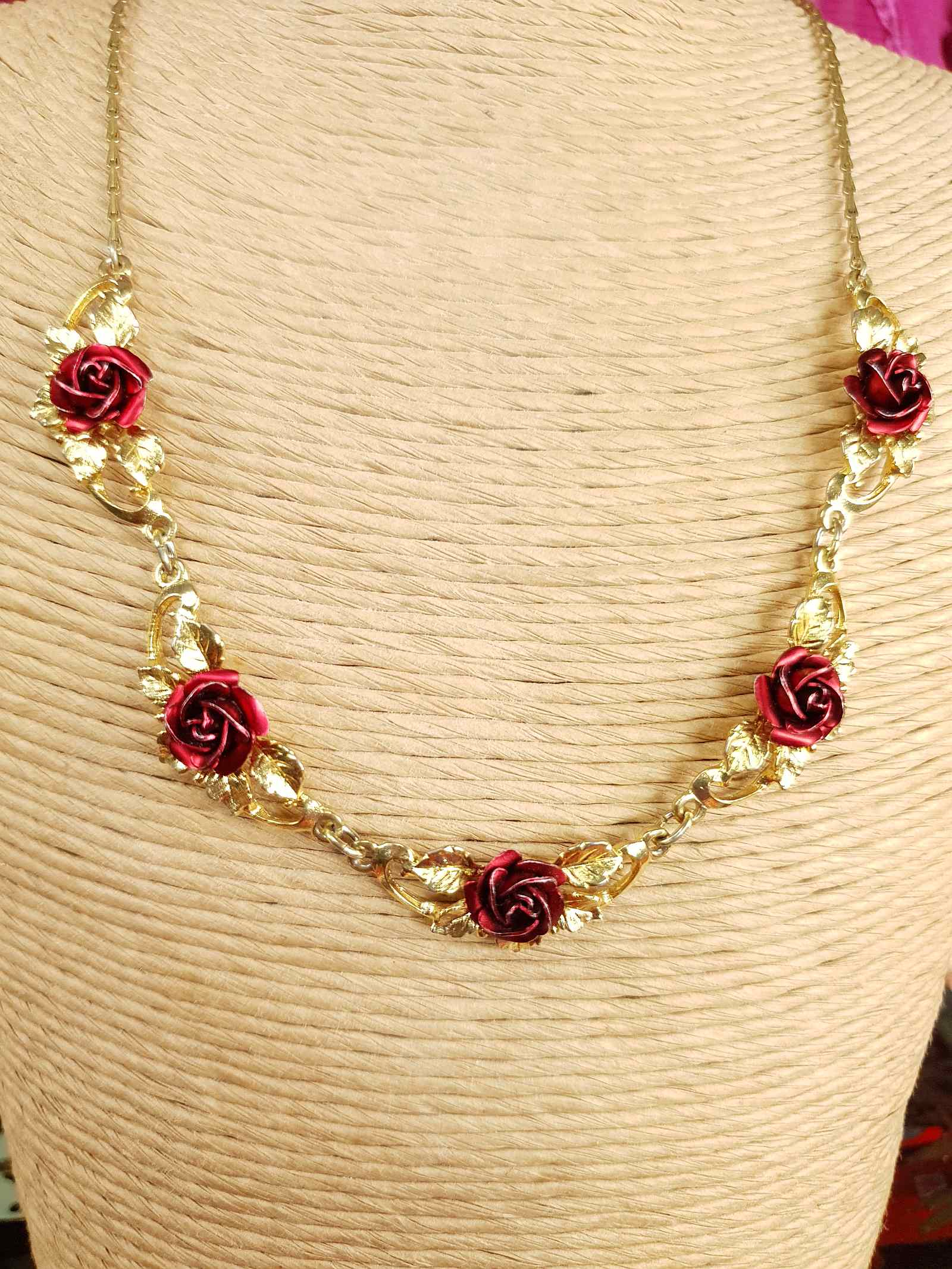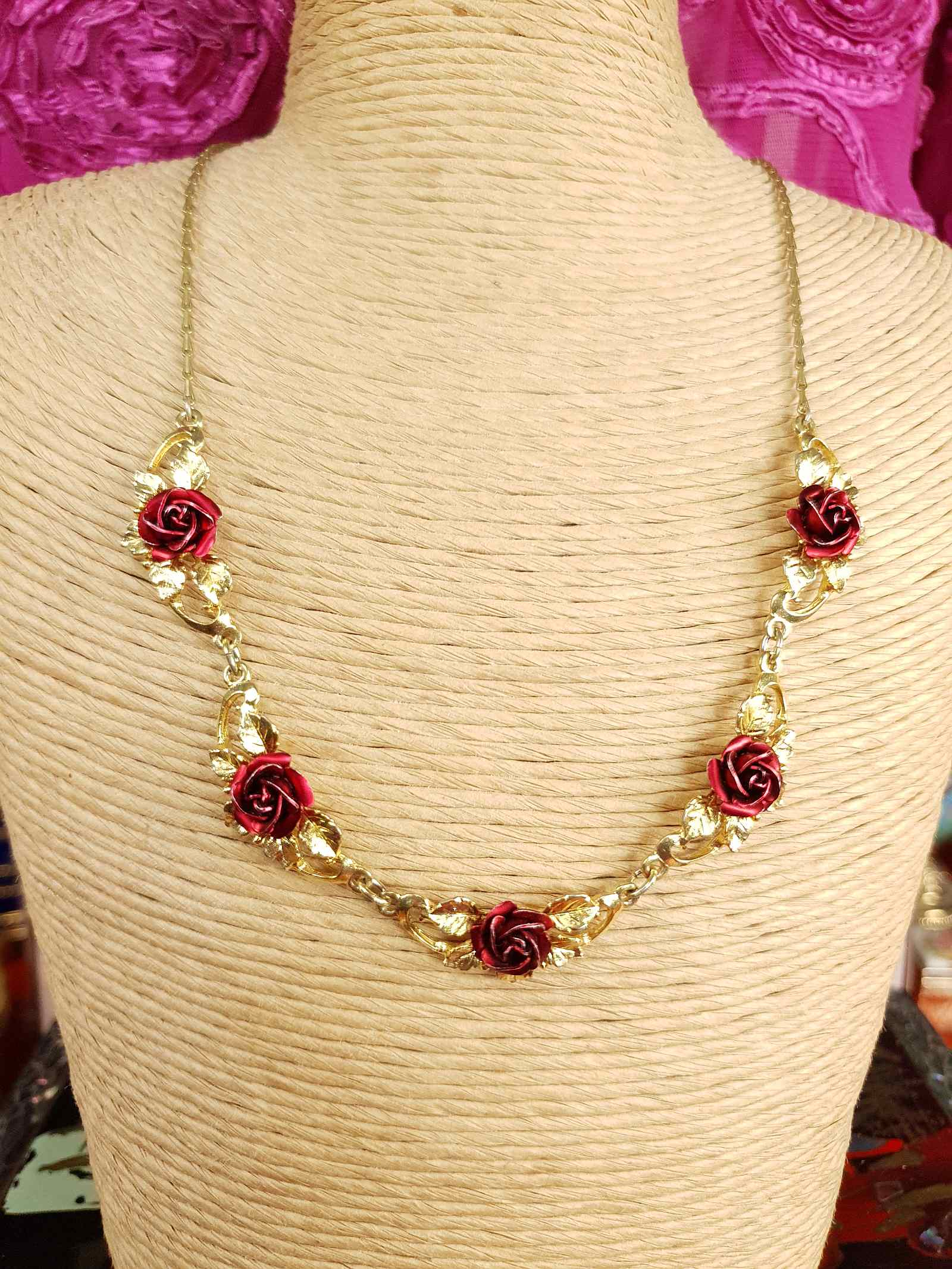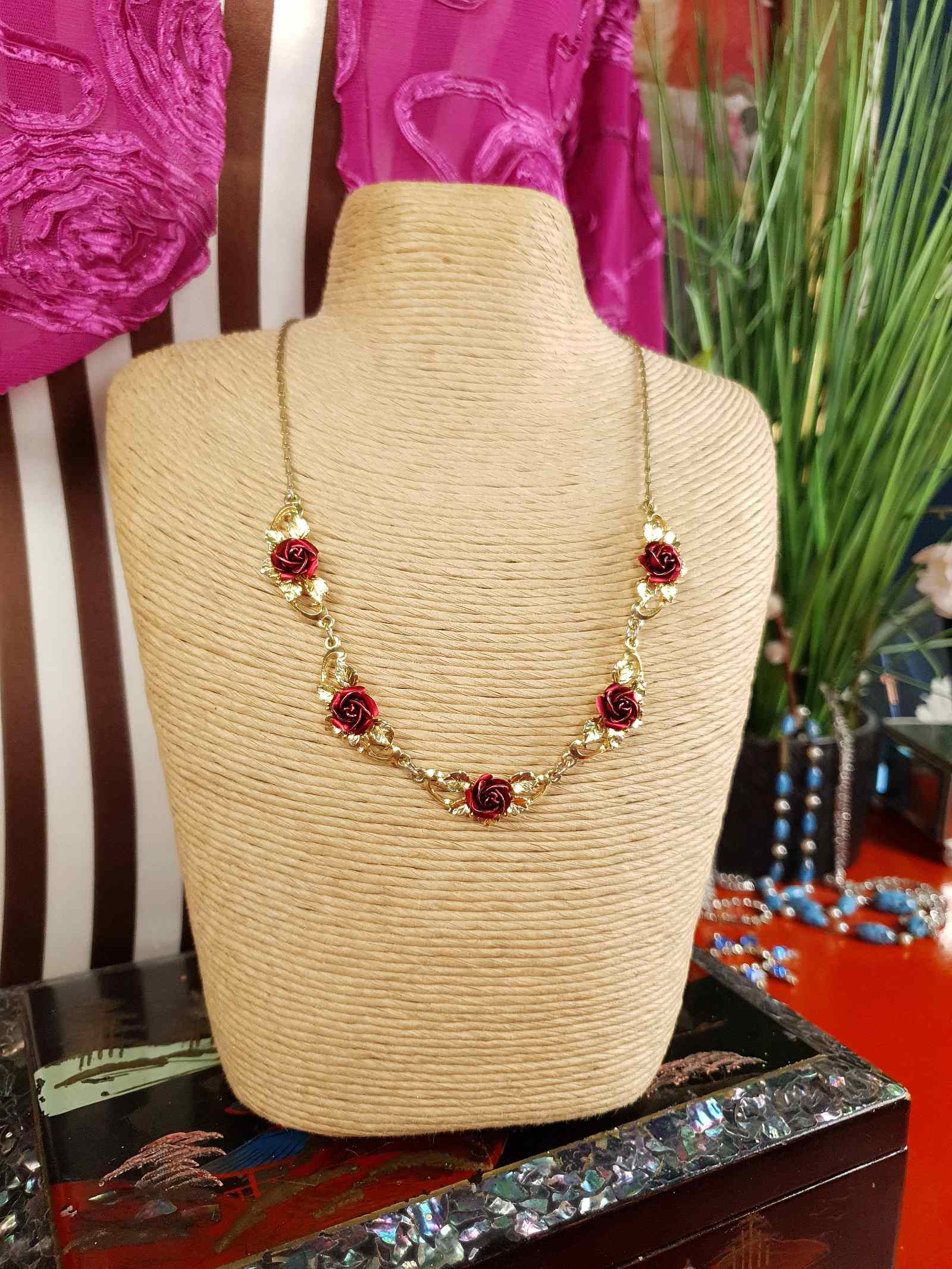 A beautiful vintage 70s red rose choker necklace surrounded by gold-tone leaves. Add some botanical elegance to your vintage jewellery collection.