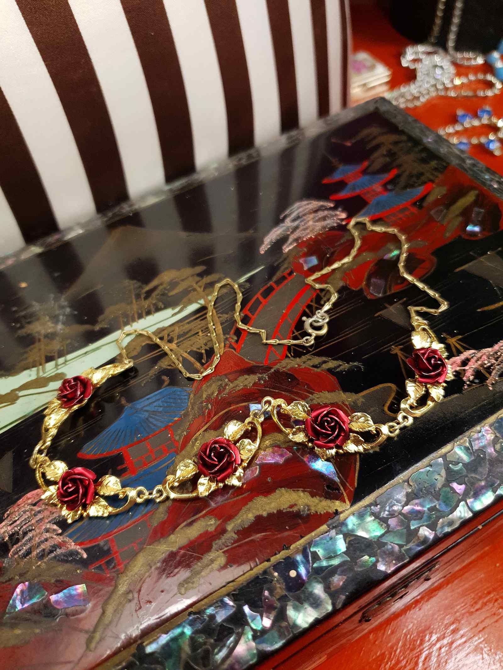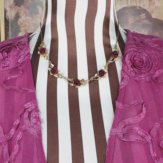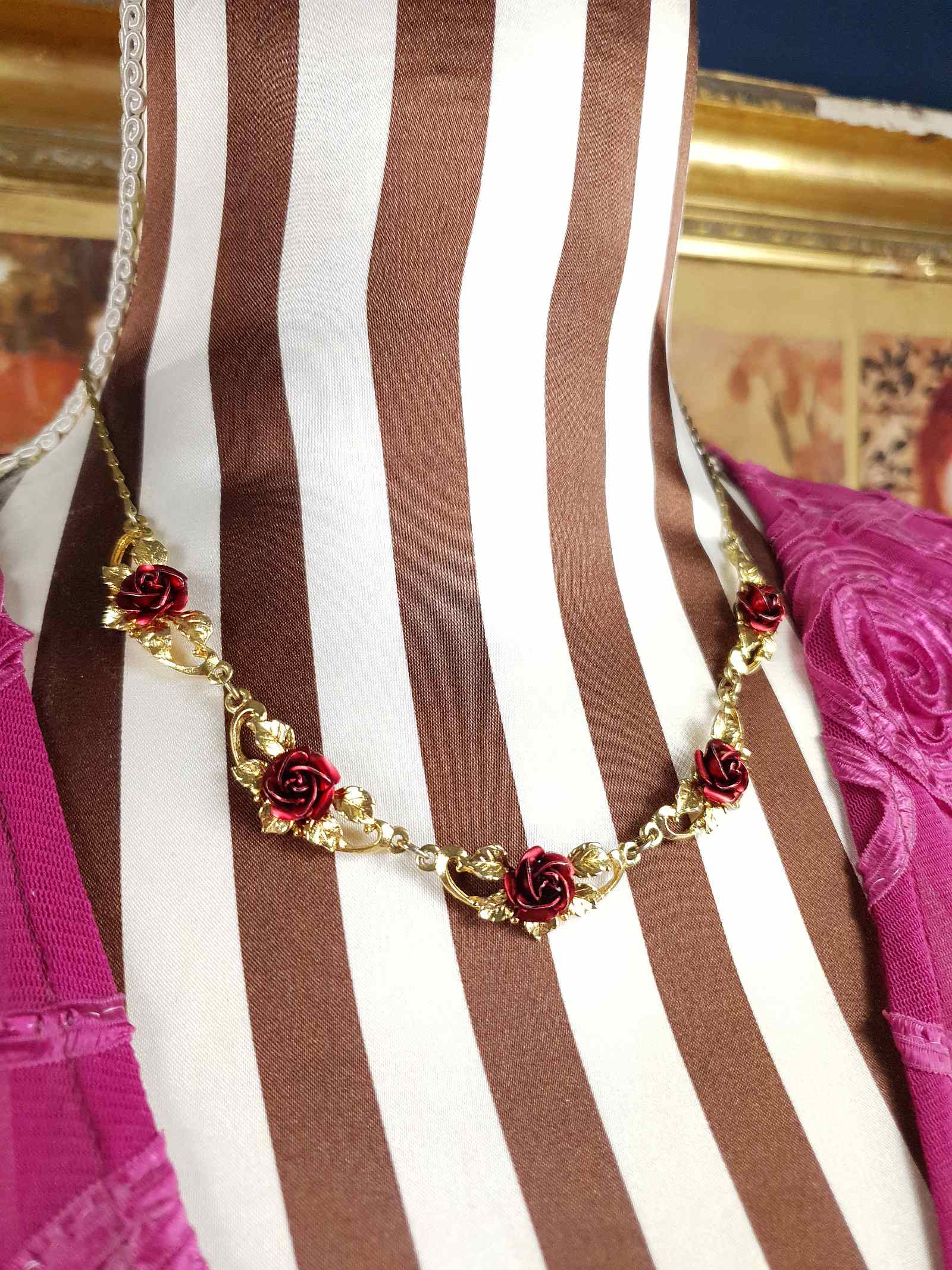 A beautiful vintage 70s red rose choker necklace surrounded by gold-tone leaves. Add some botanical elegance to your vintage jewellery collection.