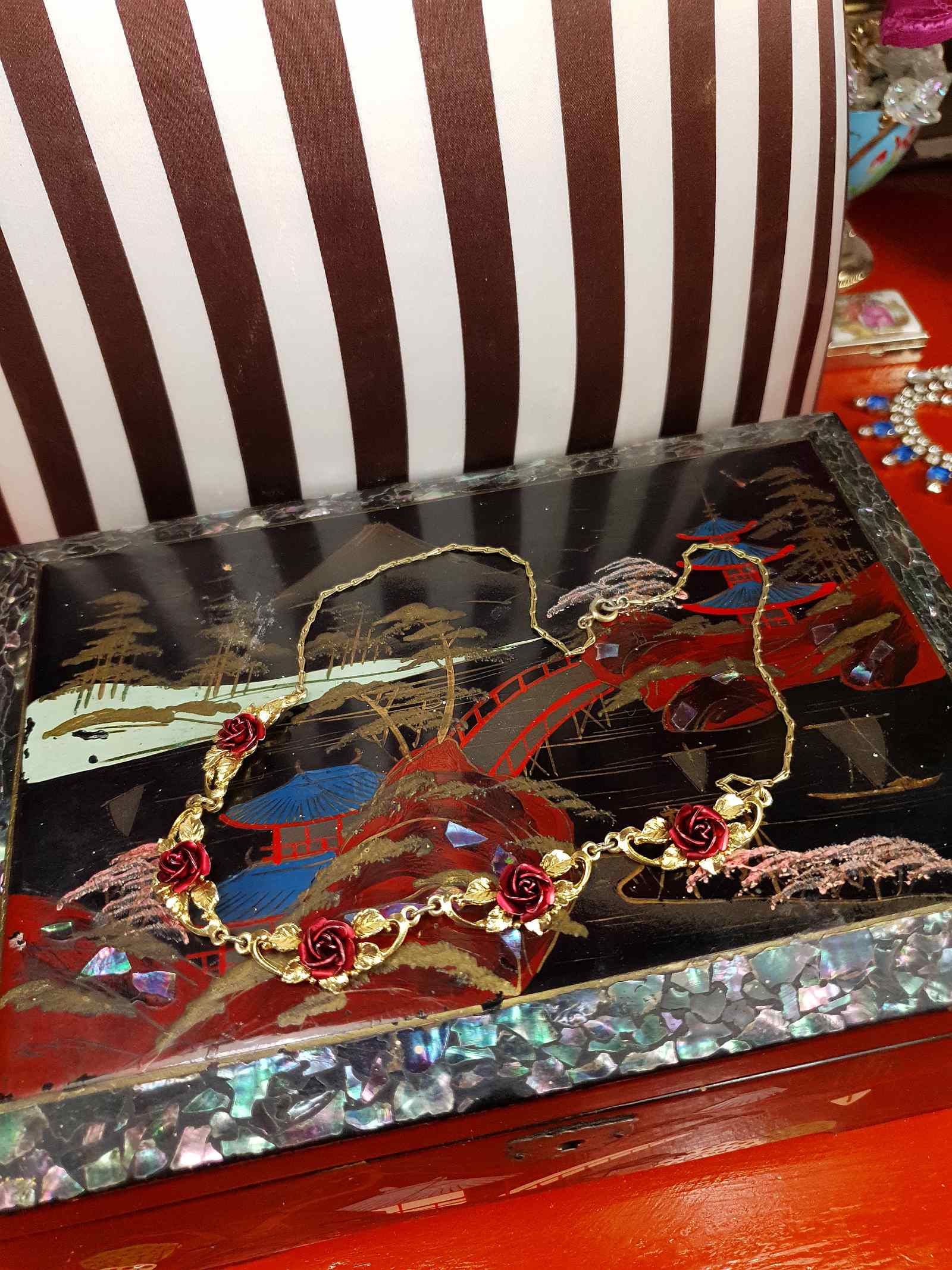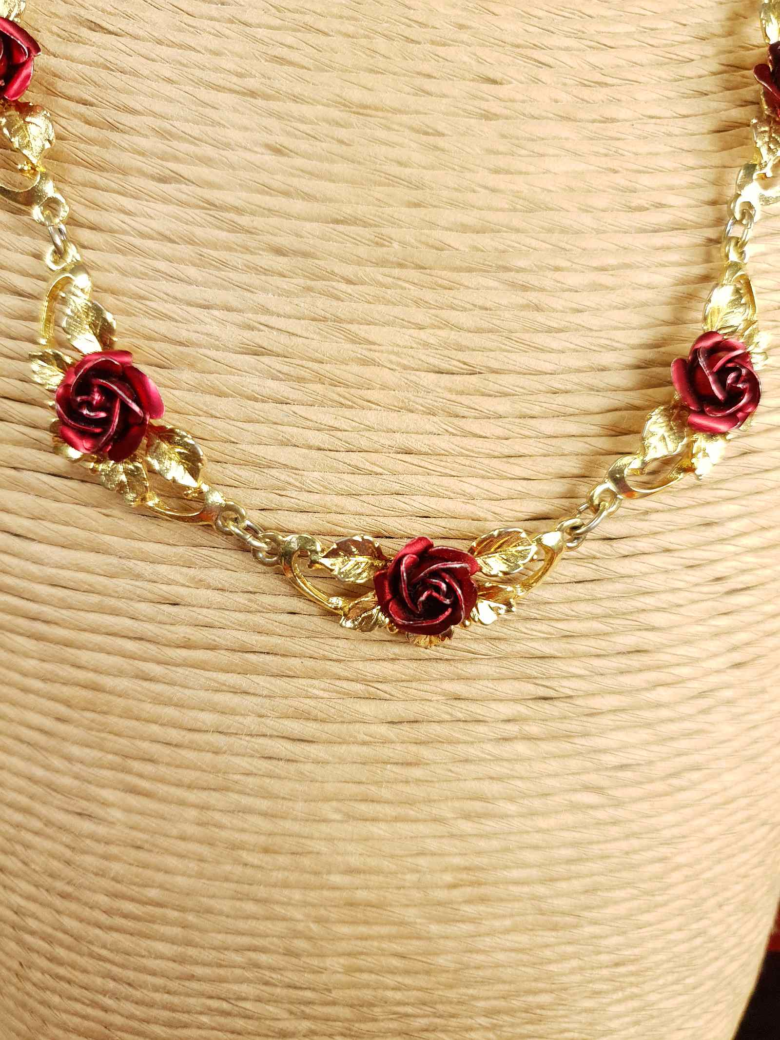 Vintage 1970s Red Rose Necklace Choker Flower Floral Gold-Tone