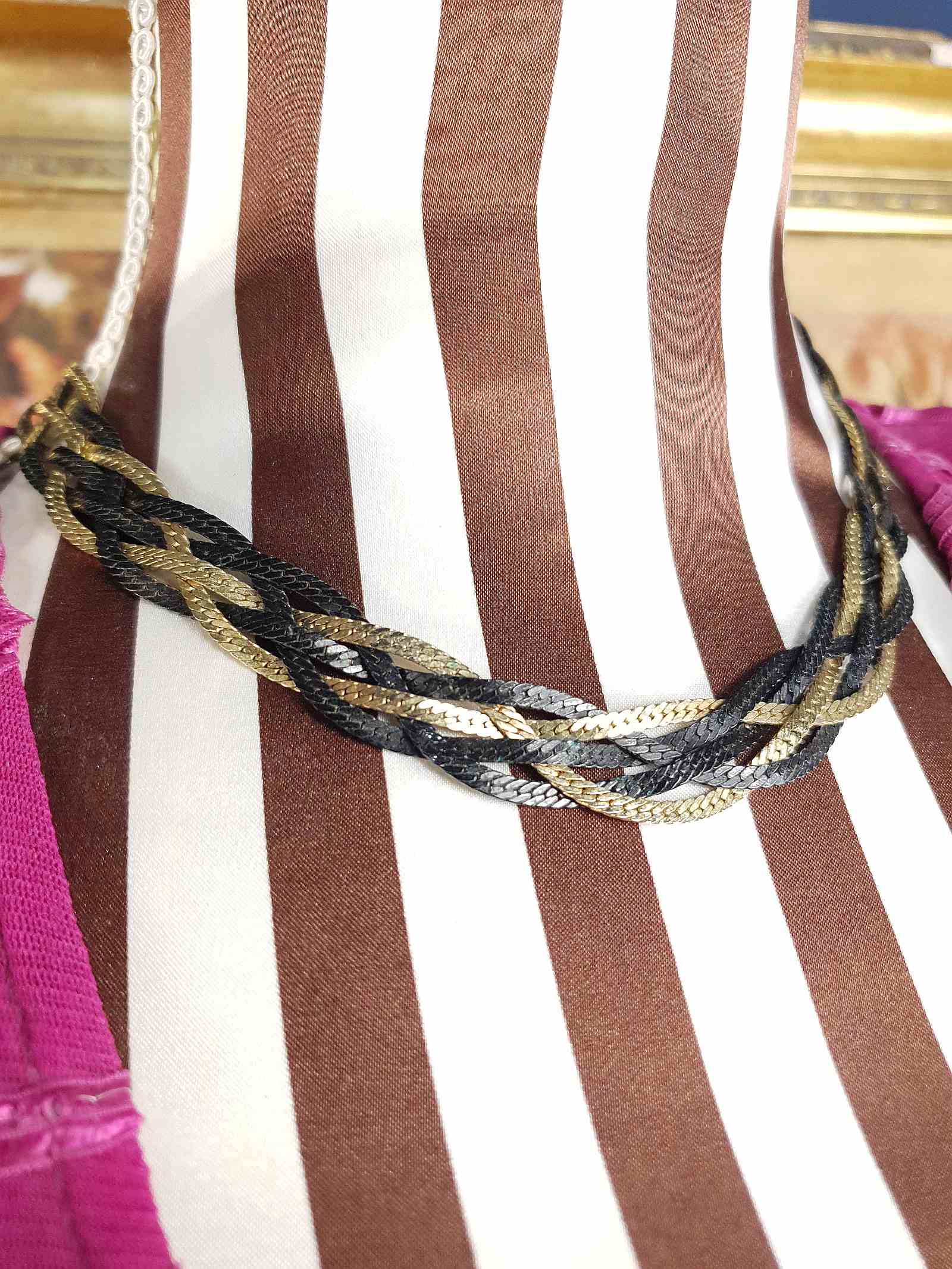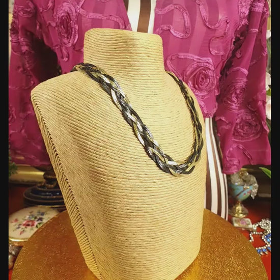 This striking vintage 70s choker necklace features a sleek black and gold-tone plaited design that captures the essence of disco-era glamour. The interlocking strands create texture and movement and catch the light beautifully