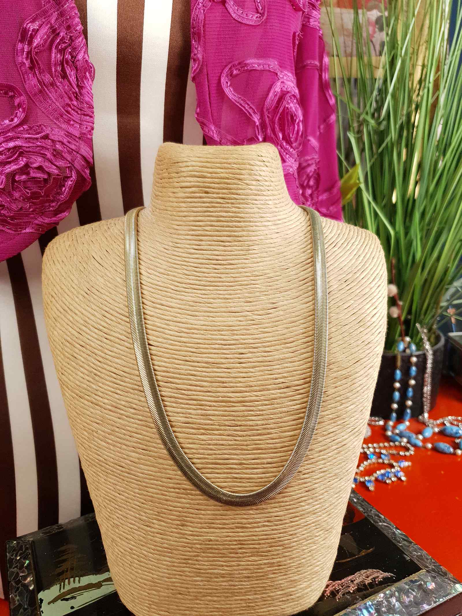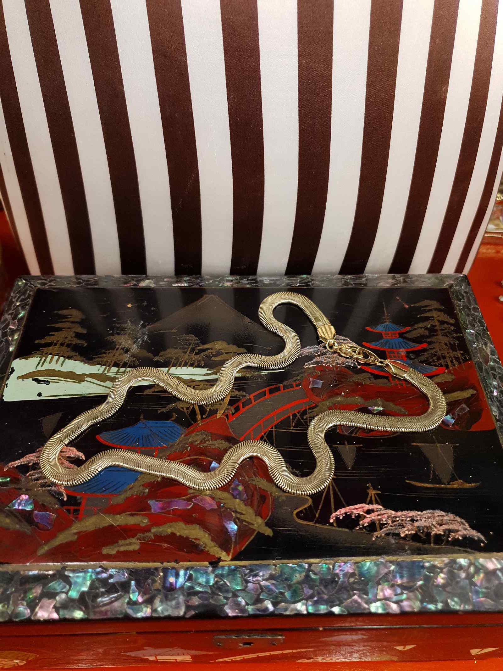 Own a piece of 1980s Marks & Spencer nostalgia with this vintage snake chain choker in a gold tone. Stamped with the M & S mark, it reflects the quality and style that defined the decade. The interlocking snake chain design offers a refined look that transitions effortlessly from day to evening wear. Perfect for vintage enthusiasts or anyone seeking an authentic retro accessory with genuine character and timeless appeal.