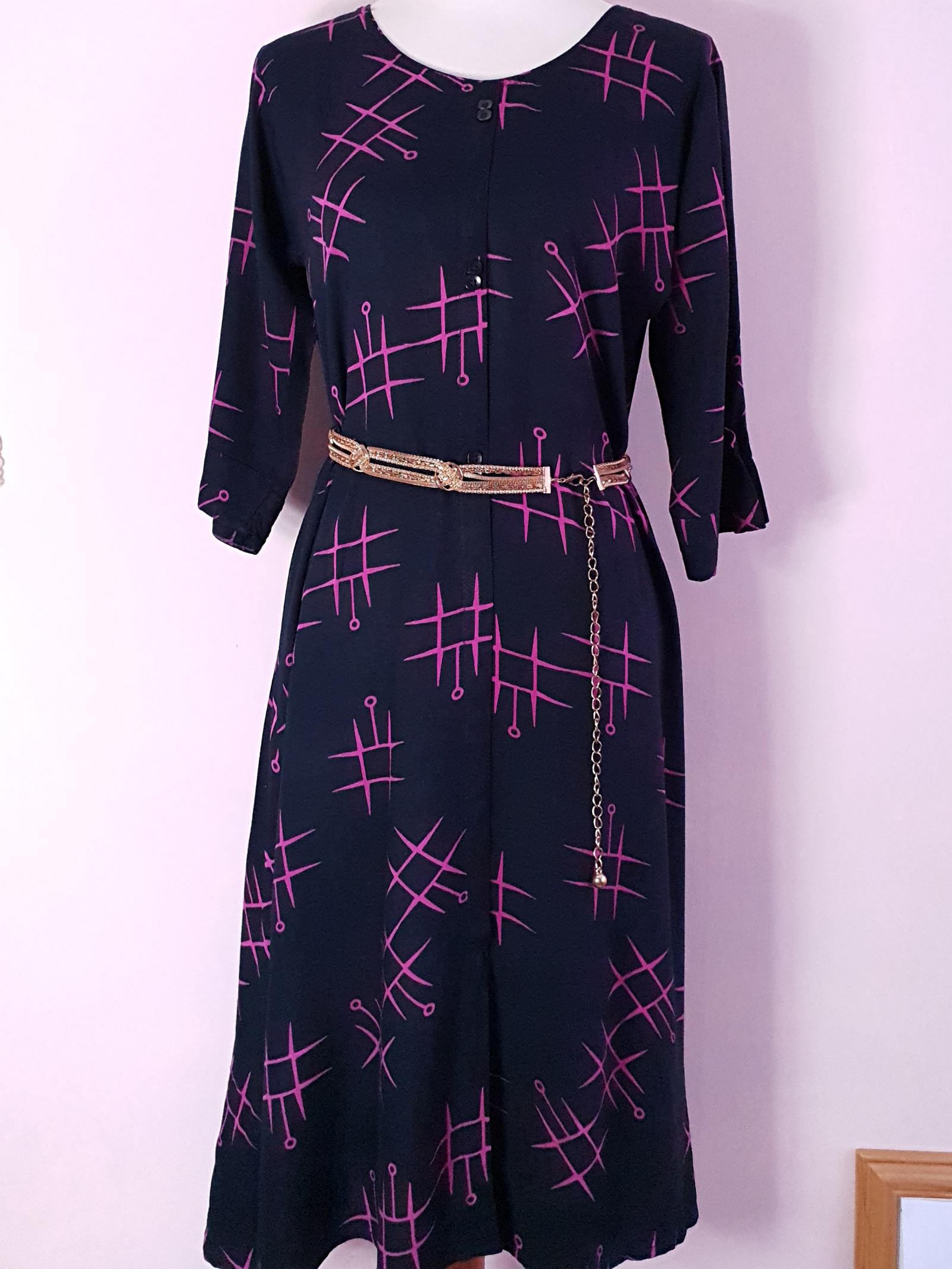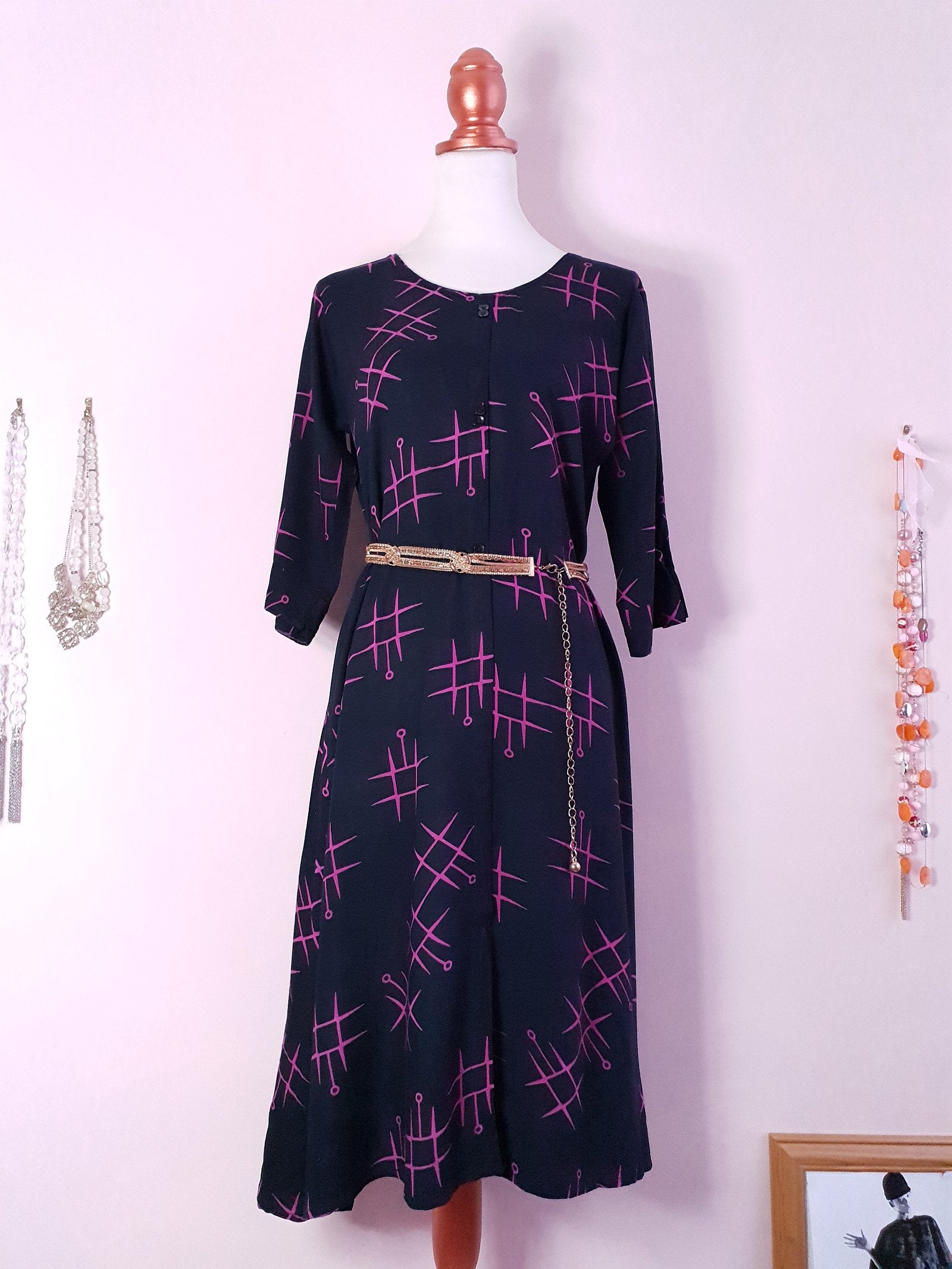 This dress is the perfect blend of retro and chic! Its pre-loved style has a bold geometric "crisis cross" pattern in cerise against a classic navy background, while the front button closure makes it simple and stylish. Style with a belt (not included) or hang loose!
