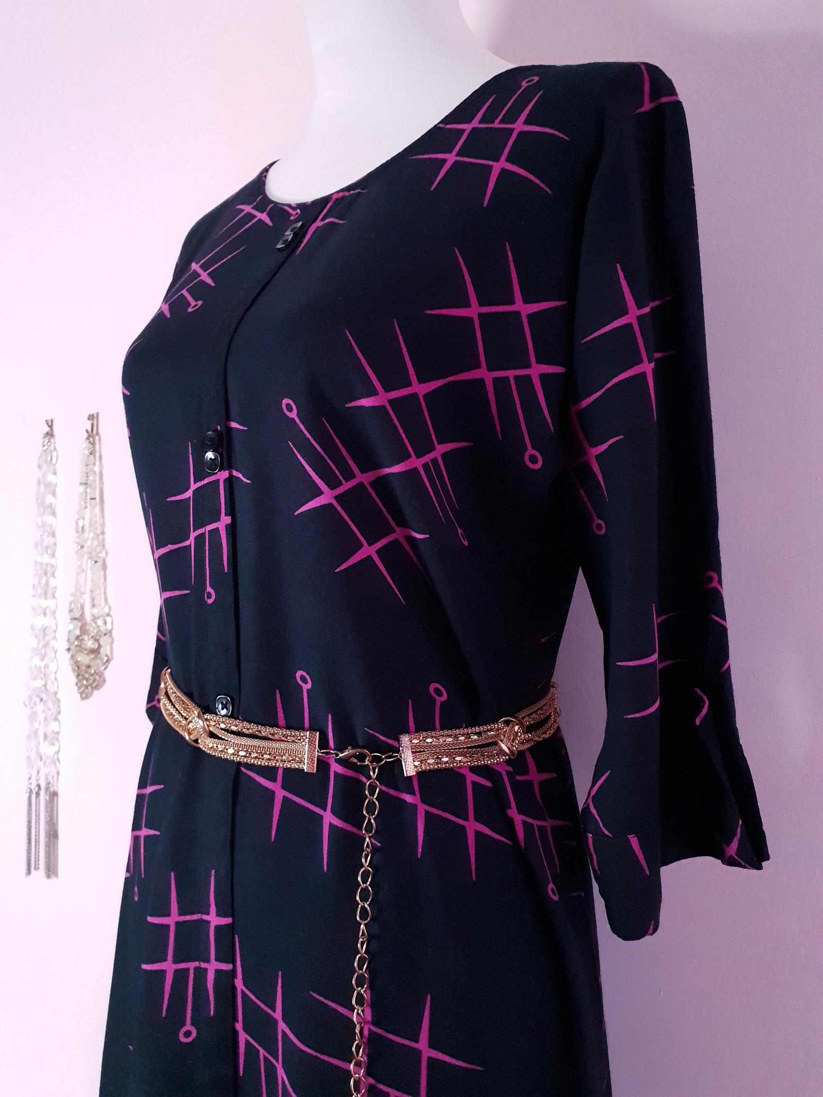 Pre-Loved 1980s Navy and Cerise Geometric Print Dress - Size 16