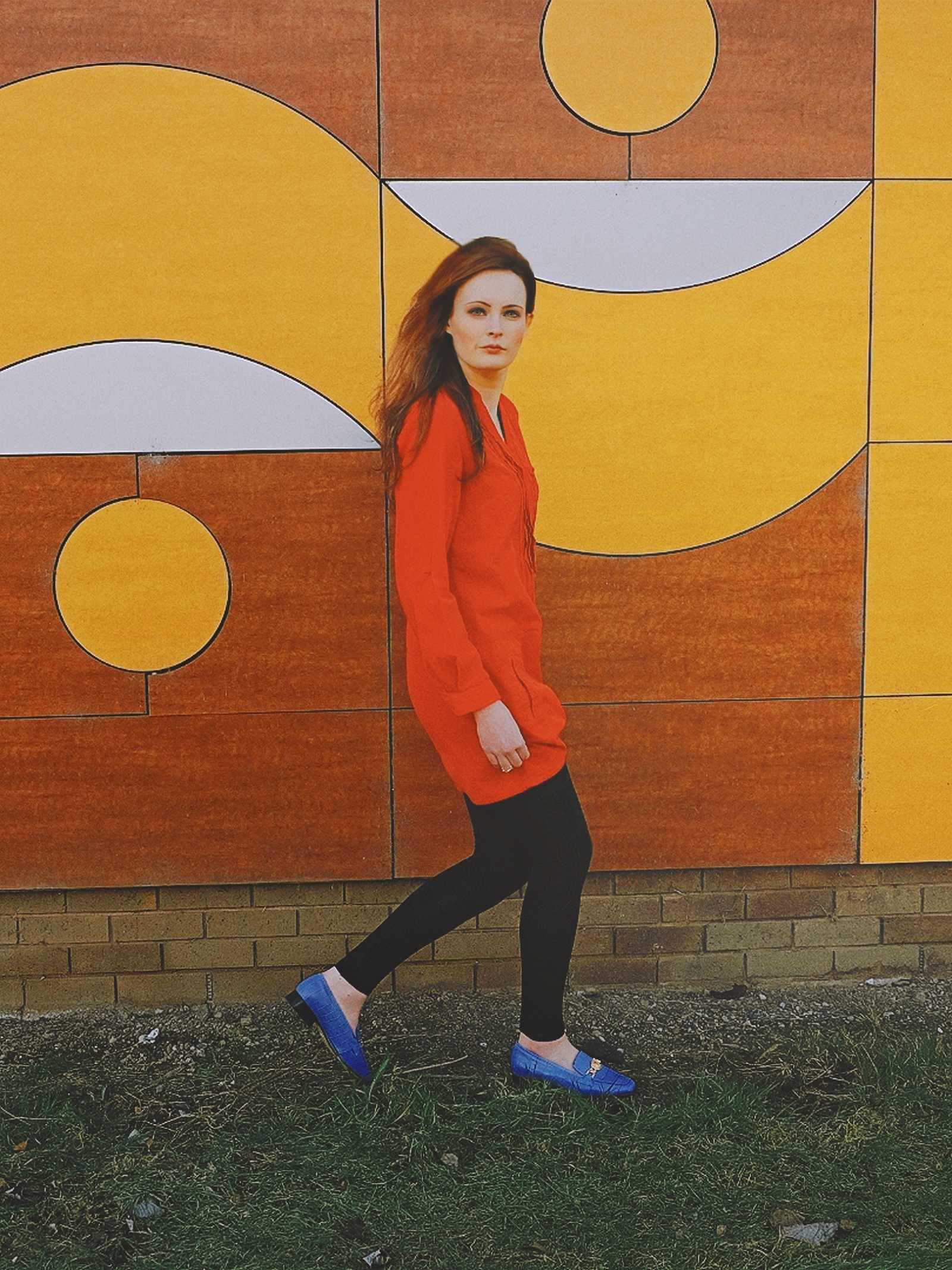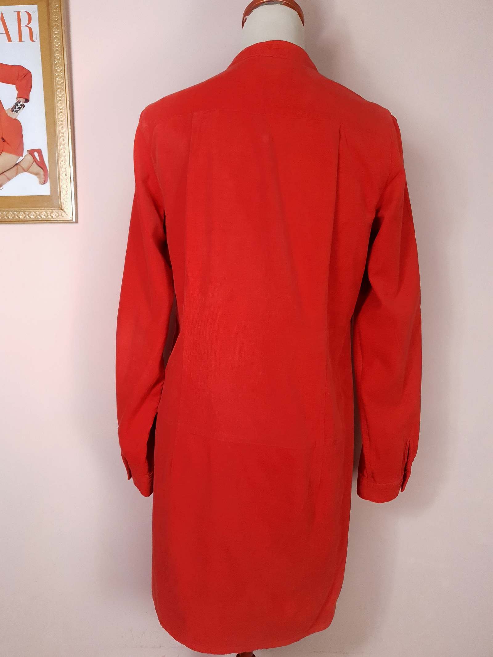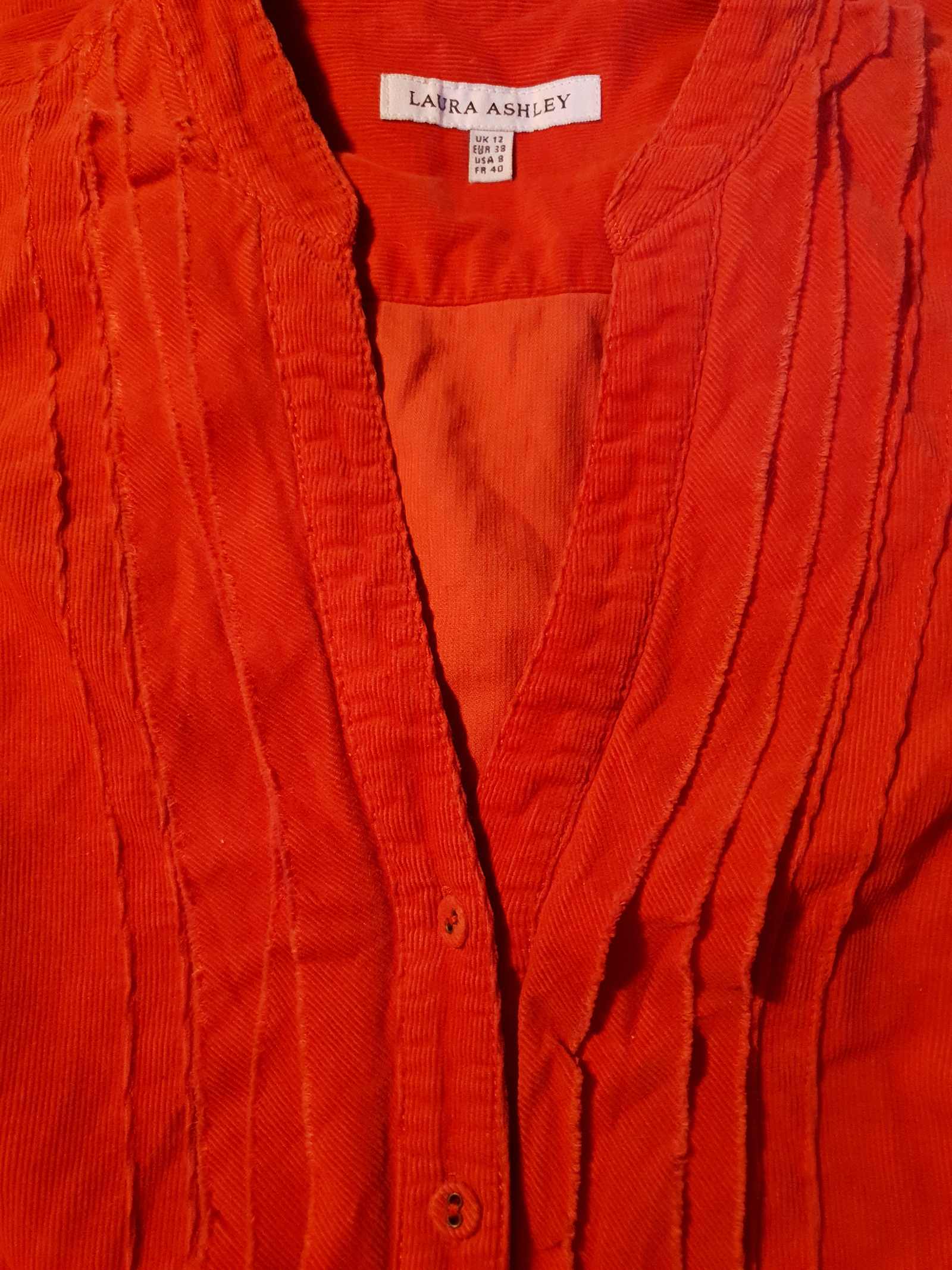 This pre-loved Y2k Laura Ashley dress is made from a soft, fine orange corduroy cotton fabric. Its unique ruffle layered detail on the neckline and fabric-covered buttons on the front closure and cuffs provide an elegant finishing touch. It also features two pockets.