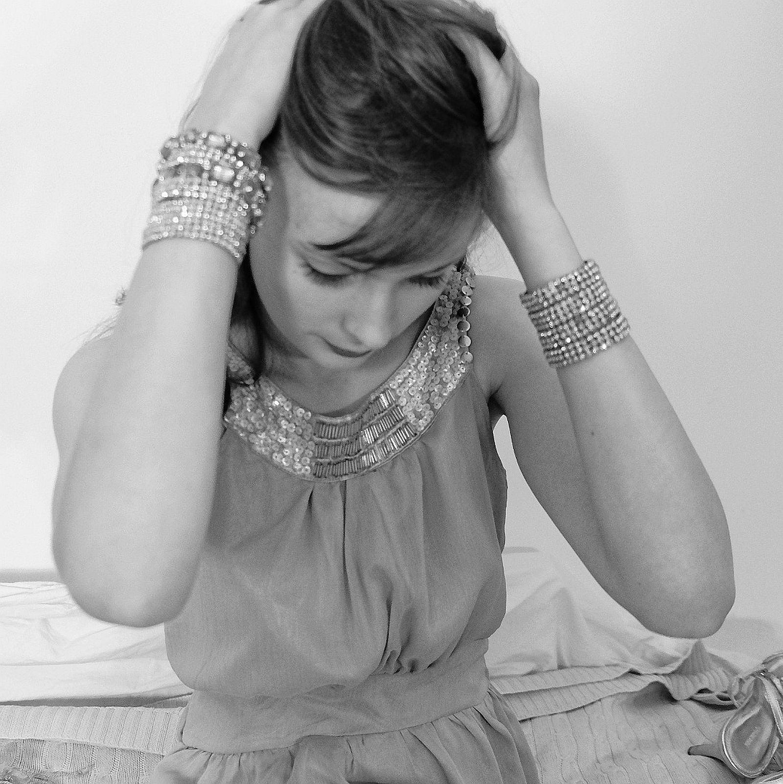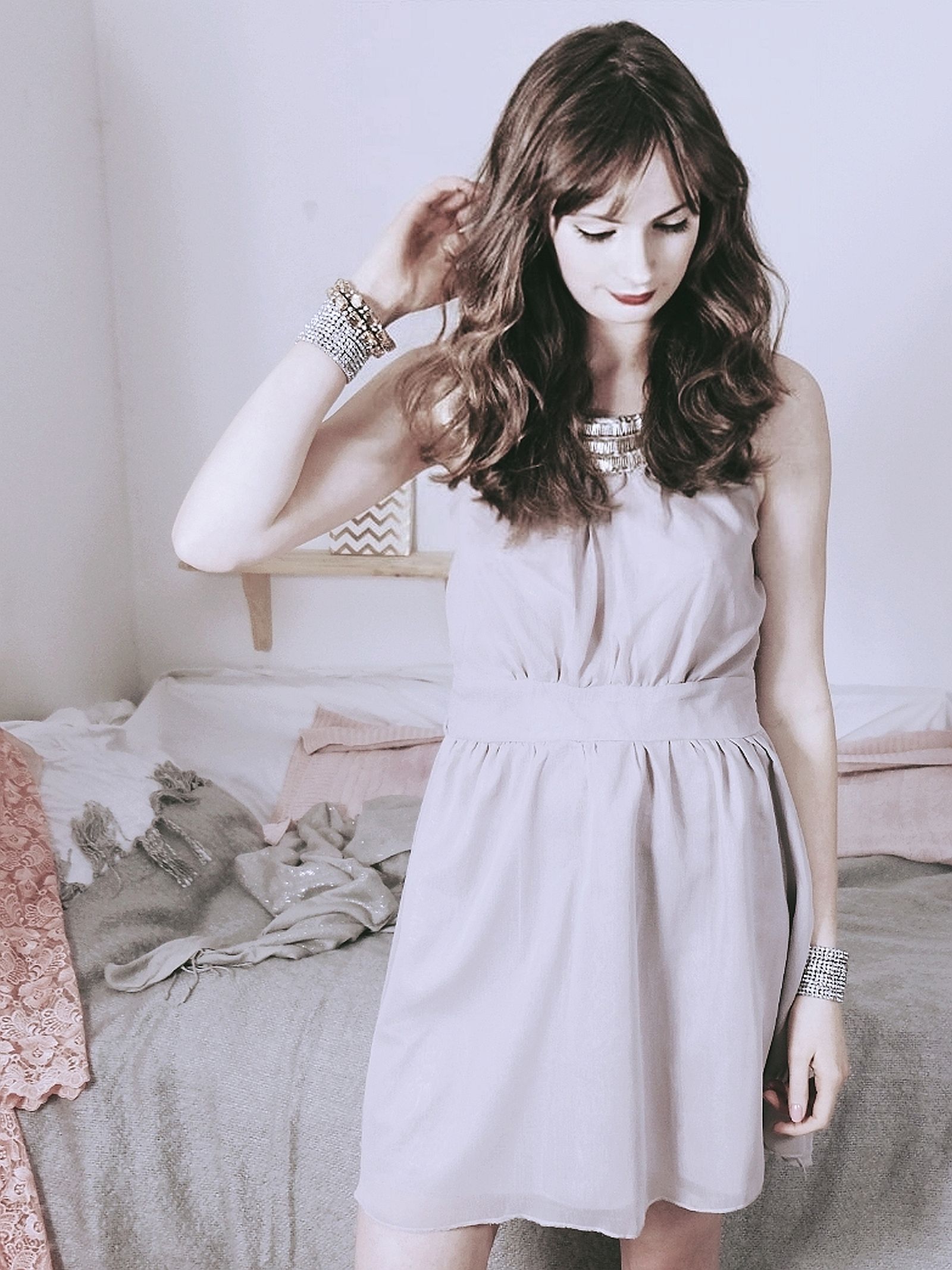 This dreamy soft grey chiffon sleeveless dress features an eye-catching sequin and bead rounded neckline, satin lining and waist tie back.