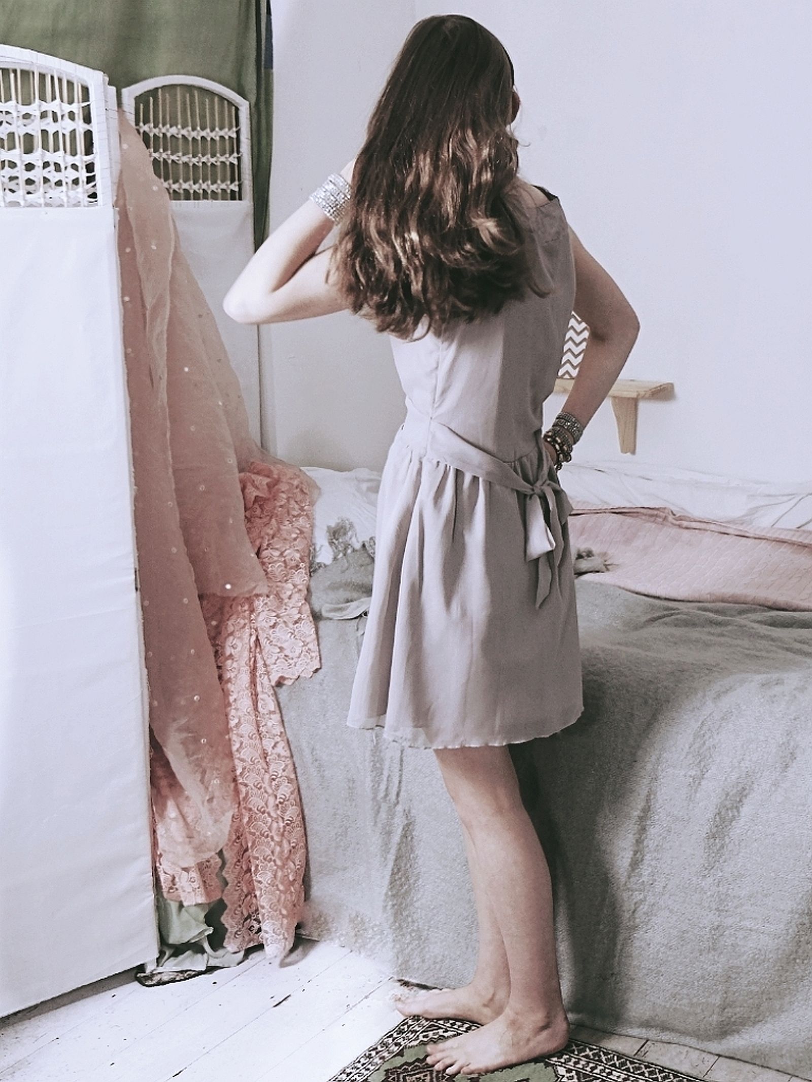 When measuring garments at Jardin Vintage, we take the following measurements with the garment laid flat. The height is measured from the collar to the hem. The bust measurement is taken by measuring from underarm to underarm and then doubled. The waist measurement is taken from side to side and then doubled. All measurements are given in inches.