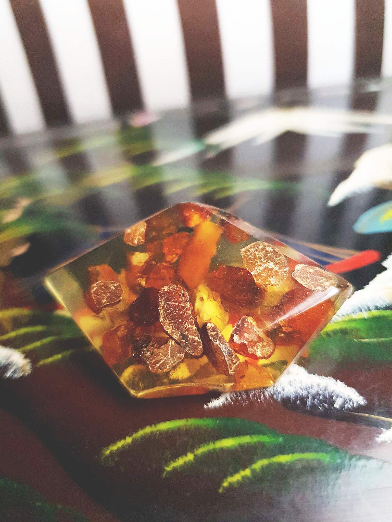 A beautiful and wearable collector's piece, this 1920s art deco brooch features a bezel-cut slice of pale yellow amber (which glows green with a black light). The natural deeper orange and russet amber pieces and inclusions within the slice give the brooch a beautiful organic feel. Signed Met. C clasp closure.