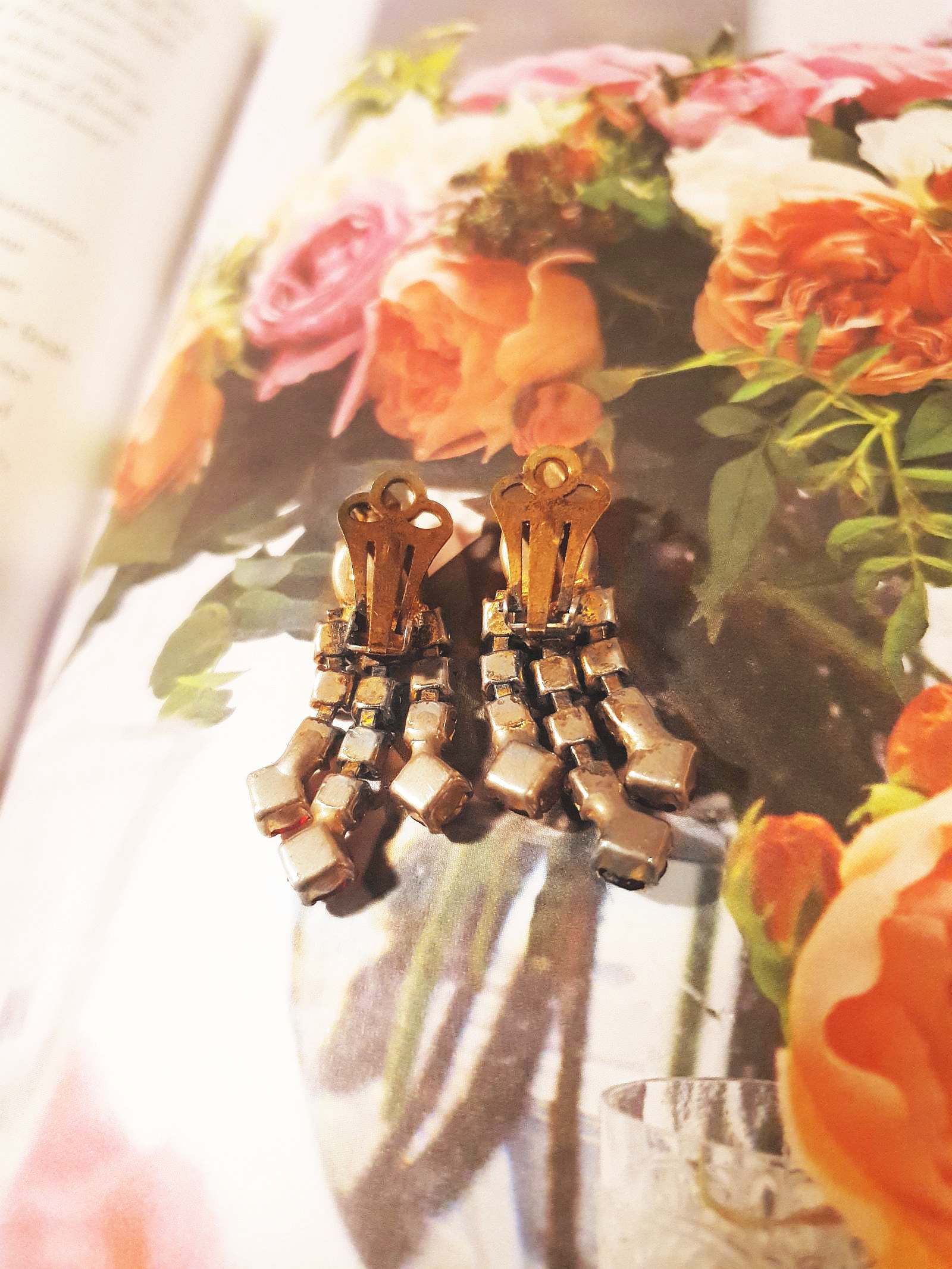 Experience the glamour of the Art Deco era with these gorgeous vintage 30s clip-on earrings. Made with deep red faceted glass prong set rhinestones featuring a dangle drop design and set in brass, which has acquired a beautiful patina.