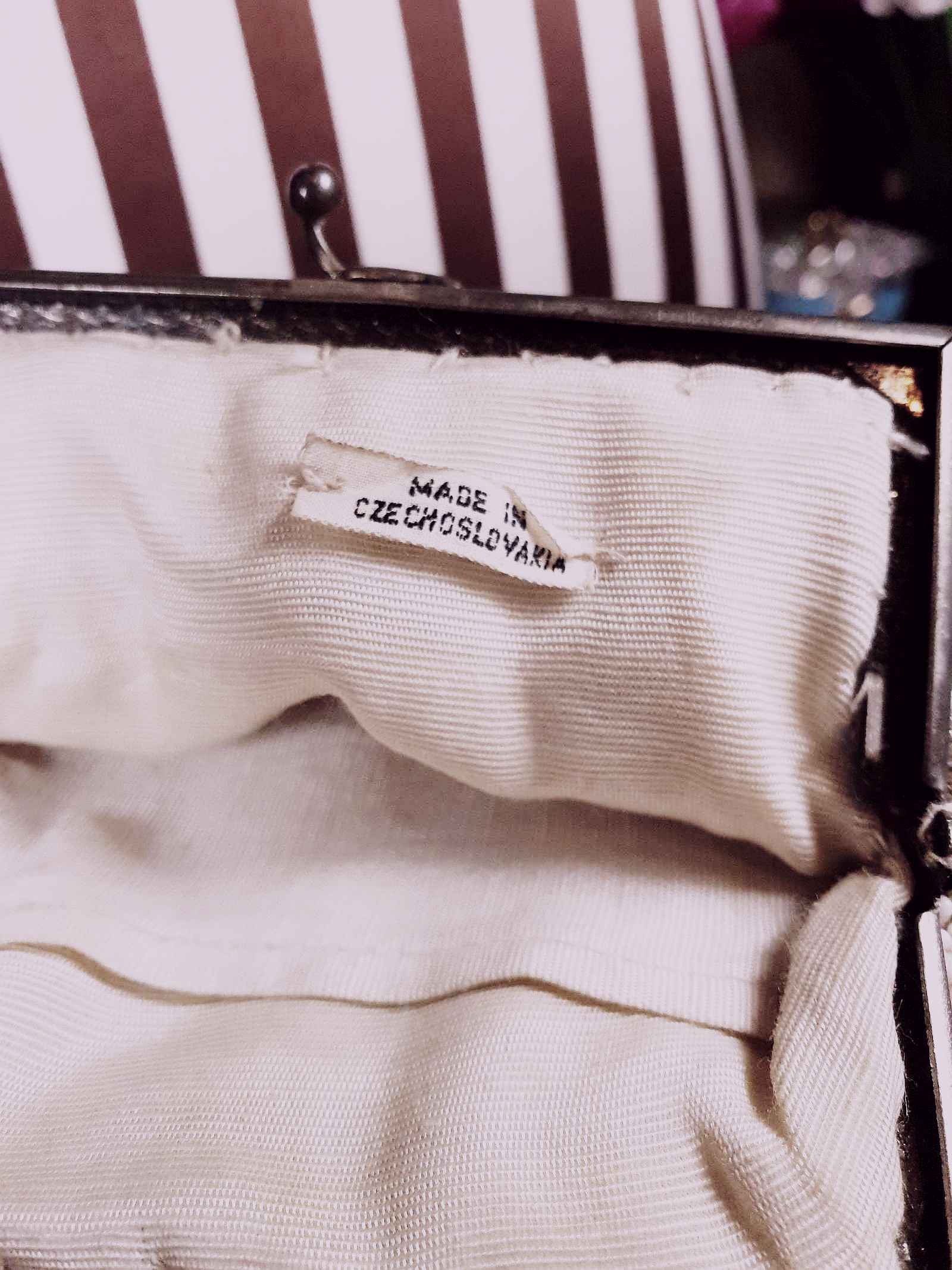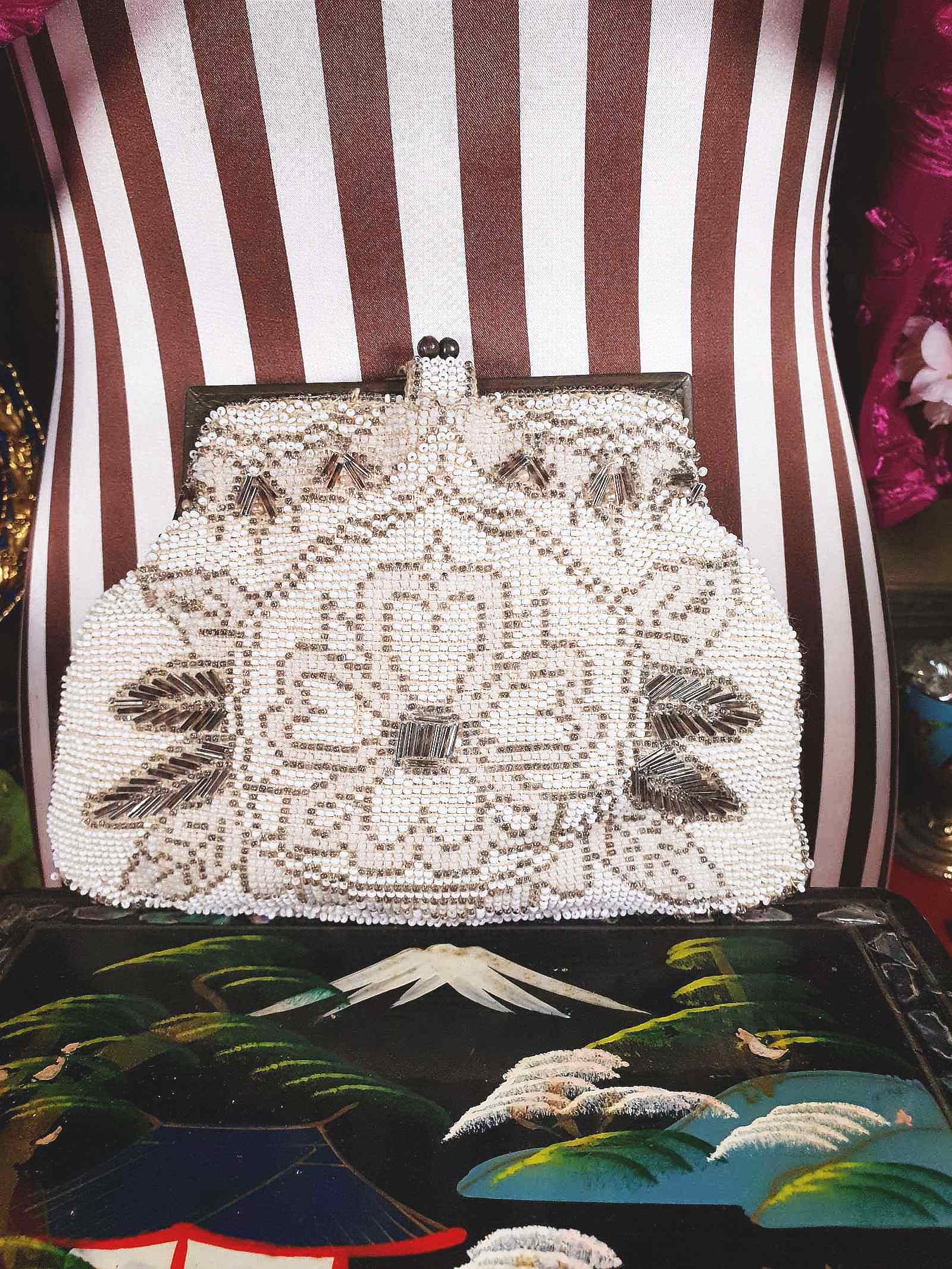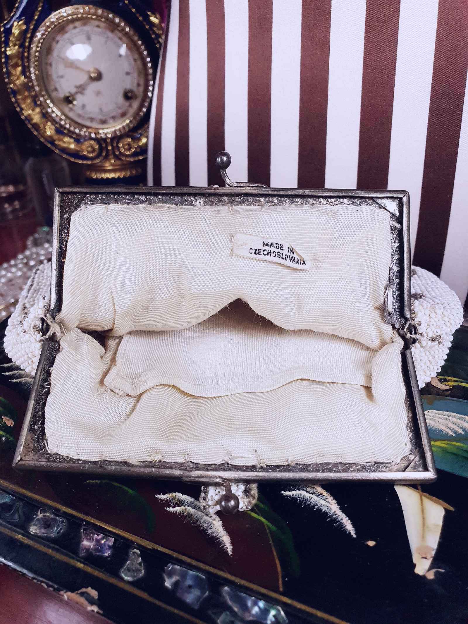 A beautiful hand-sewn Art Deco beaded clutch bag from 1930s Czechoslovakia. Featuring a leaf and flower pattern consisting of tiny cream beads and grey-brown tubular beads. The metal frame has a beautiful patina. Twist clasp fastening. Internally the bag is lined with cream satin and houses a small slip pocket.