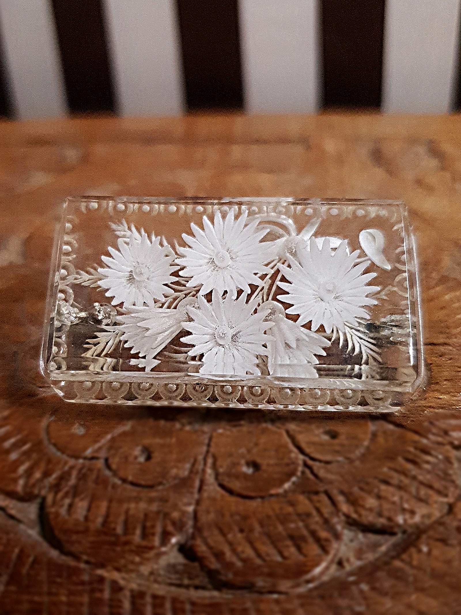 Beautifully crafted in the 1930s, this vintage oblong lucite brooch is a stunning Art Deco piece. The clear Lucite is expertly reverse carved for a 3D floral effect, showcasing a bouquet of beautiful flowers and leaves. Carved circle bevelled edge feature. Complete with a secure trombone clasp pin, this brooch is a delightful addition to any collection.