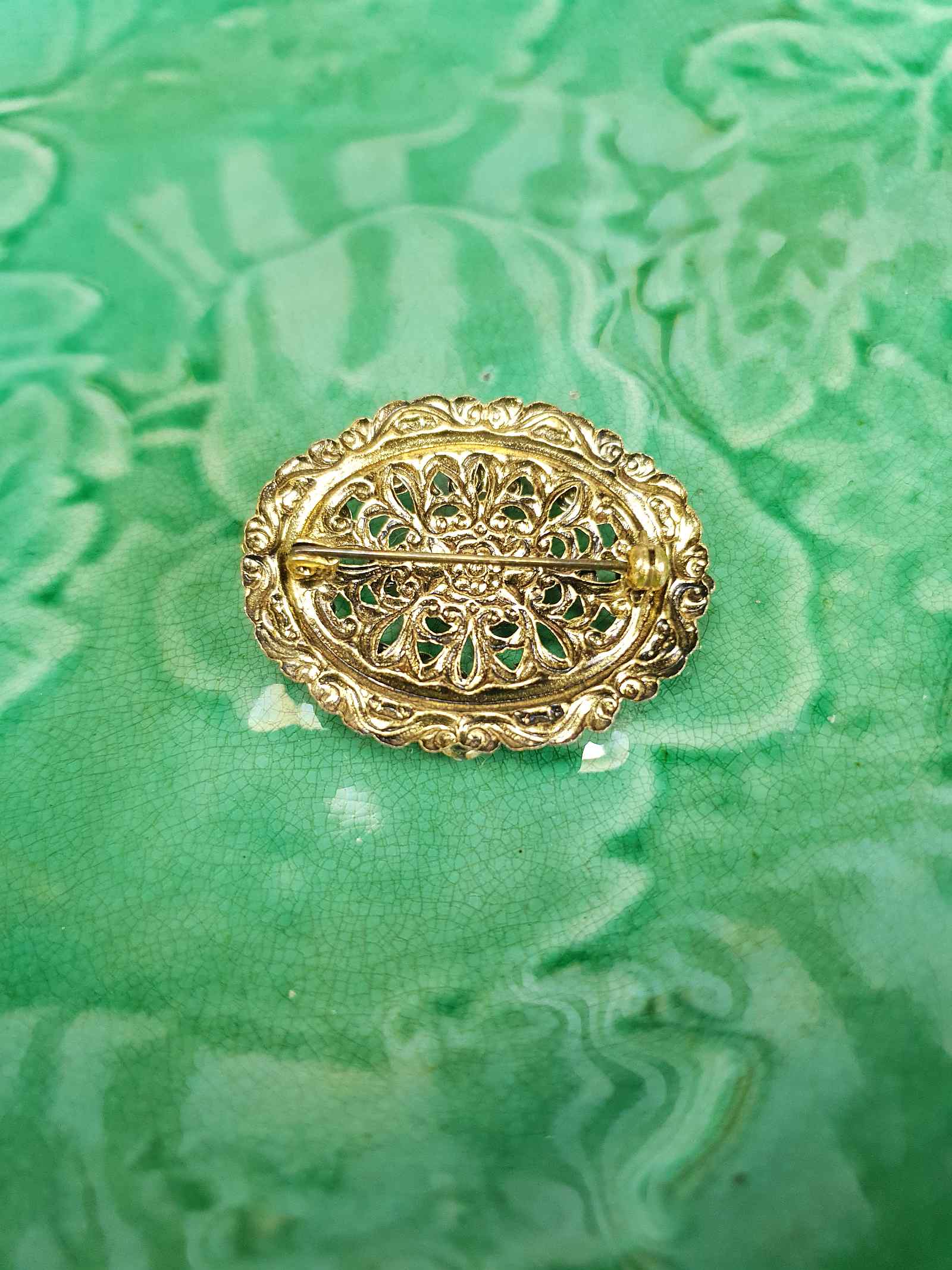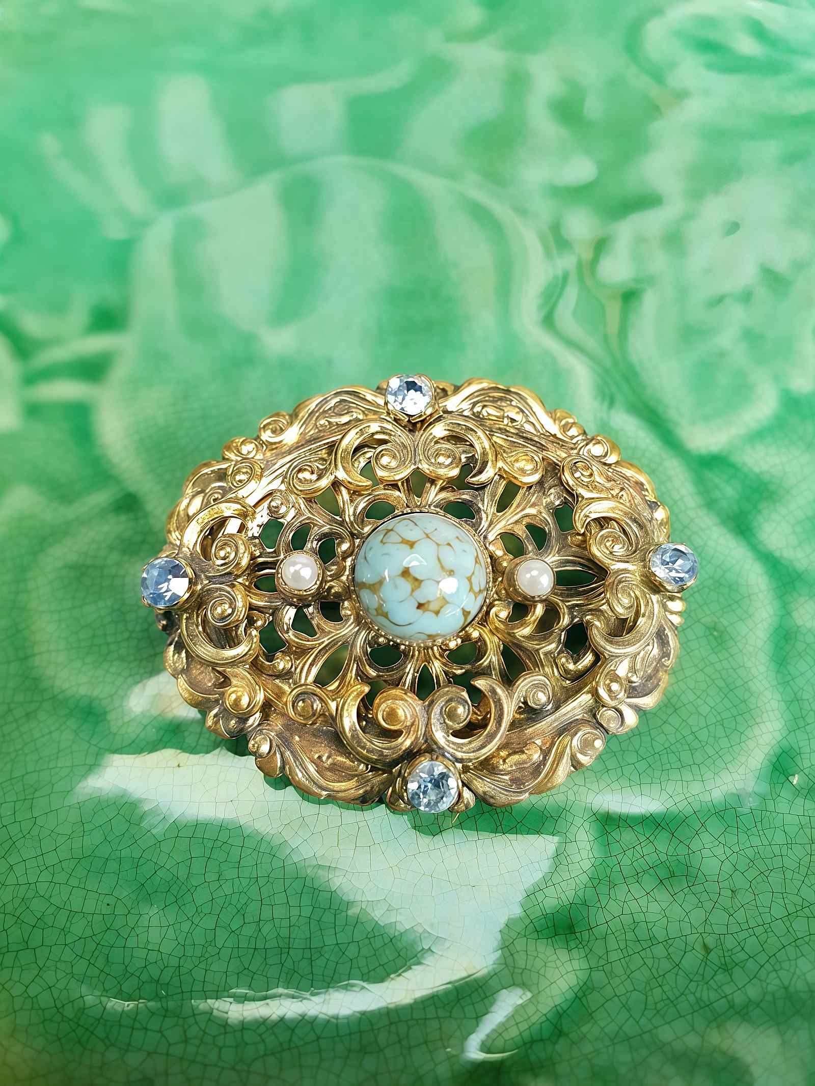Exquisite vintage 40s Czech brooch featuring an ornate filigree brass setting with an oval silhouette. The centrepiece showcases a beautiful pale blue marble cabochon glass stone, complemented by two dainty white seed pearls and four prong-set palest blue glass rhinestones. A timeless piece that captures the elegance and craftsmanship of vintage jewellery design.