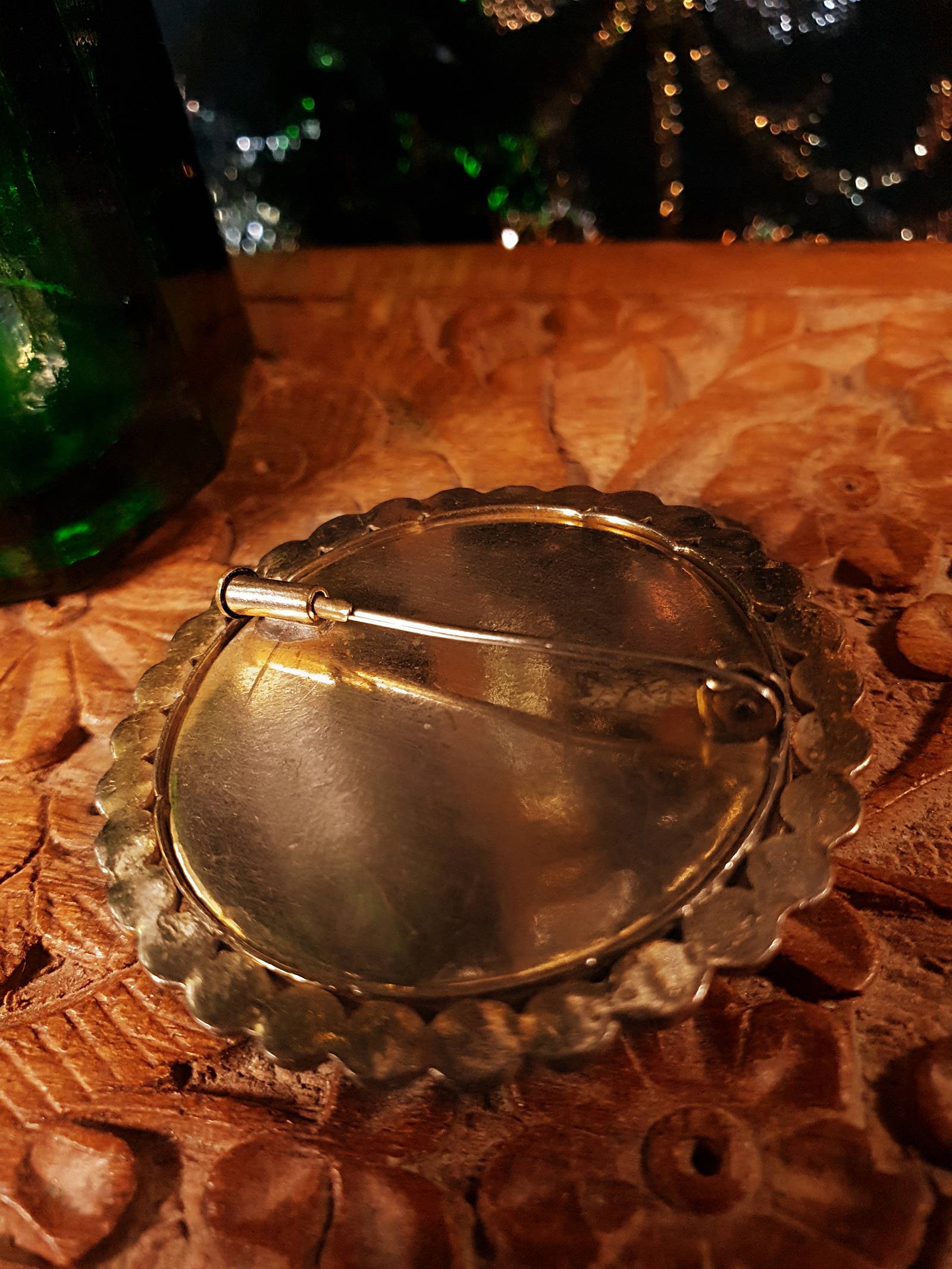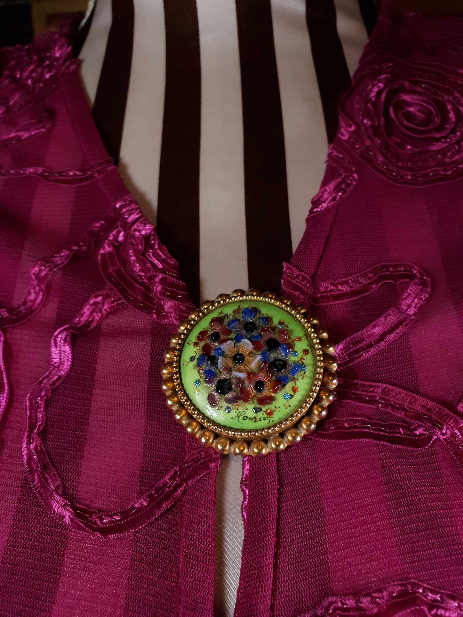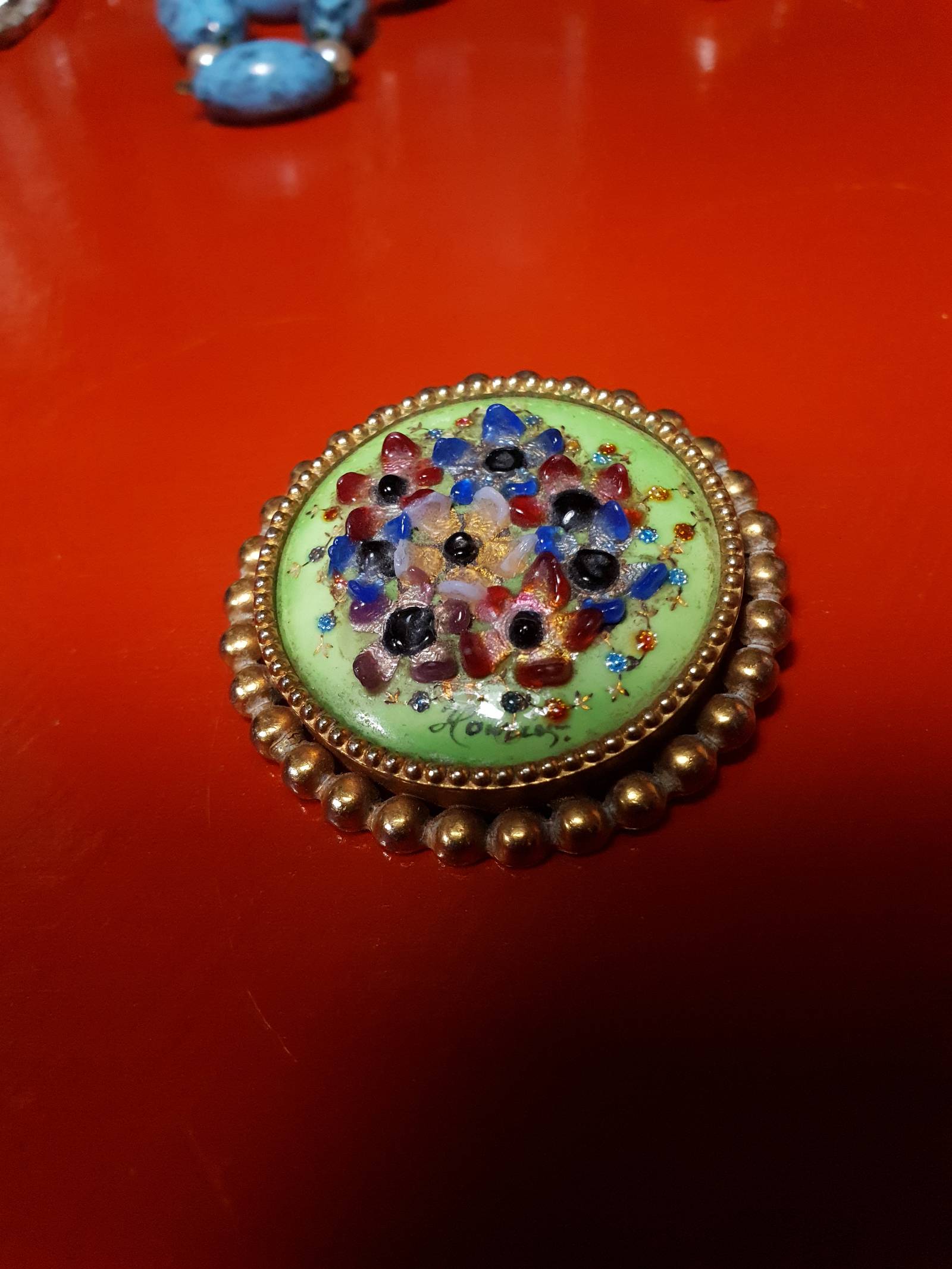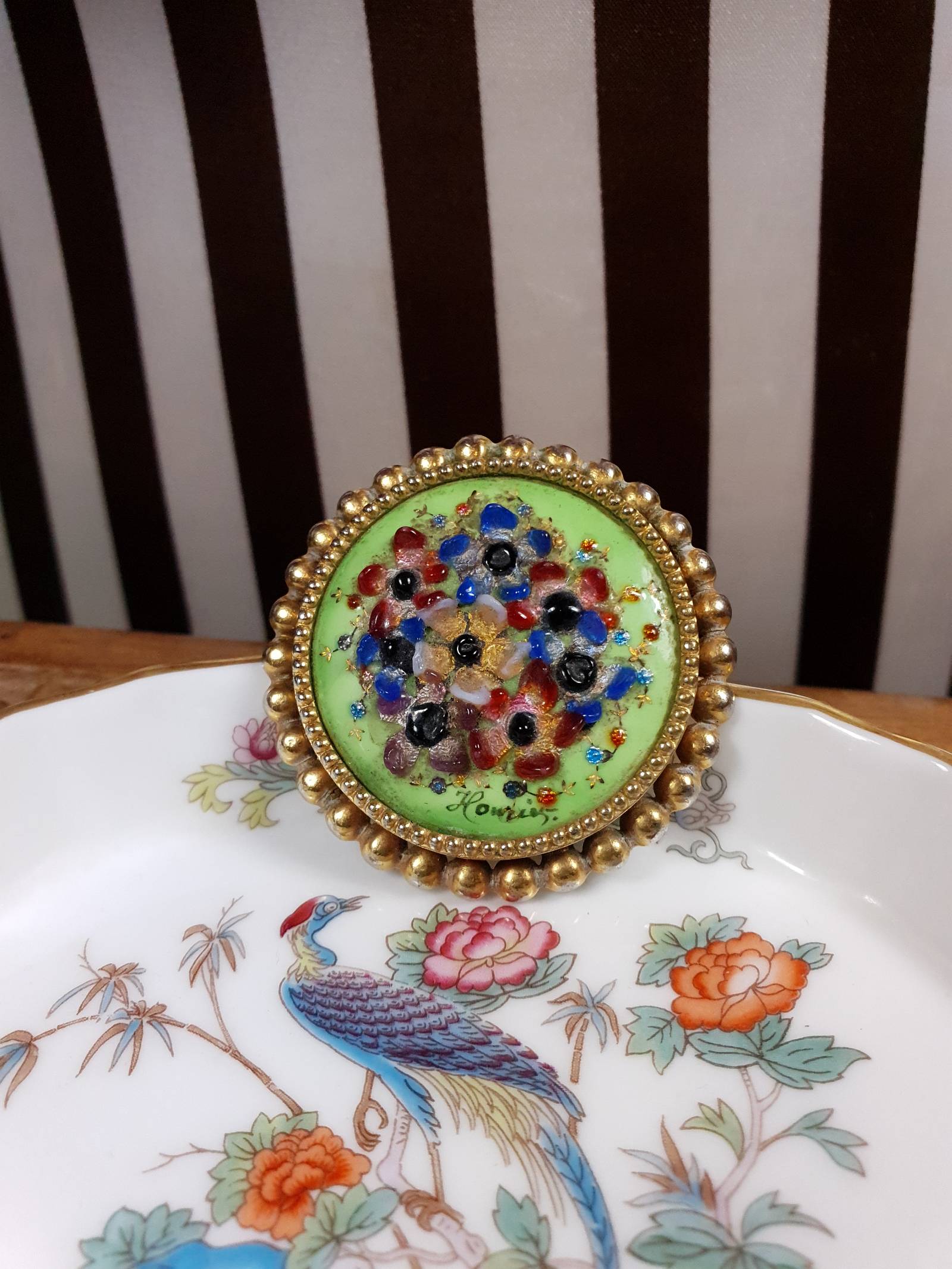 This charming and rare vintage 40s floral brooch has been beautifully crafted with handmade glass flowers in hues of red, white, and blue, accented with gold and sprigs of tiny flowers, and adorn a round pale green ceramic base, all encircled by ornate gold-tone metal. Trombone clasp fastening. Signed by artist.