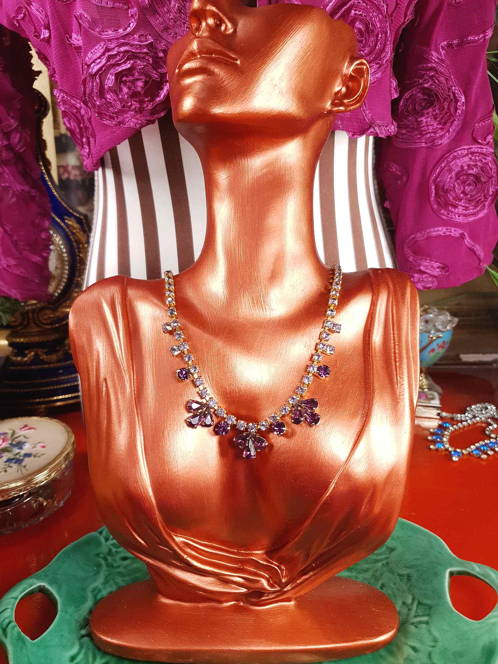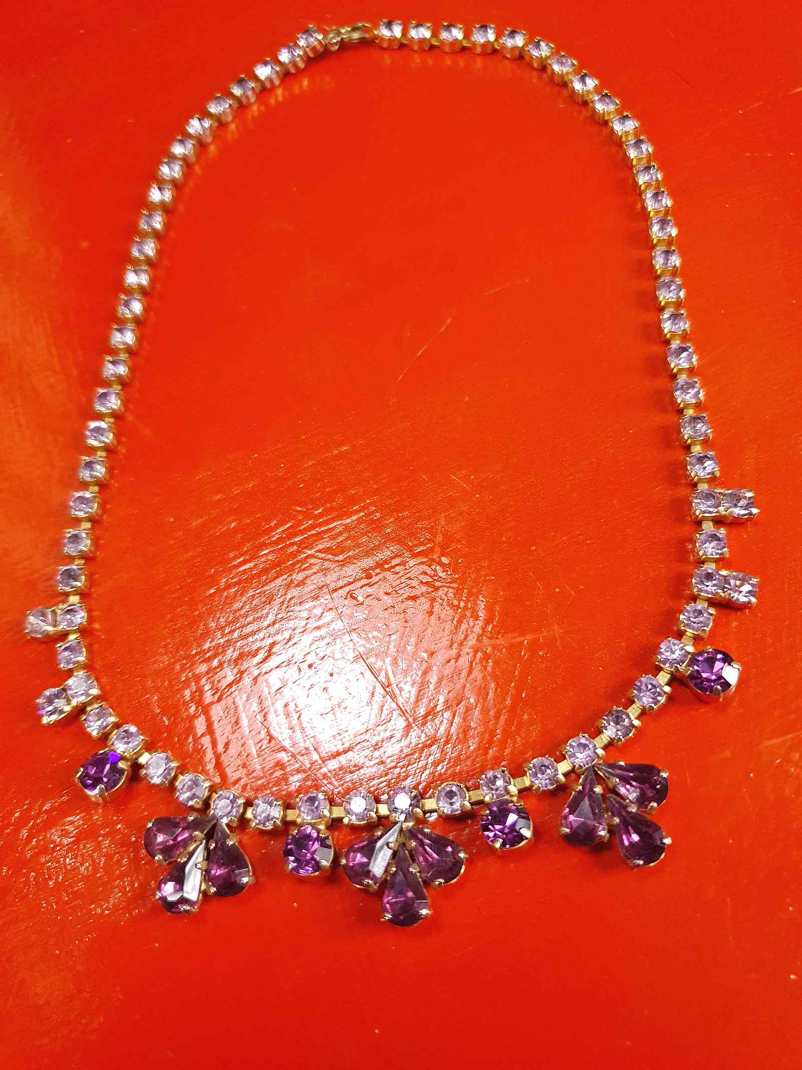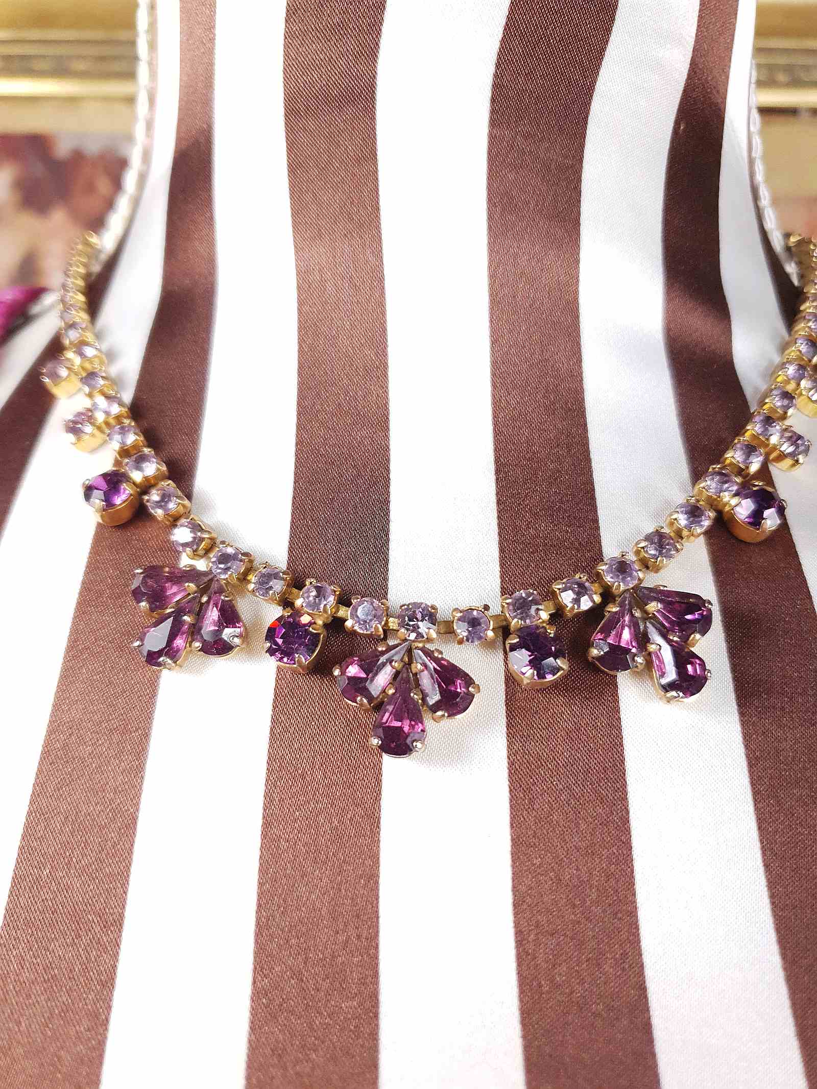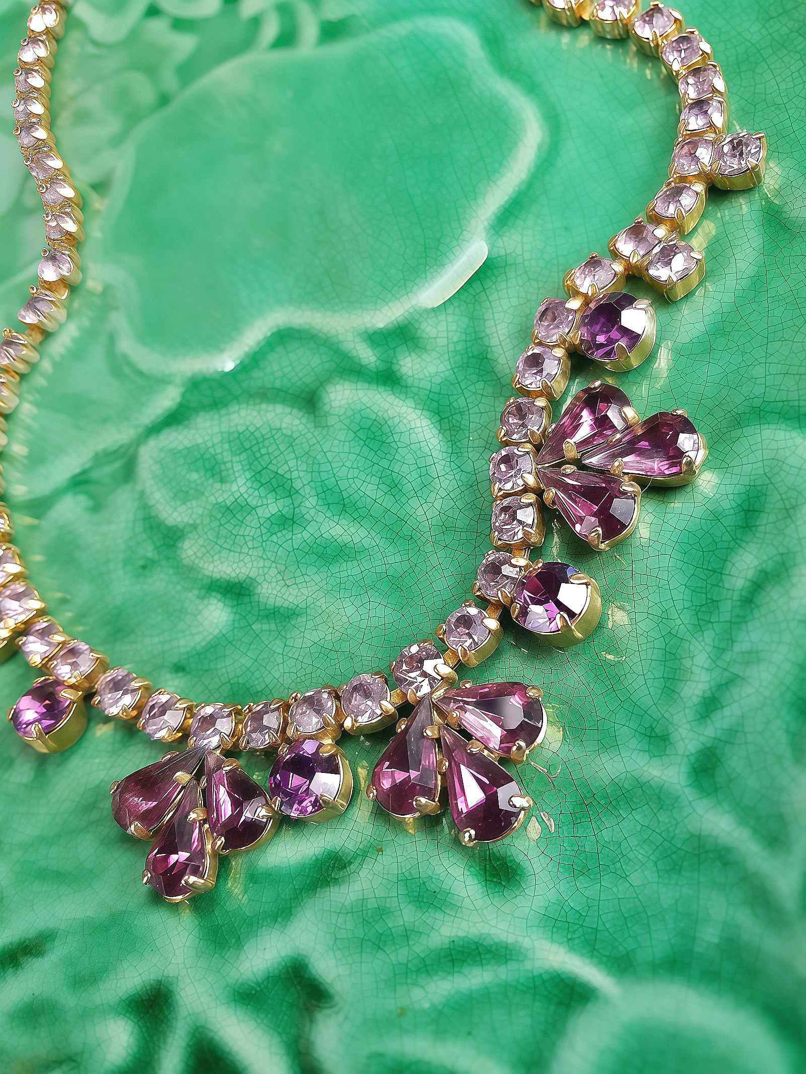 This beautifully sparkly vintage 40s rhinestone necklace features teardrop-shaped purple plum glass rhinestones paired with delicate lilac round-cut stones. Each piece is expertly prong-set in warm gold-tone metal. A timeless accessory that captures the glamour of the 1940s era.