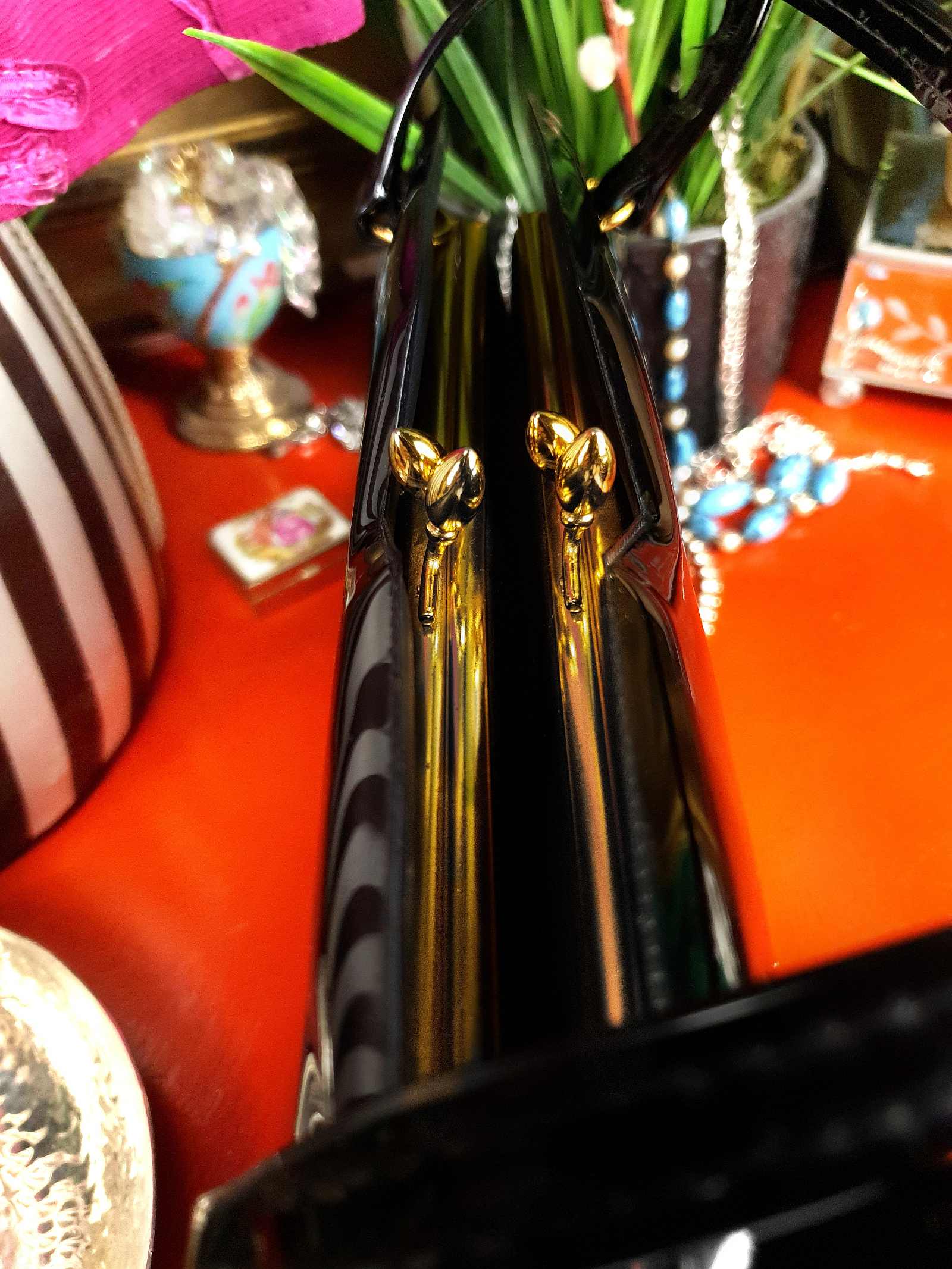 A striking 50s mid-century patent leather tote featuring dual twist-lock compartments for secure storage. The lustrous black finish pairs beautifully with a soft black fabric lining, delivering both vintage charm and practical organisation in one timeless accessory.