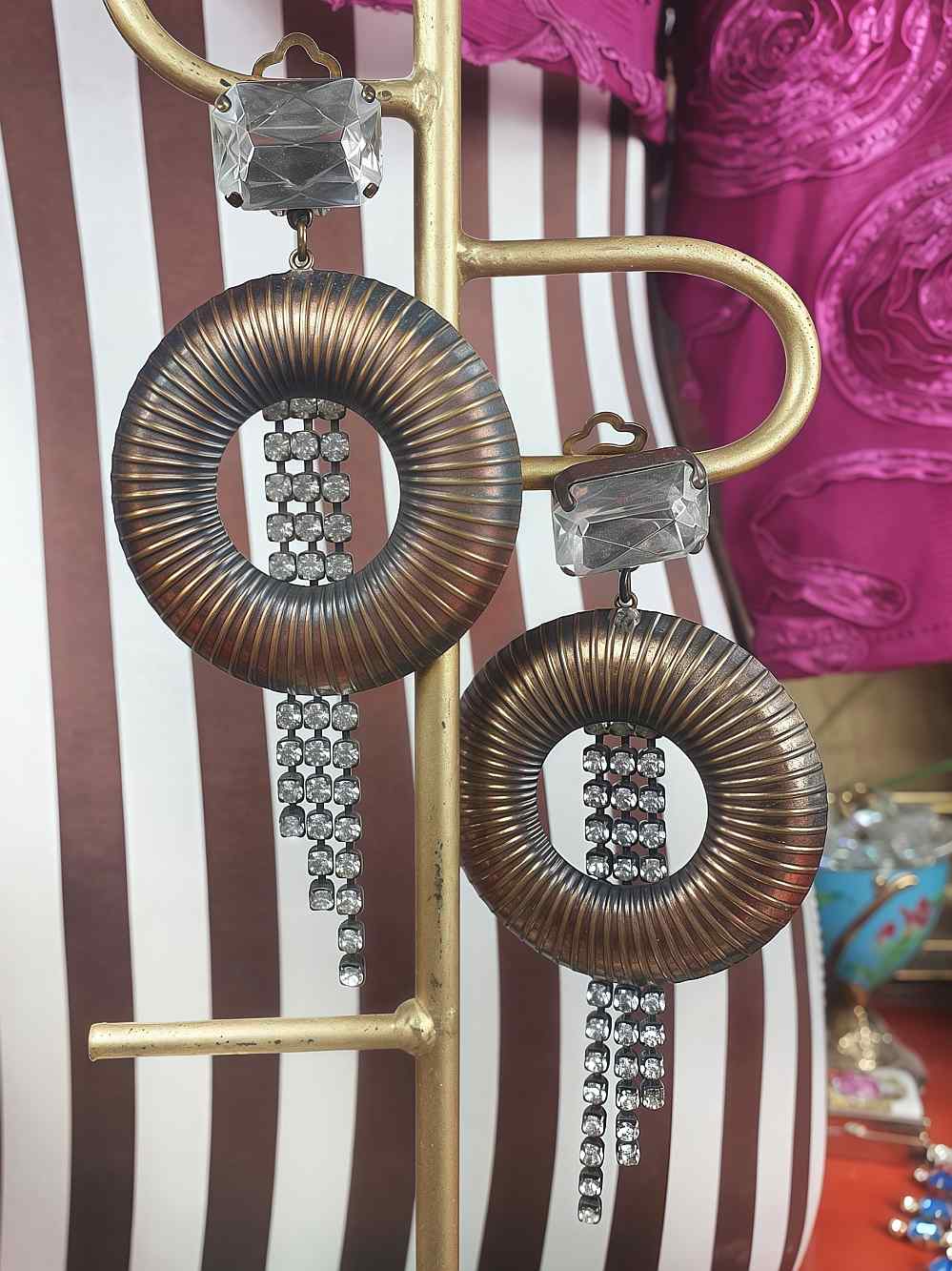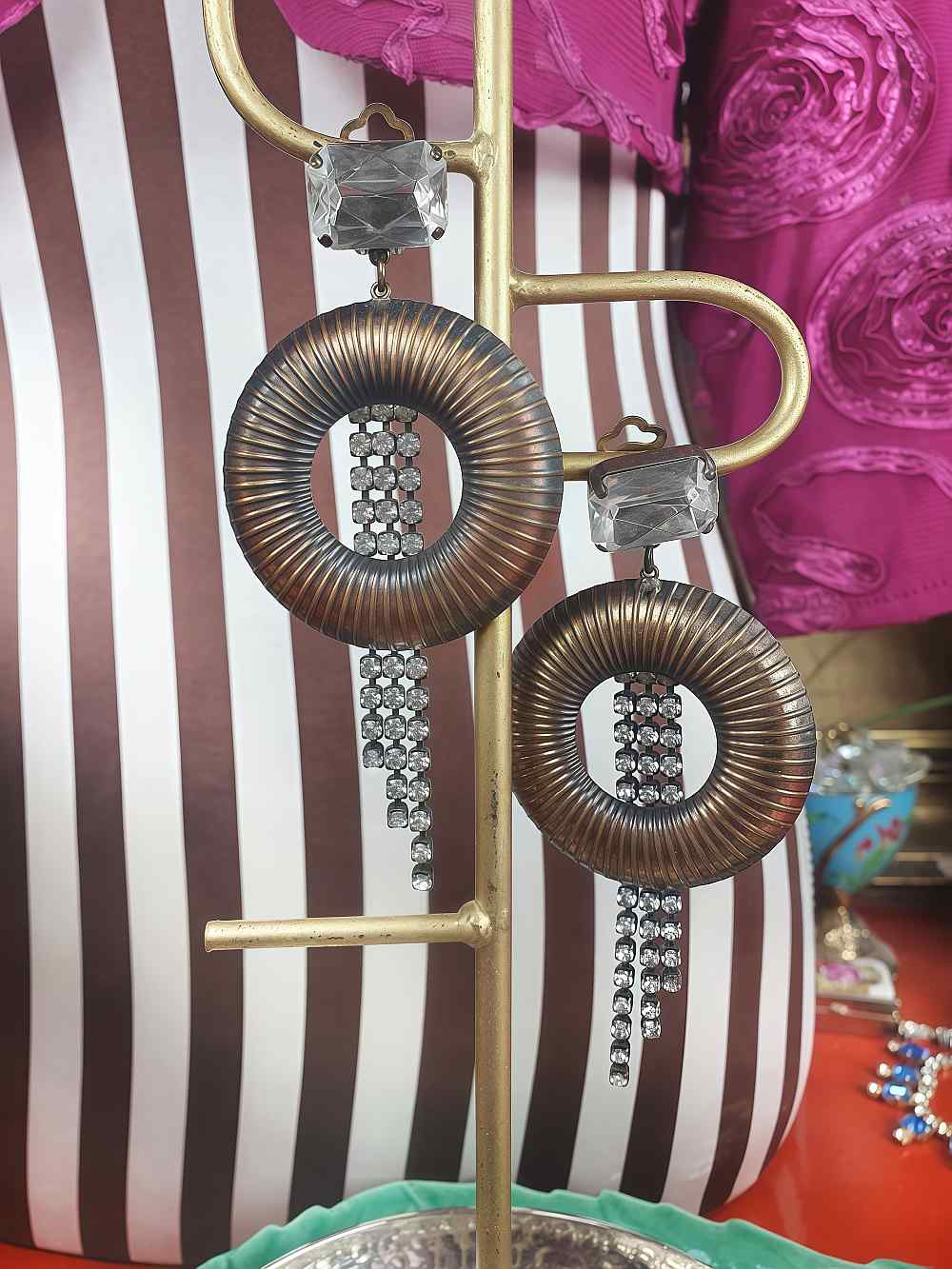 Elegant vintage 50s clip-on earrings featuring a brass coppery ribbed circle with cascading clear glass rhinestone graduating drops and a prong-set large resin cushion-cut rhinestone. Vintage glamour with timeless sparkle.