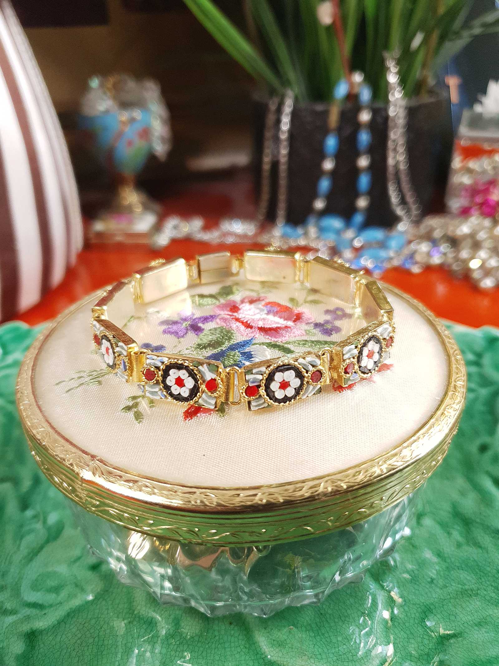 Vintage 1950s Italian Venetian Glass Micro Mosaic Bracelet – Red & White Daisy