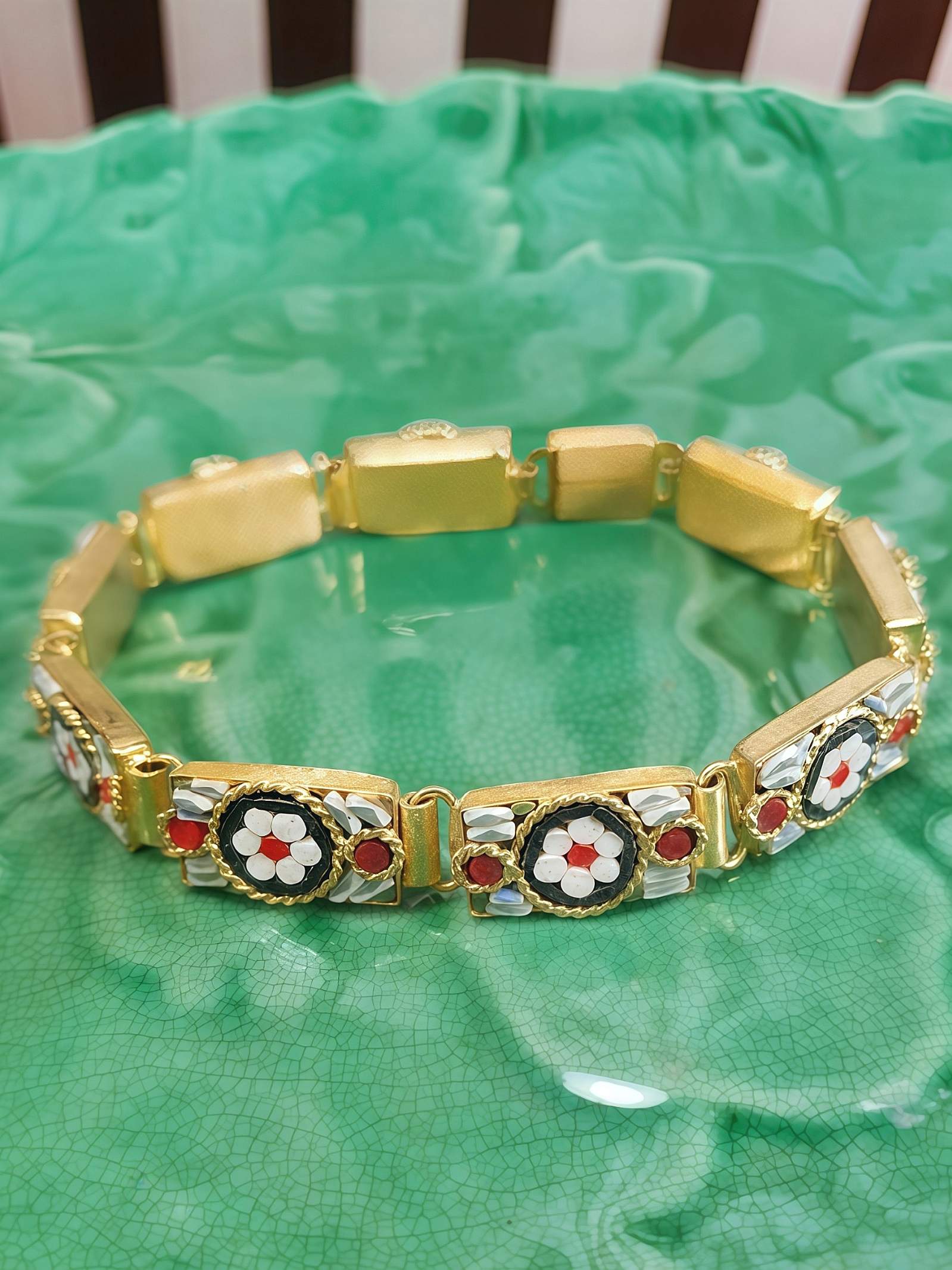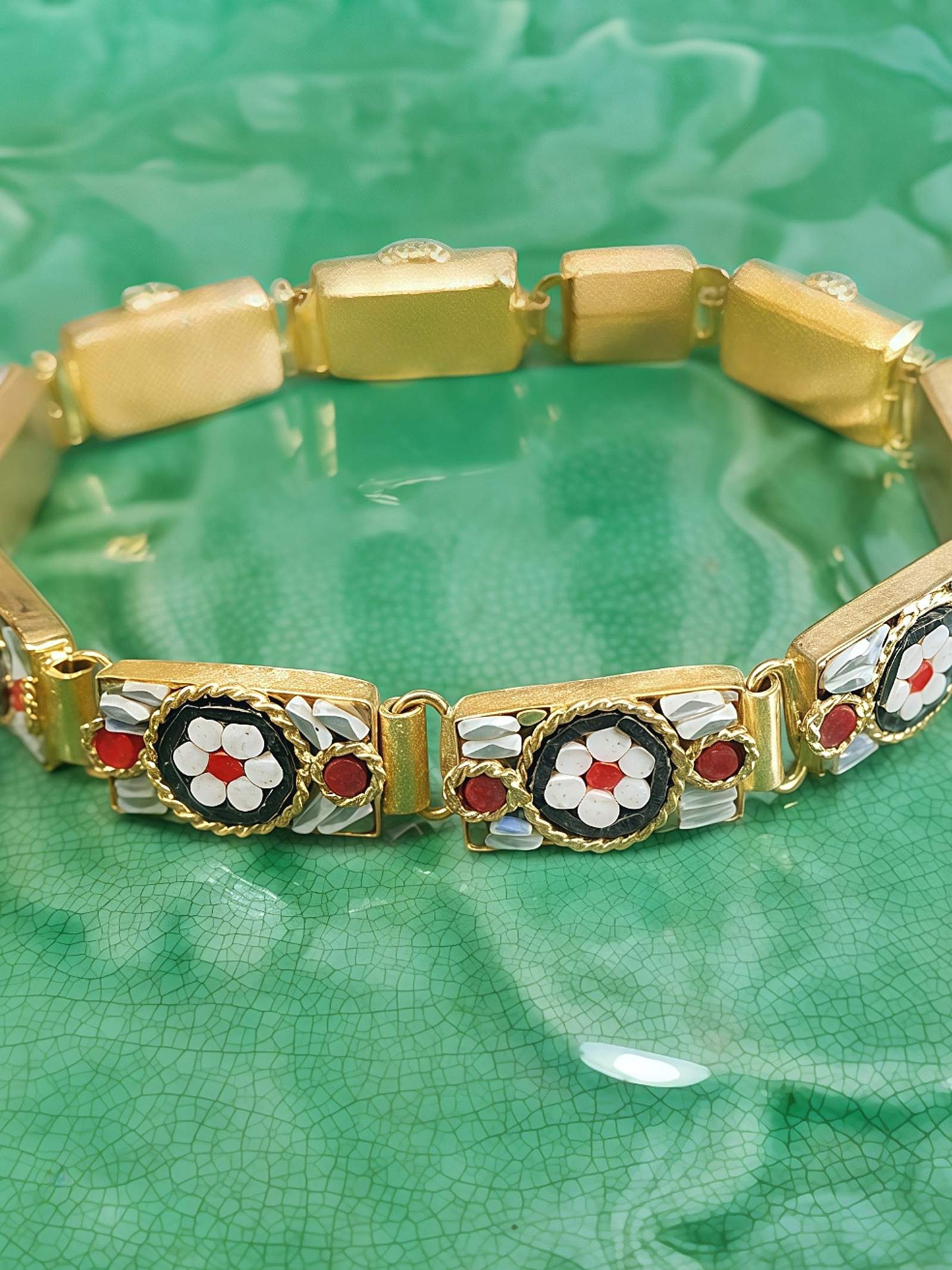 Exquisite 1950s Italian Venetian glass micro mosaic bracelet featuring bright gold-tone metal links with panels adorned with hand-set glass smalti tesserae. The beautiful white daisy motif showcases coral-red centres on a base of black and framed by delicate rope-twist borders, with blue accents. A quintessential example of traditional Venetian craftsmanship. A timeless statement piece for vintage jewellery collectors.