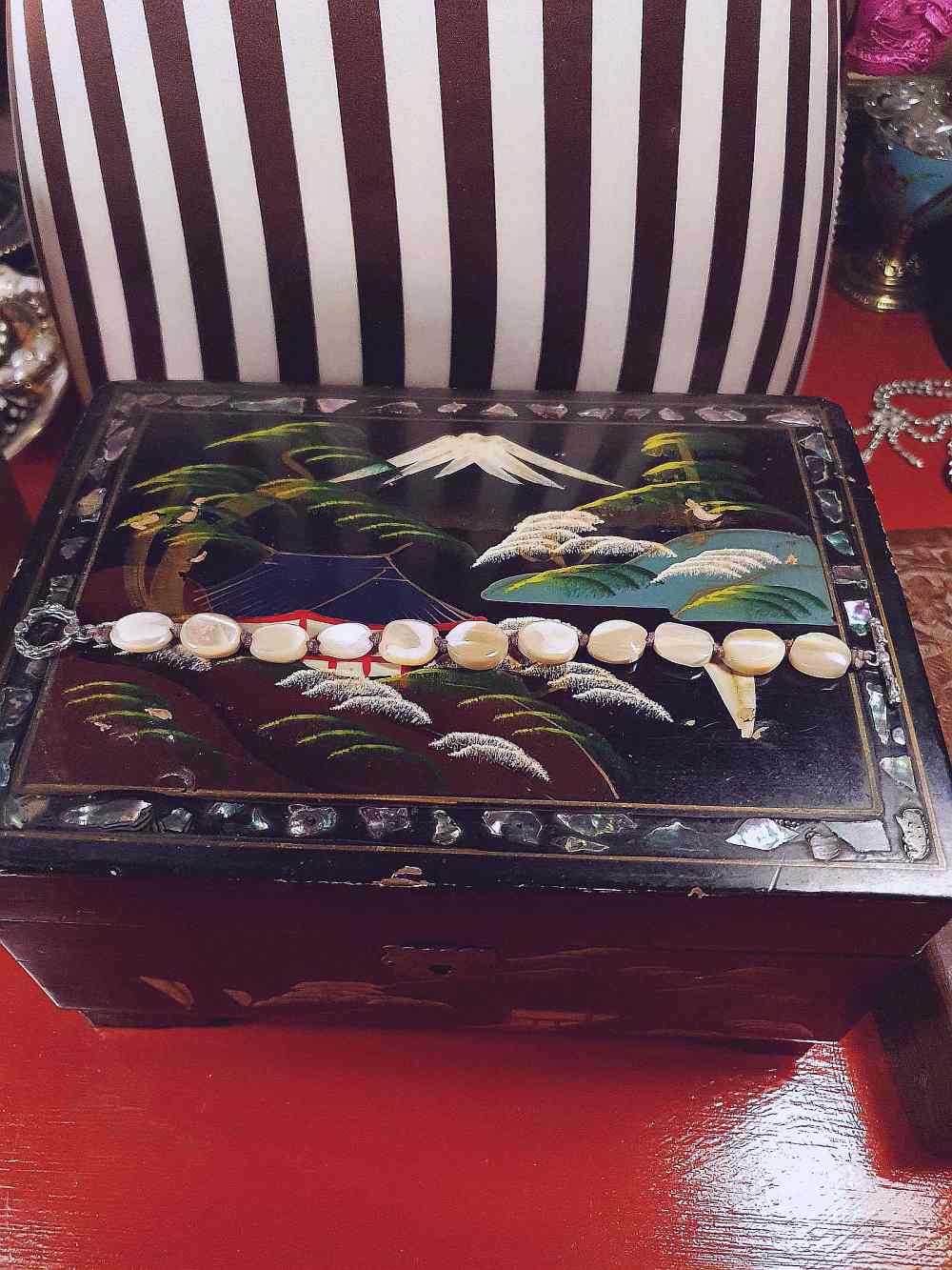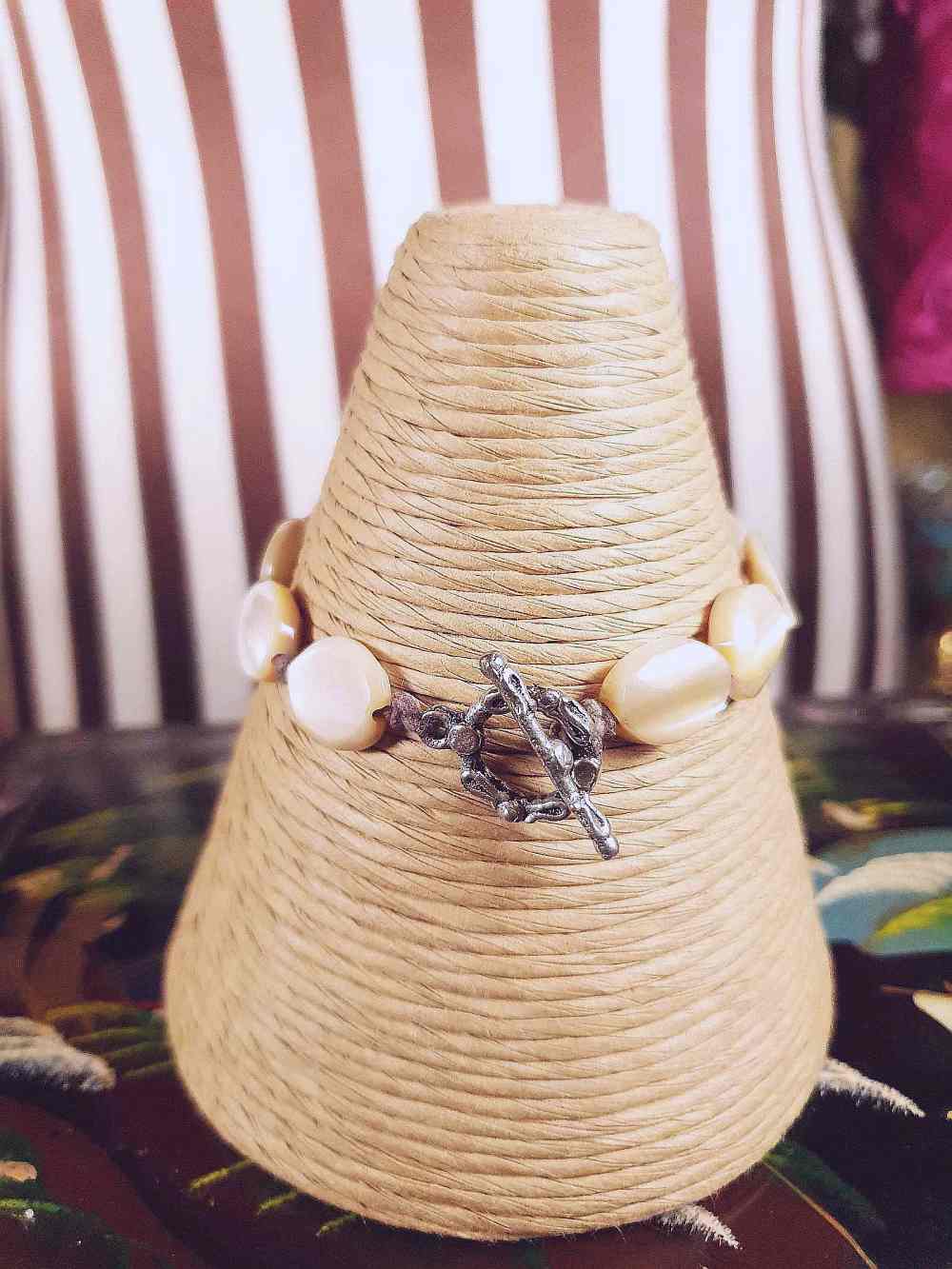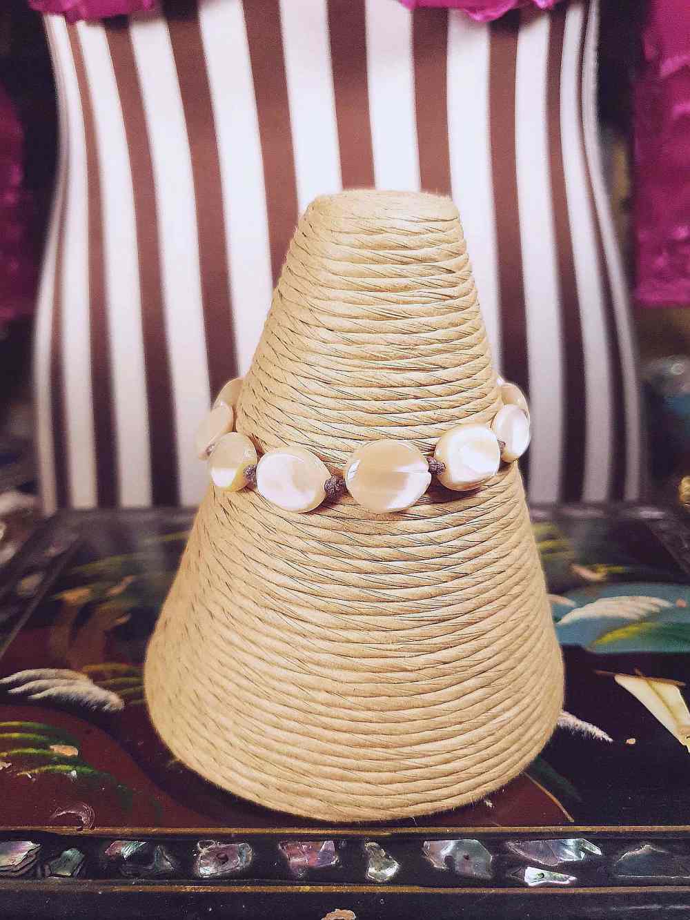 Vintage 50s mother-of-pearl bracelet featuring iridescent creamy sand hued oval-shaped beads. The luminous beads catch the light beautifully and are strung on its original brown cord. Finished with a secure ornate crafted silver-tone metal toggle clasp.